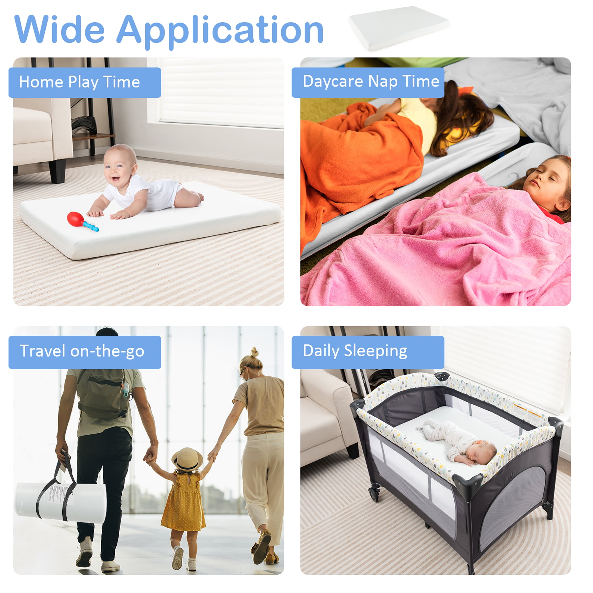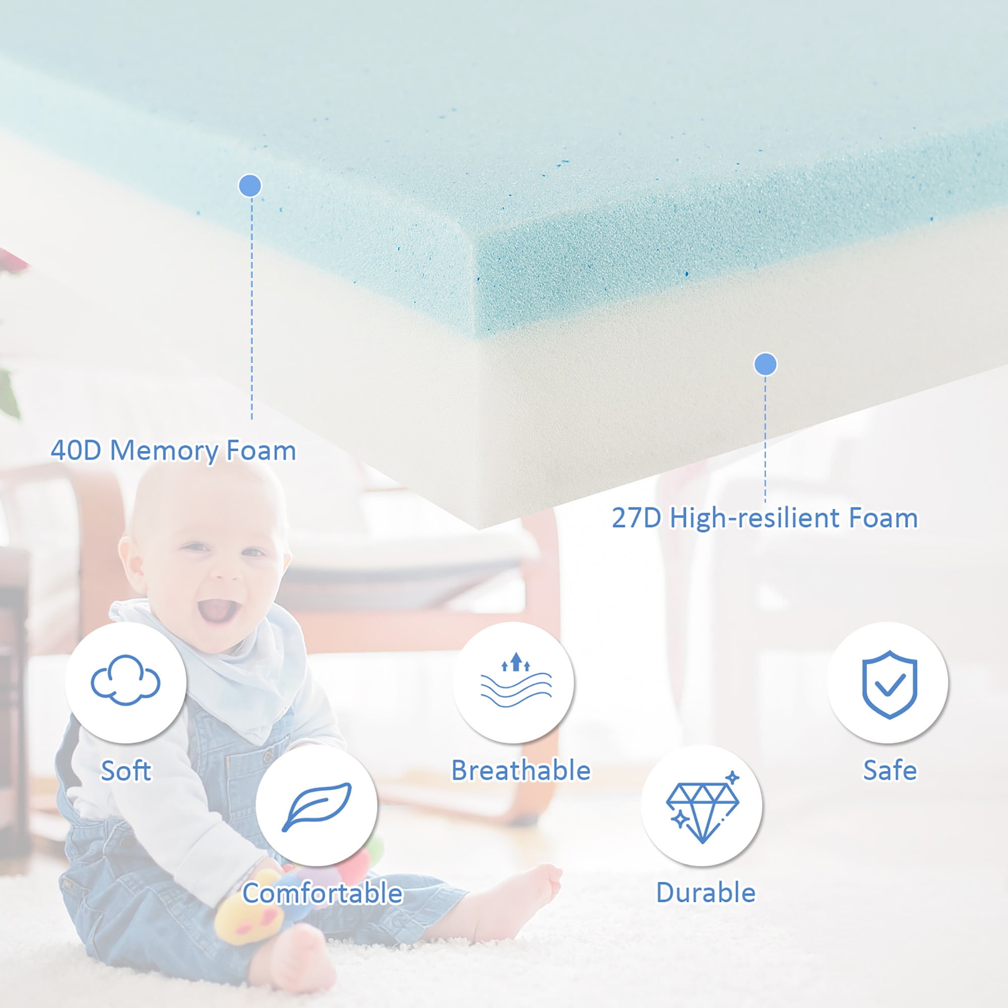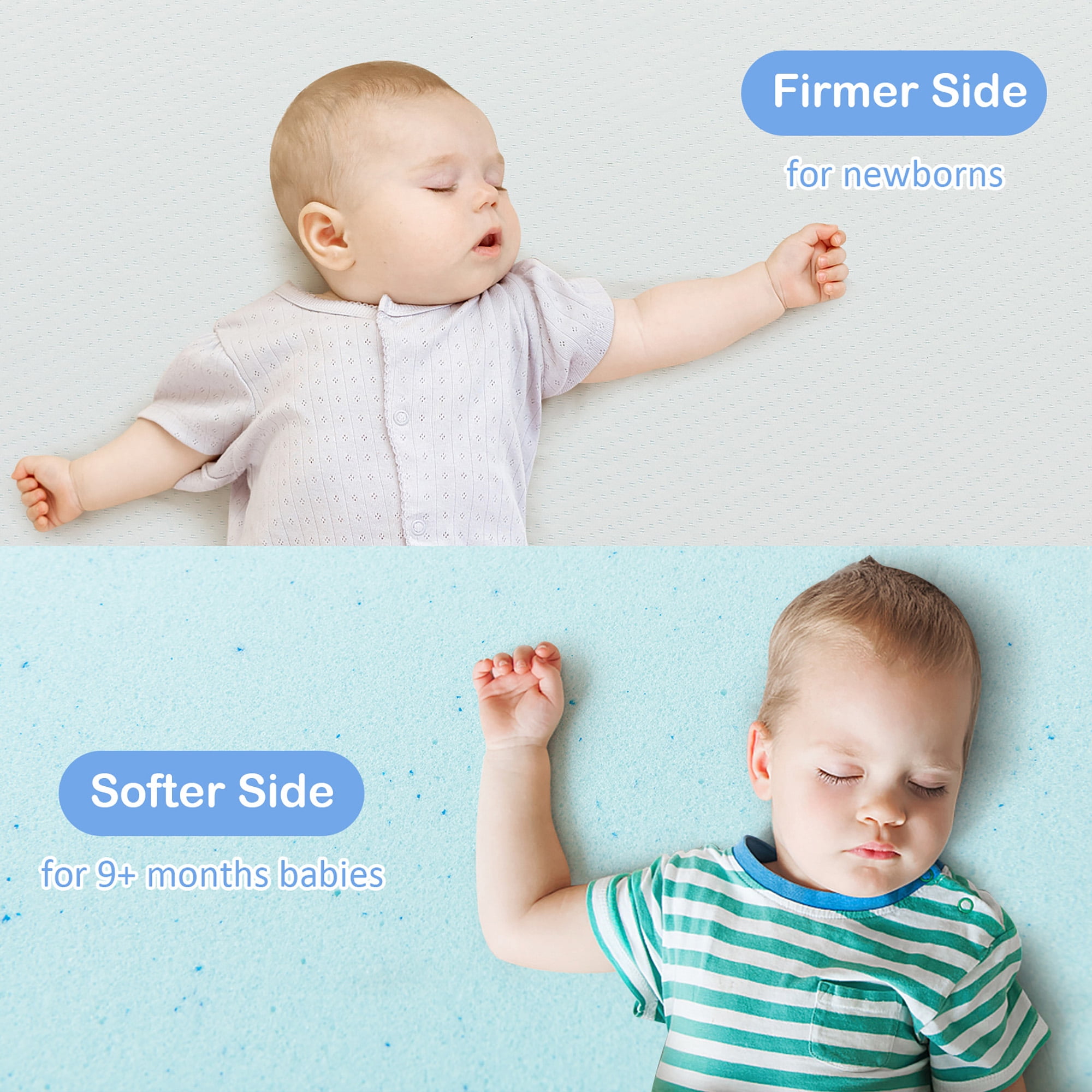 Dual Sided Mattress: Featuring different firmness levels, the dual-sided mattress is suitable for various growth stages. The firmer side is perfect for newborns to protect spinal development, and the softer side is ideal for 9+ months babies for superior comfort. Sleep in Comfort: Consisting of 40D memory foam and 27D high-resilient foam, the playard pad is soft, breathable and gives babies comfortable support. Furthermore, the extra gel-infused filling brings cooler feeling and promotes comfort. Snug Fitted Design: The crib mattress fits corner and brings no edge gap, avoiding the risk of unsafe spaces or lost items, and making it secure for baby to sleep in. Moreover, the 38” x 26” baby mattress fits most standard full-size cribs and toddler beds. Removable Cover: The polyester covercomes with smooth zipper, and is removable and machine washable, ensuring easy maintenance. Besides, the dryer safe design brings more convenience. Wide Application: The baby playpen mattress pad is suitable for home play time, daycare nap time, daily sleeping and more occasions to meet various needs. In addition, you can take the portable toddler mattress for travel on-the-go.