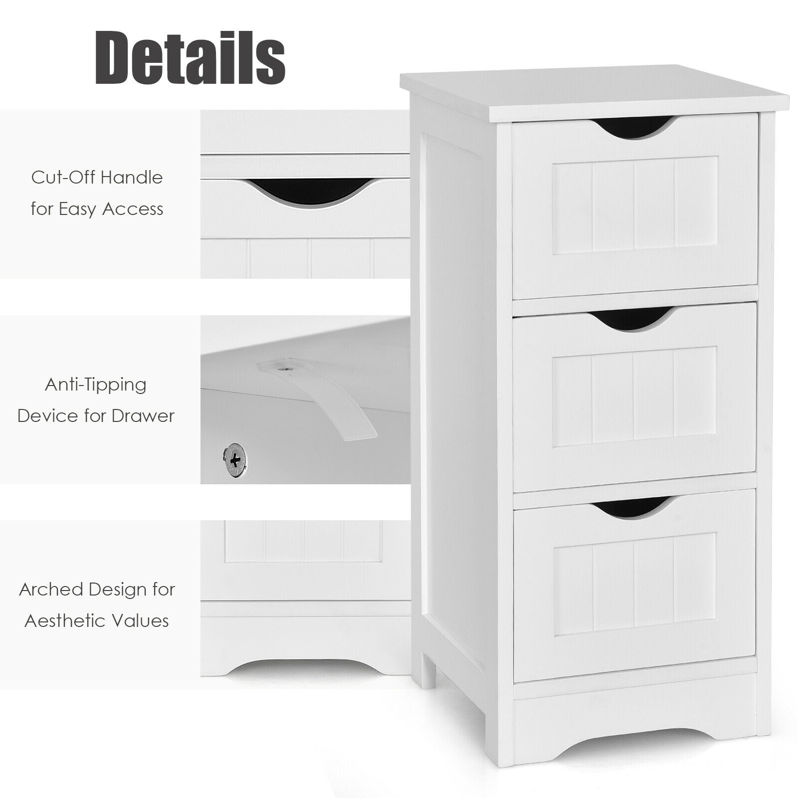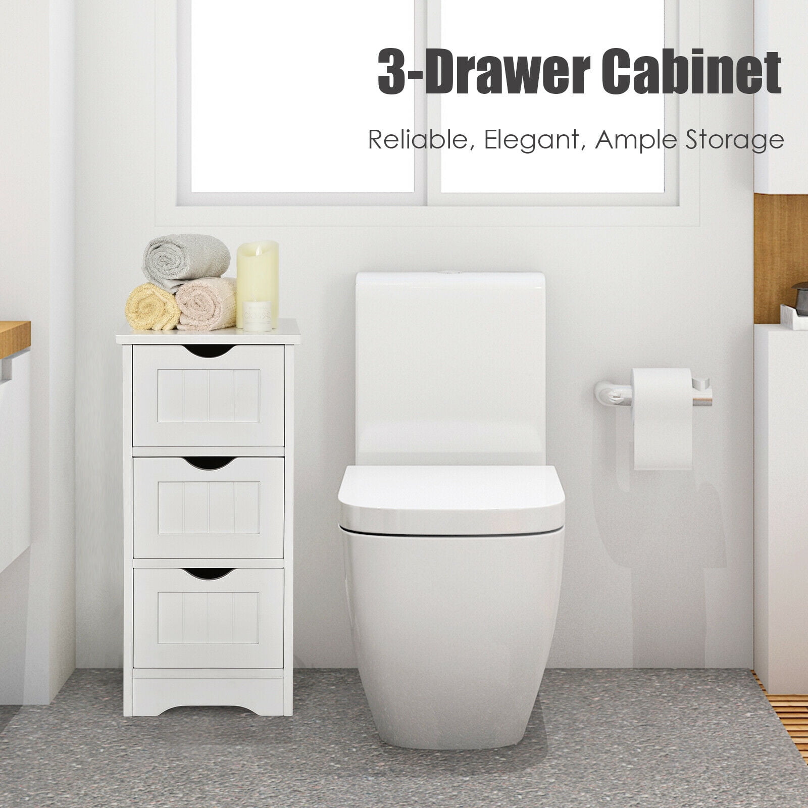 Description: Modern white bathroom floor cabinet will offer an elegant & comfortable look to your home decor. This great cabinet provides 3 large drawers for plenty of storage space which is space saving for your daily organization. And the well-made wooden frame along with eco-friendly varnish provides strong stability and sturdiness, the healthy finish is waterproof, mildew-resistant and wear-resistant that will do no harm to our body. Look no further, this floor cabinet will be a perfect choice for you, no more waiting! Features: Stable & sturdy wood construction Comfortable modern white wood style Painted with eco-friendly varnish Waterproof & mildew-resistant finish Smooth drawer slide Large drawers offer plenty storage space Practical table top to put the table lamps, photo frame, and other things Specification: Color: White Material: MDF Product Dimension: 12” x 12” x 25” (L x W x H) Drawer Inner Dimension: 10” x 9” x 6” (L x W x H) Weight Capacity of the Top: 11lbs Weight Capacity of the Drawers: 11 lbs Net Weight:22 lbs Package Includes: 1 x Bathroom Floor Cabinet 1 x Instruction