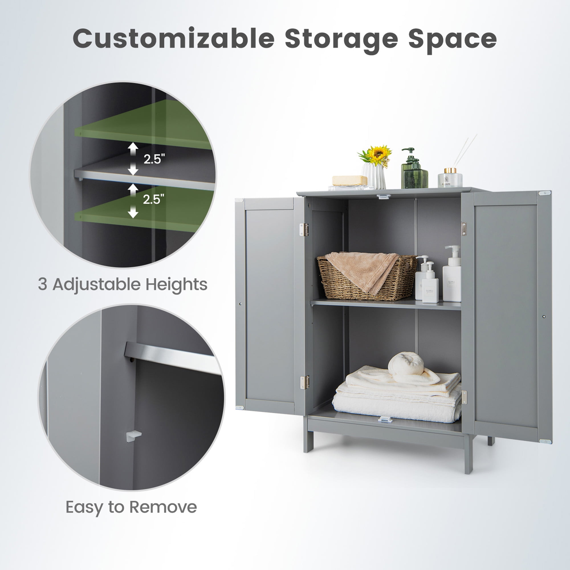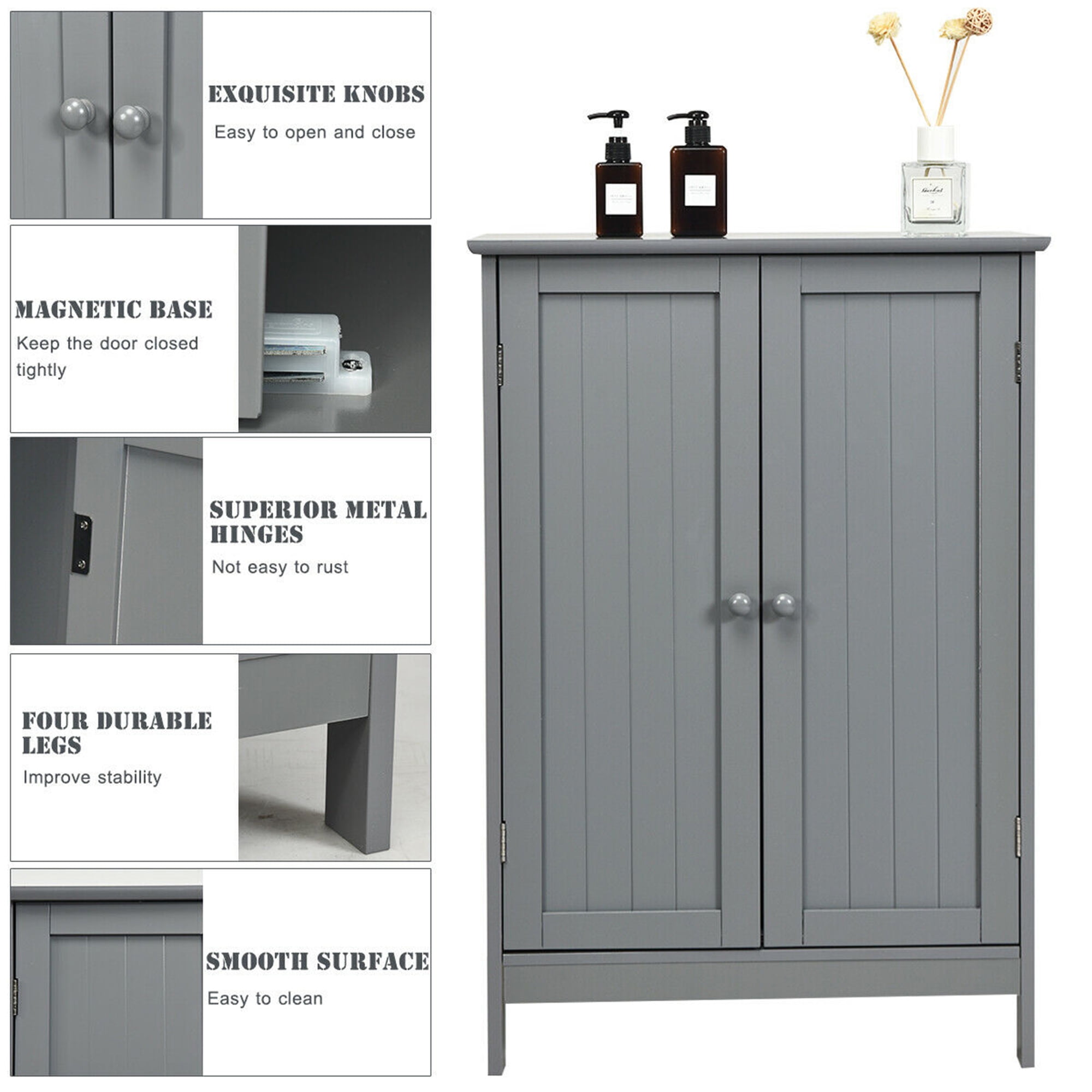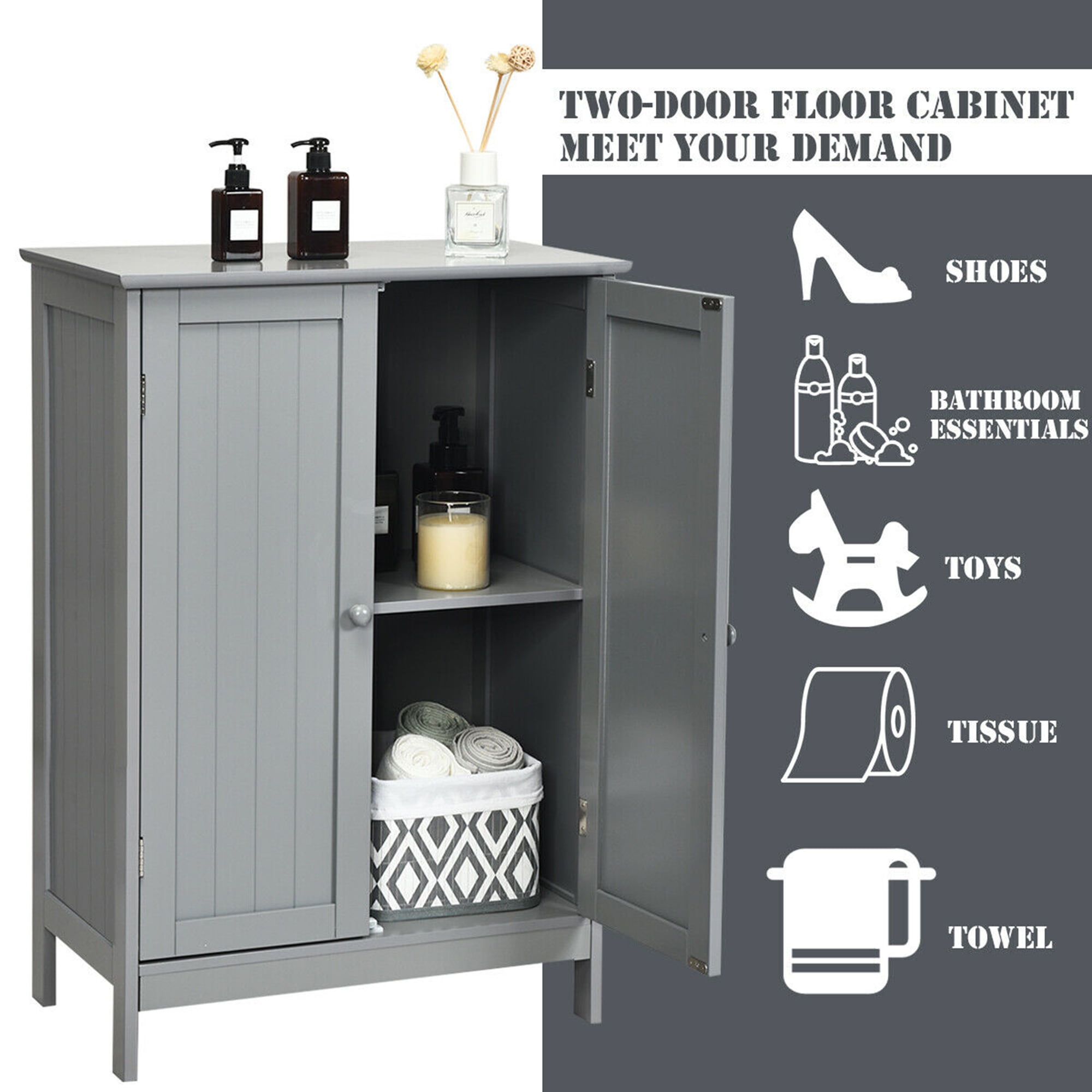 Gymax Bathroom Floor Storage Cabinet Double Door Kitchen Cupboard Shoe Cabinet Grey