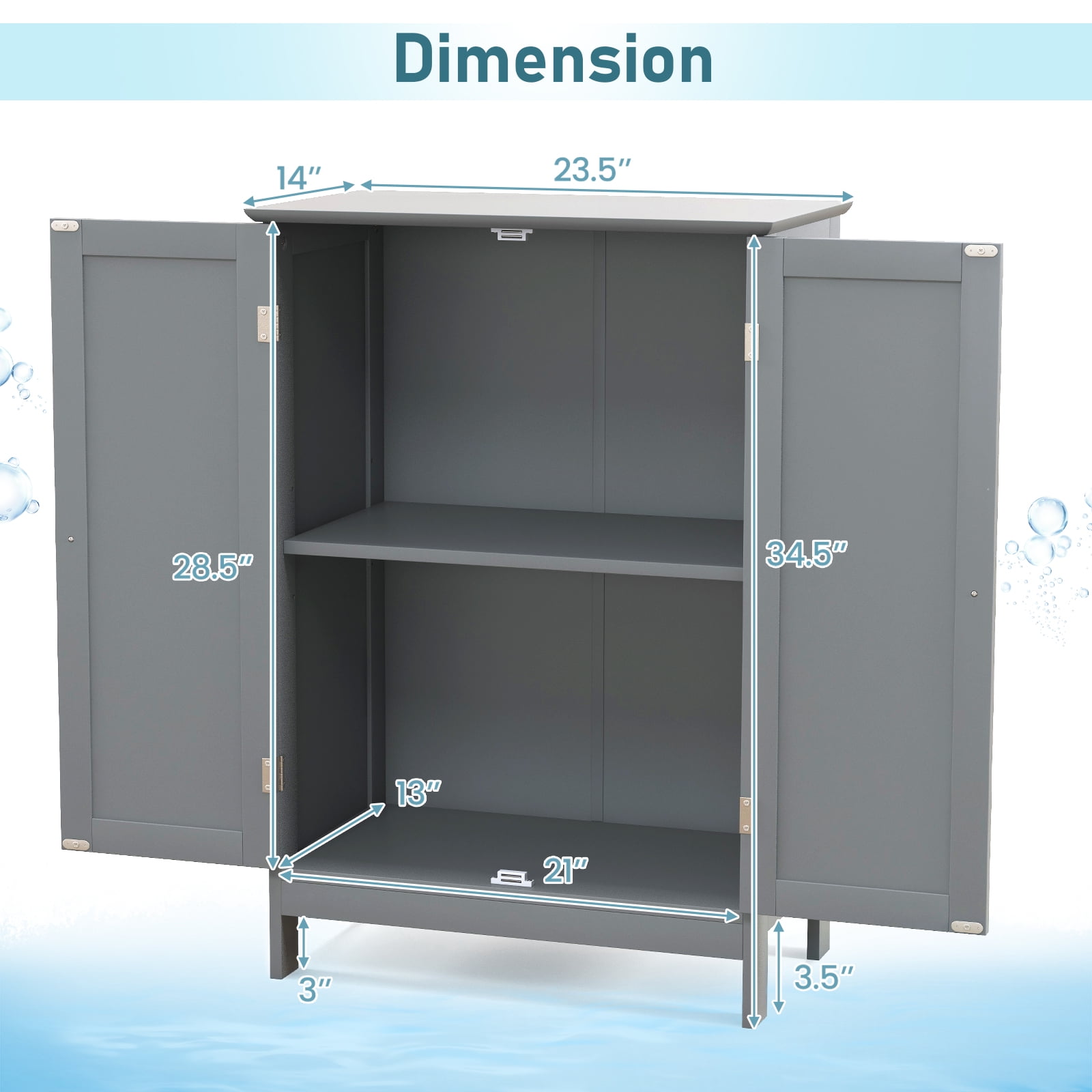 Description: Designed for keeping your room organized in style,this elegant bathroom cabinet features a capacious storage room,which has double door cutting off space. With 2 layers space for meeting different kinds of objects,you can place your personal toiletries in it . And the available room can also keep other thing in order,such as towels,snacks,shoes and so on. You can use it as a storage cabinet for kitchen,living room or bedroom. In addition,the storage cabinet is using a quality pure white painted process that is waterproof and suitable for wet environments. Combined with simple look and practical function,this floor cabinet will cater to any room you decorate. Features: Ample storage space to keep various items well organized and neat Premium MDF panels with waterproof paint for great stability and durability Round knobs and magnetic door catch for easy opening and closing Specification: Material: MDF Color: Grey Product Dimension: L 23.5 x W 14 x H 34.5 in Weight Capacity: 22lbs Assembly: Required Net Weight: 26.5lbs Package includes: 1 X Floor Cabinet 1 X instruction