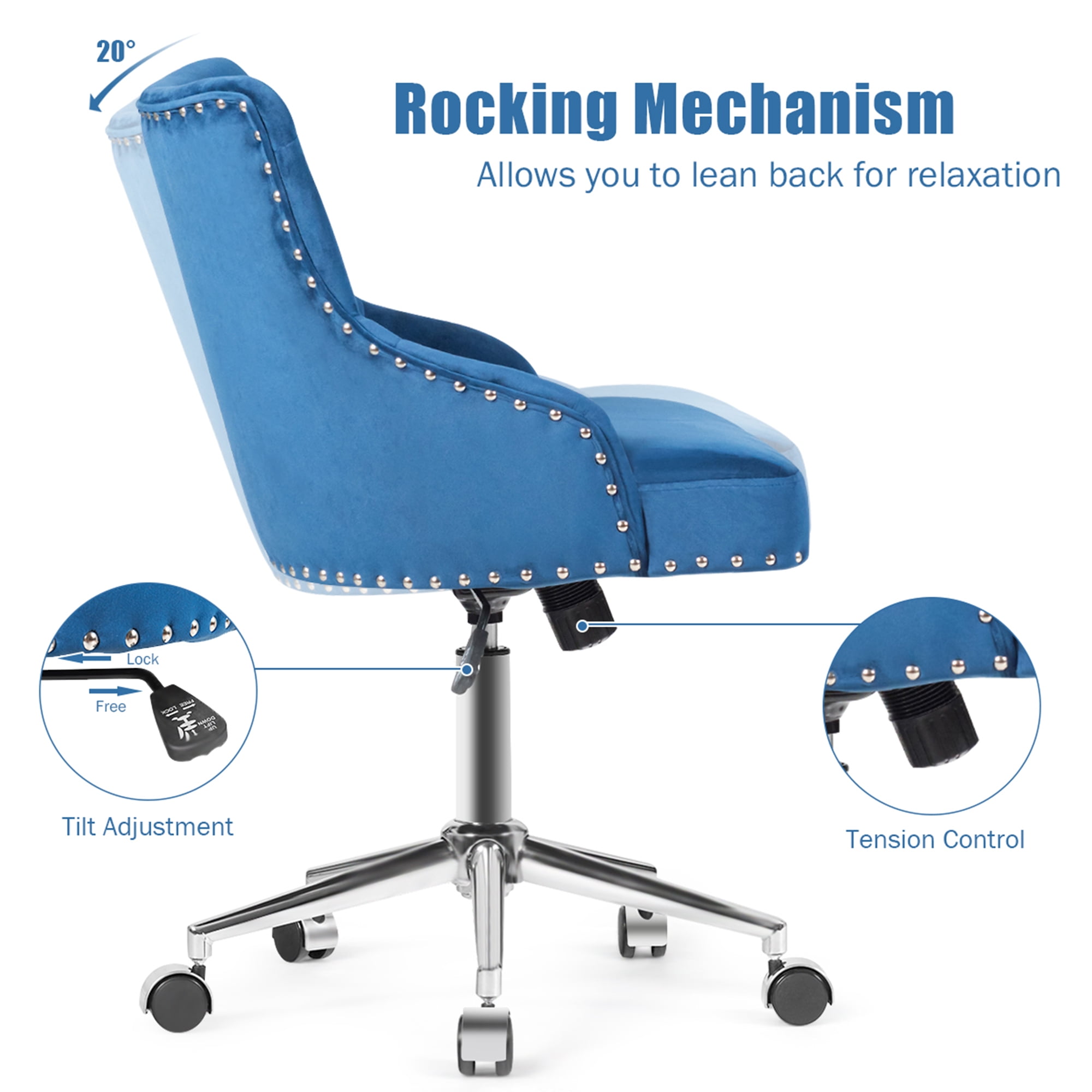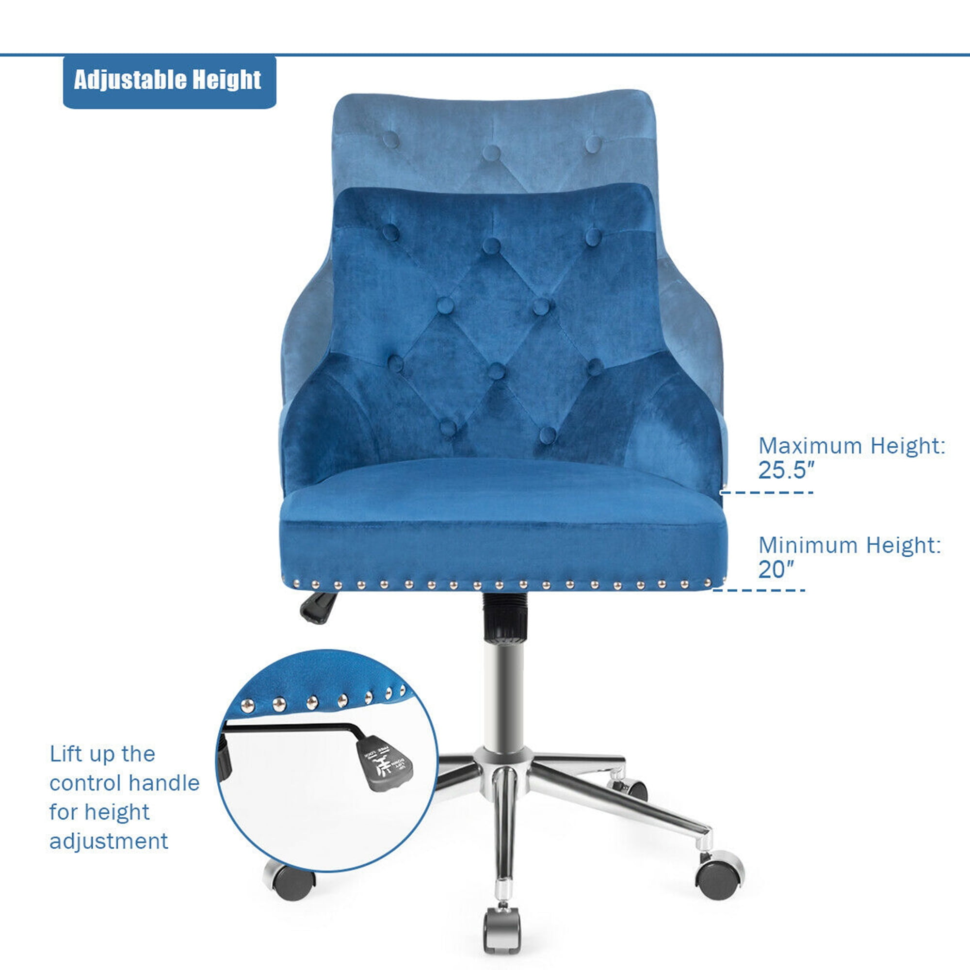 Gymax Blue Velvet Office Chair Tufted Upholstered Swivel Computer Desk Chair Nailed Trim