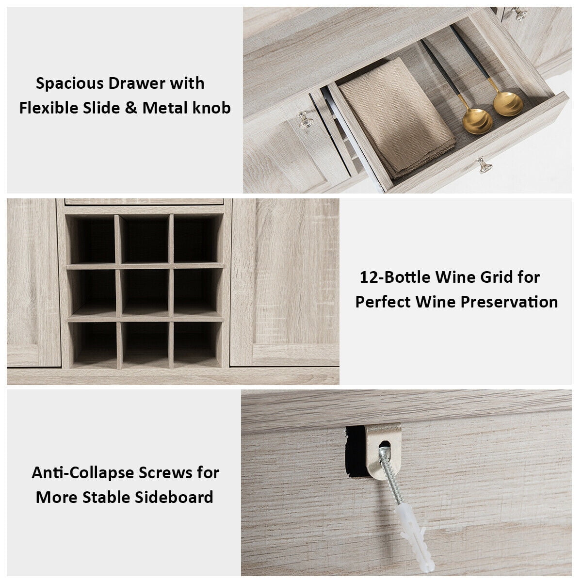 Wide open shelf play a dual role by also providing storage space and displaying ornament Spacious drawer with metal knob is flexible to push and pull 2 Bottom cabinets with adjustable shelves extends storage space Center wine grid fits 9 wine bottles 5 Thickened legs ensure sturdy as well as stable structure Anti-Tip metal accessories support buffet sideboard firmly