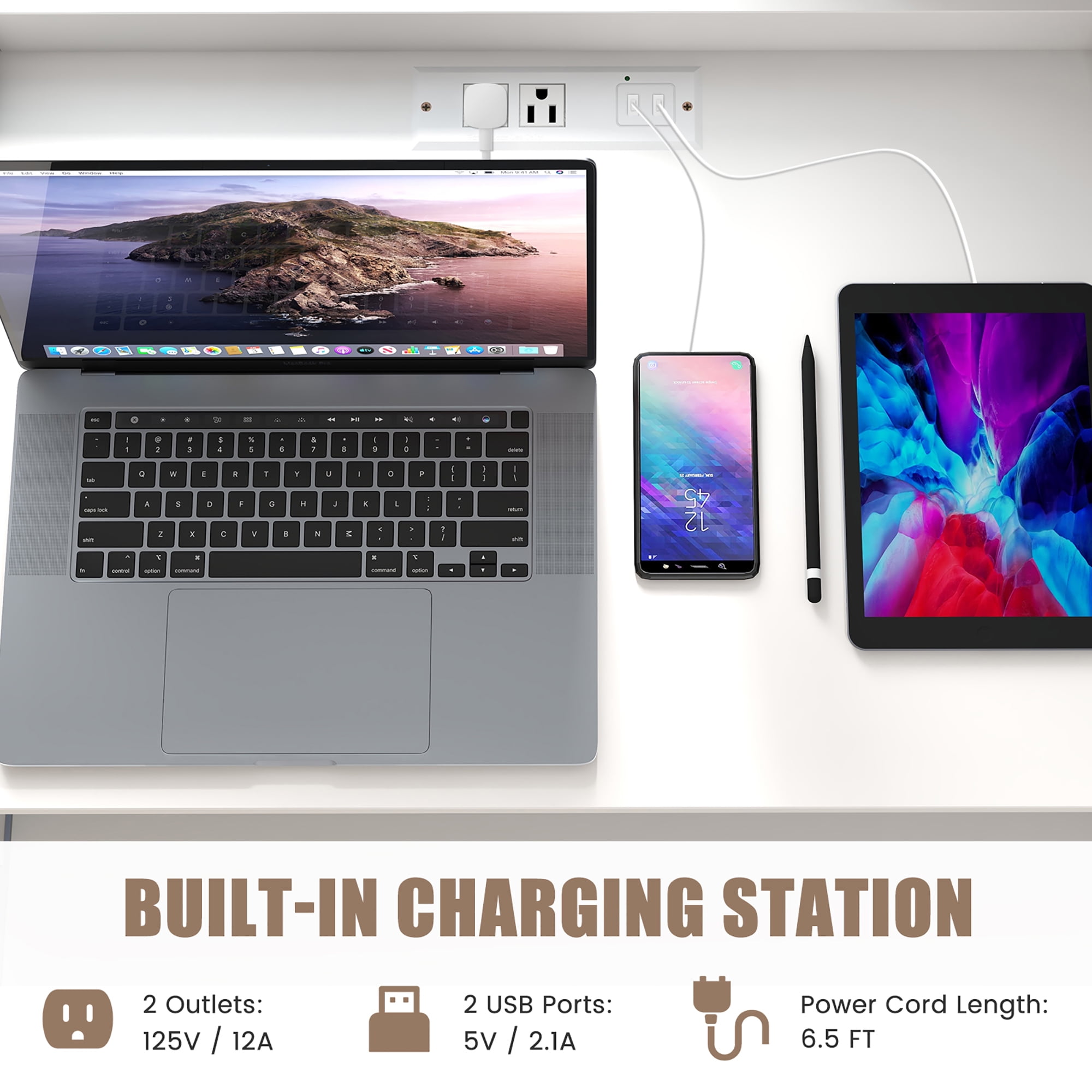Sufficient Storage Space: The desktop is spacious enough to accommodate the computer and books you need for work. The additional open bookshelf to categorize everyday items. It also includes a keyboard tray and a 2-tier shelf for your CPU. Convenient Built-in Charging Station: This computer desk offers great convenience for users of electronic devices. The built-in charging station includes 2 outlets (125V / 12A) and 2 USB ports (5V / 2.1A) for charging phones, ipad and other electronic devices. Removable Hutch for 2-in-1 Design: The hutch of this computer desk is removable. You can customize your workspace by easily removing or installing it. Therefore, you can easily get larger desktop area to accommodate more and larger monitors. Premium Material & Solid Structure: Our computer desk is built with high-quality material for durability. The underside of the desk is reinforced with reinforcement bar to ensure that it can support heavy objects such as potted plants or large computers. Multifunctional Desk: Dimension: 43.5” x 20.5” x 54”. Detailed instructions will be included to help you complete the installation quickly. This versatile desk can be used as a computer desk, study table, writing desk or storage table, which is a perfect addition to your home. 2-in-1 design of workstation allows you to use her as a computer desk or a writing desk Built-in charging station includes 2 outlets (125V / 12A) and 2 USB ports (5V / 2.1A) Extra keyboard tray with smooth metal slide can accommodate most 108-key keyboards Spacious desk top with storage rack for sorted storing Multifunctional desk with trendy appearance is suitable for bedroom, living room or office Easy to install and comes with detailed instructions