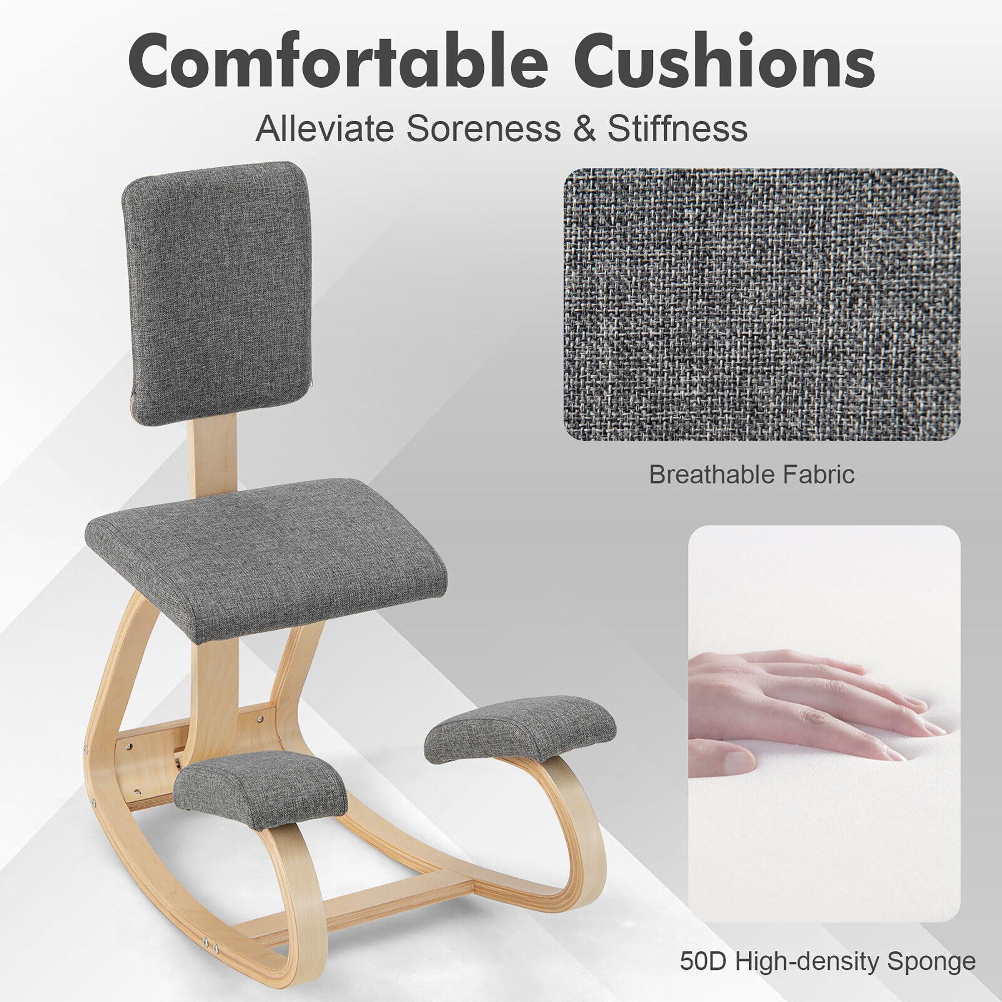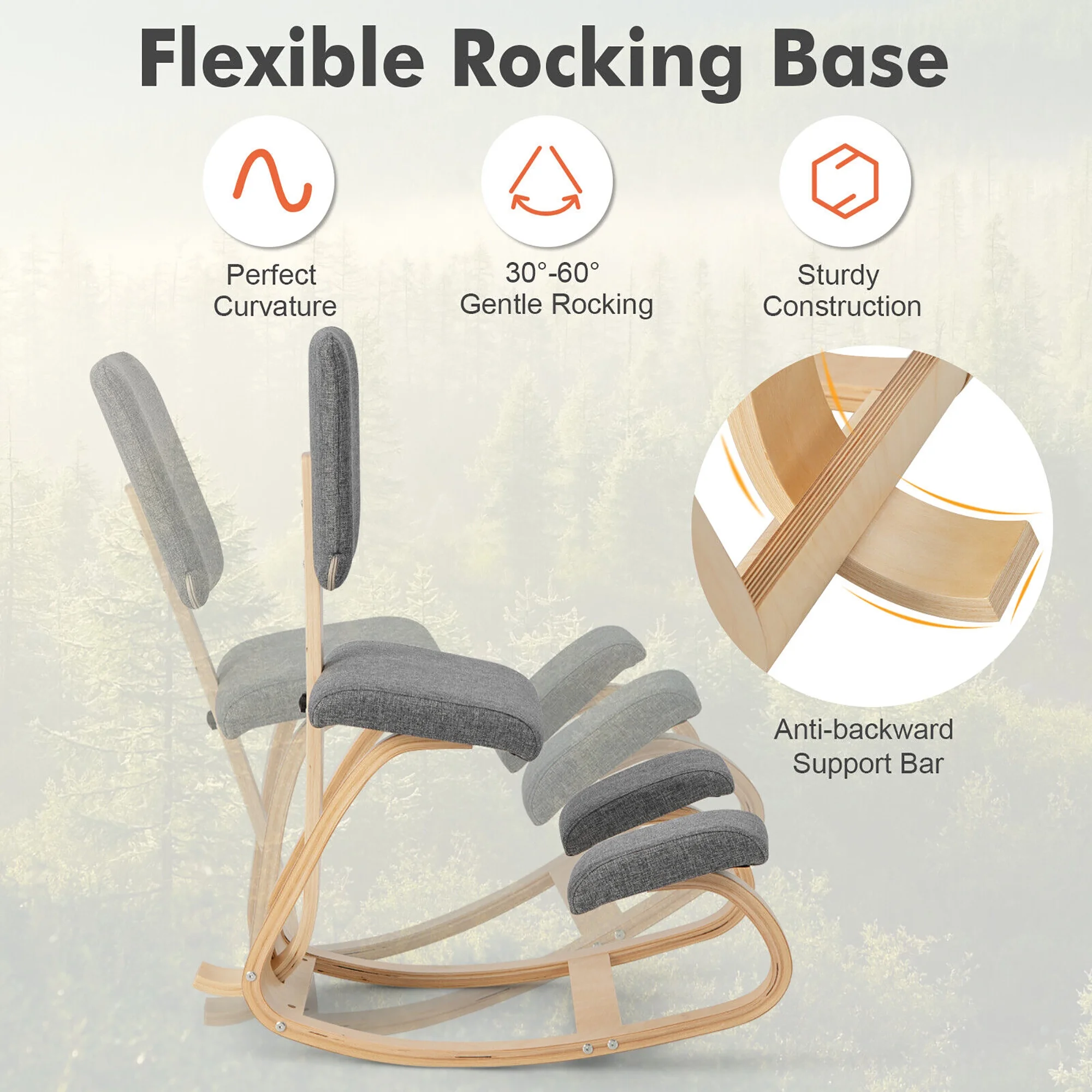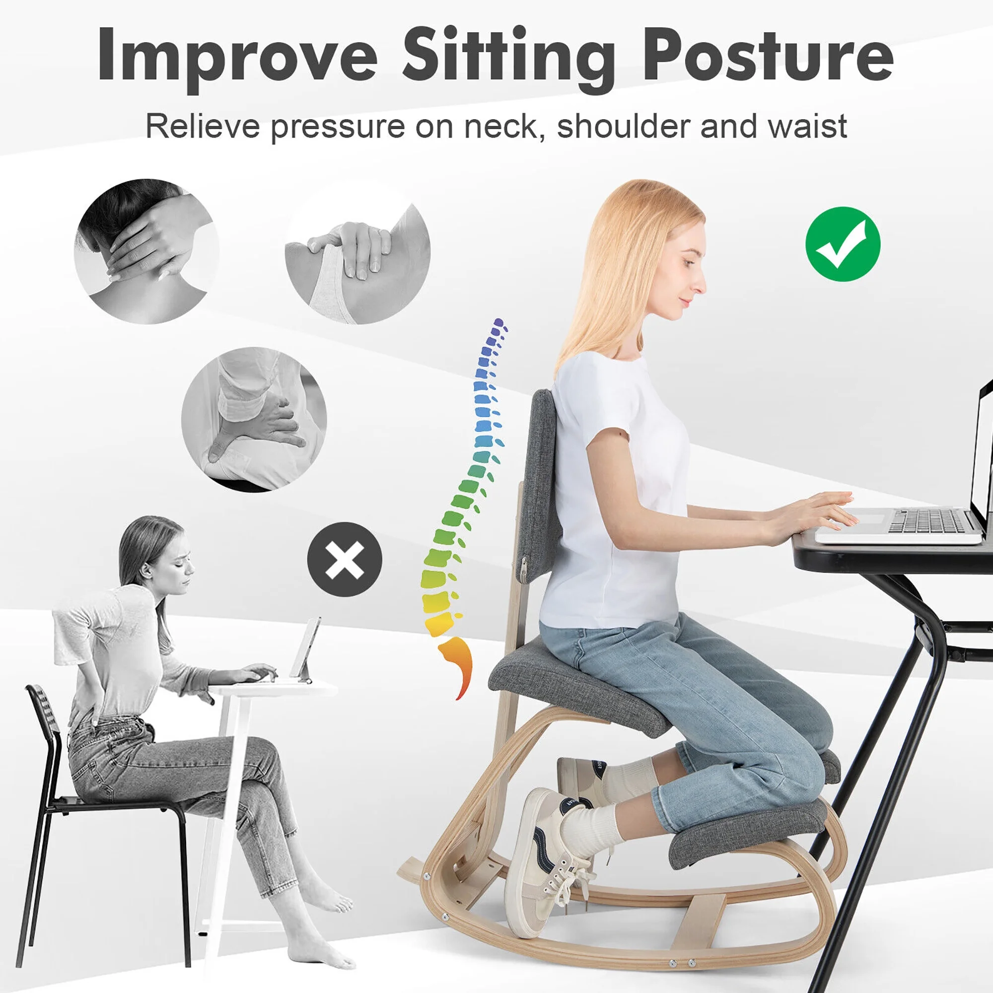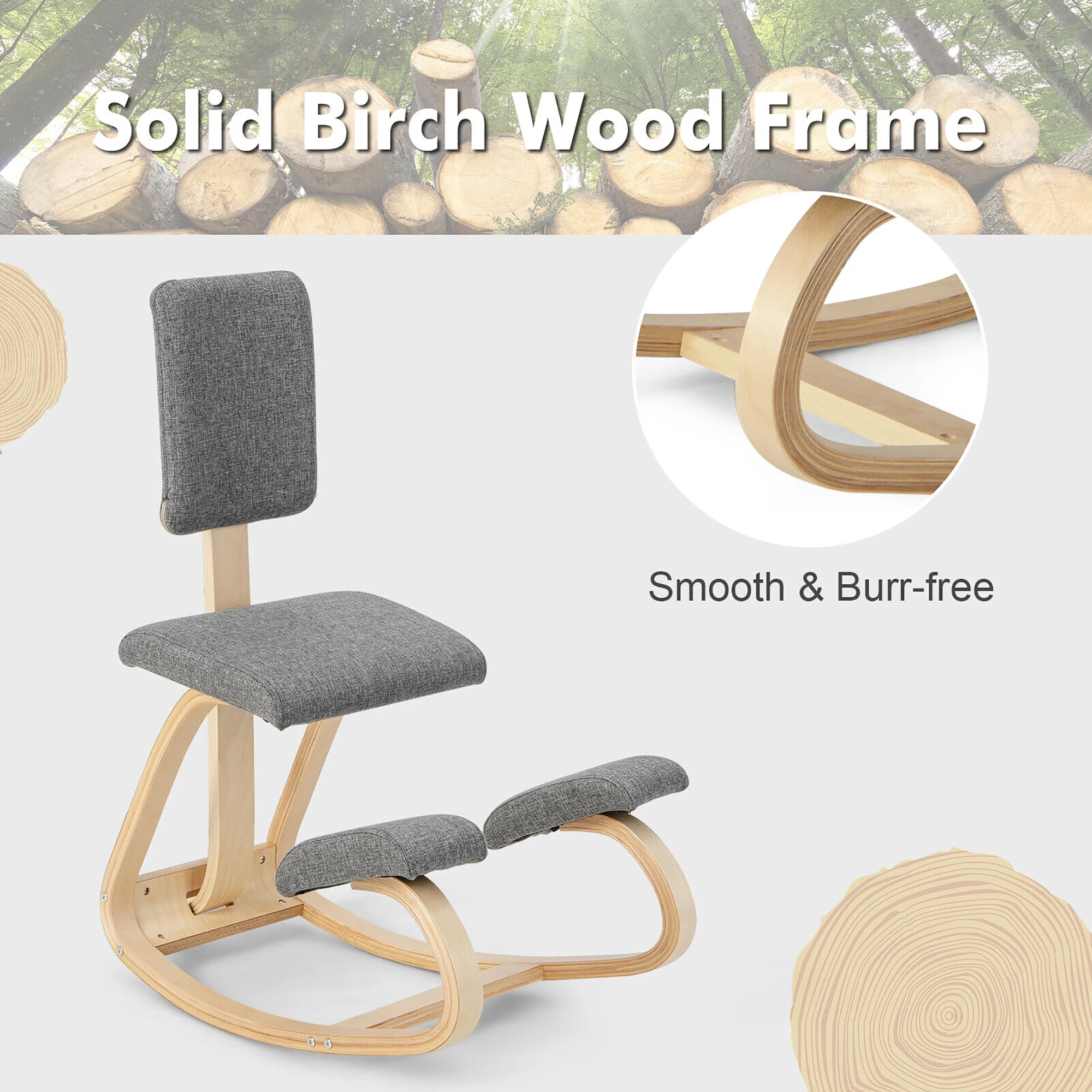 Improve Sitting Posture: The kneeling chair is designed for the optimal spine comfort. By adding 2 knee cushions, it makes you work in a kneeling posture, thus to achieve better spine alignment and relive pressure on neck, shoulder and waist. Comfortable Cushions: The rocking office chair is also equipped with soft backrest, seat and knee cushions, padded with 50D high-density sponge and covered with skin-friendly velvet cover/breathable fabric for maximum comfort. Rock to Relax: The posture chair features a flexible rocking base, with perfect curvature to achieve 30°-60° gentle rocking for better relaxation. What’s more, there’s an anti-backward support bar to prevent it from tipping over. Solid Birch Wood Frame: Crafted from solid and durable birch wood material, the mediation chair offers a sturdy construction for long-time company. It is well-crafted for a smooth & burr-free surface. And there’s a reinforced crossbar for added sturdiness. Easy to Assemble: The ergonomic chair has a relatively simple structure for easy assembly. Just follow the steps and tighten the screws! The detailed instructions will be of great help. With anti-backward protection in against of tipping over Soft cushions help to alleviate soreness & stiffness Strong wooden frame offers 300 lbs large capacity Wide application includes reading, working, studying and mediation