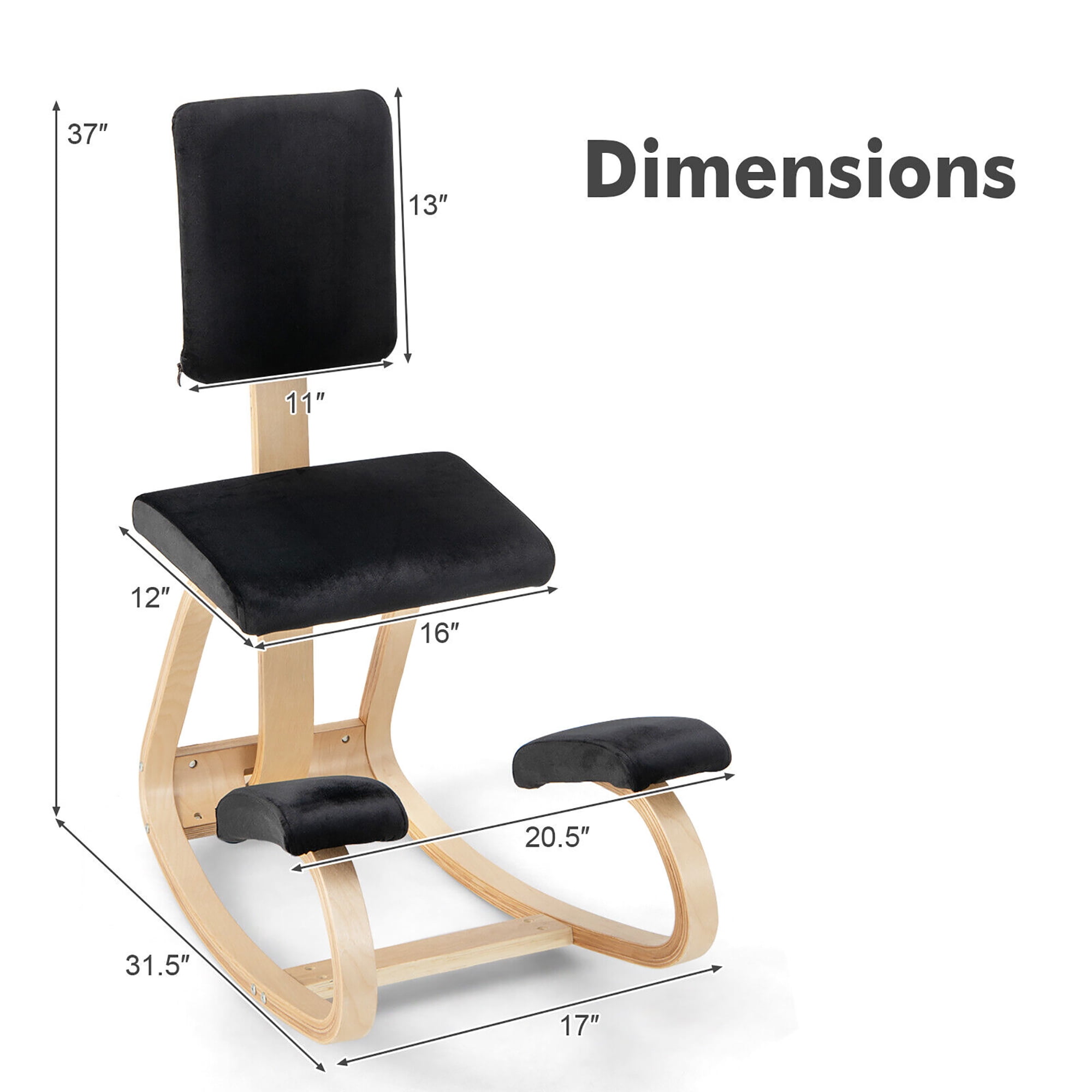 Description: Experience the perfect sitting posture and ultimate comfort with our revolutionary kneeling chair! Say goodbye to neck, shoulder, and back pain as our posture chair’s clever design includes knee support to provide more possibilities for pressure-relief. Sink into luxurious softness with our high-density sponge padding and velvet cover. The flexible rocking base allows for gentle relaxation, while the anti-backward support bar ensures stability. Crafted from solid birch wood for incredible durability, our chair boasts a smooth surface and reinforced crossbar for added strength. More details, like the firm connection, enhance the overall structure. Upgrade your sitting experience now! Features: Posture chair allows you to sit in relax and be more productive With ergonomic backrest for spine support and better comfort Rocking function gives you a comfortable experience Specification: Color: Black + Natural Material: Birch Wood, Sponge, Velvet Overall Dimensions: 31.5” x 20.5” x 37” (L x W x H) Backrest Dimensions: 13” x 11” (L x W) Seat Dimensions: 16” x 12” (L x W) Base Width: 17” Weight Capacity: 300 lbs Net Weight: 13 lbs Package Includes: 1 x Kneeling Chair 1 x Instruction
