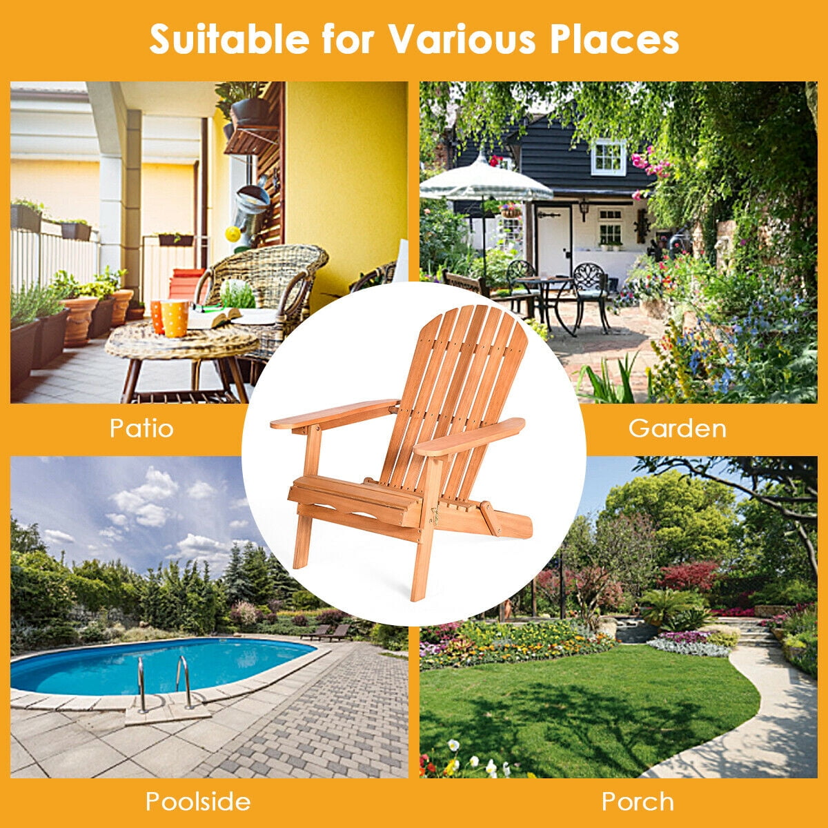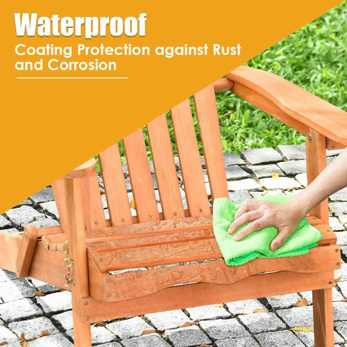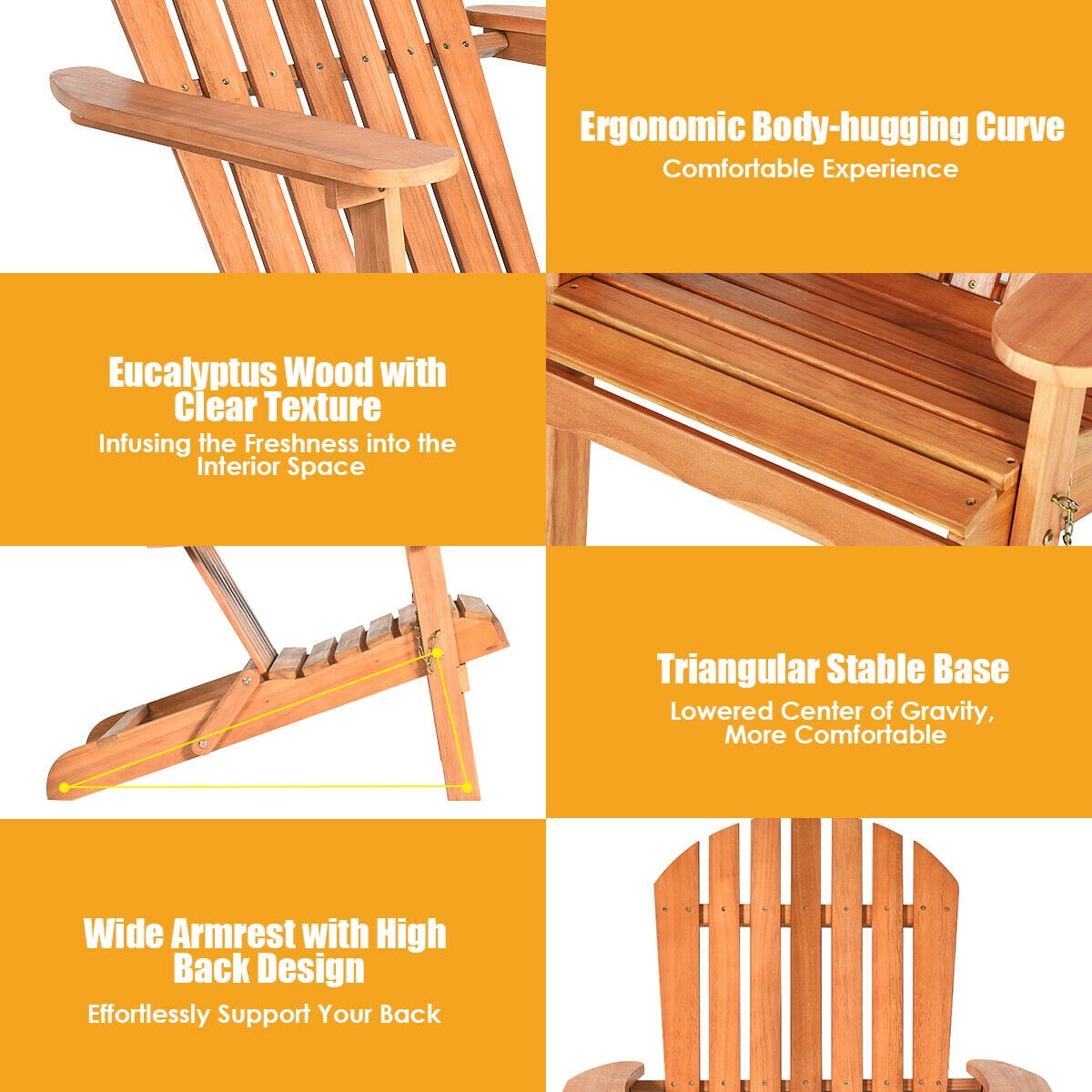 Description: This eucalyptus Adirondack chair is perfect for the patio, backyard, porch, garden or beach area. The wide backrest with wide batten and ergonomic armrest fits your spine curve, providing you with the optimal comfort and leisure time. And the eucalyptus wood selected through the exquisite process allows for a long-time service time, and perfectly matches with the classic appearance, adding the harmonious and nature accent to other decor. Leaning back in this chair under the sunshine, the tiredness and fatigue after the overworking daytime will fade away while you are reading, chatting or taking a nap. Features: High-quality eucalyptus wood, Sturdy and stable enough to hold up to 400 lbs Wide batten with minor gap, ultra comfort Ergonomic backrest and armrest, fits body curve Foldable design with lockable key, firmly keeps in its position Specification: Color: Natural Finish Material: Eucalyptus Overall dimension: 34” X 28” X 35.5” (L X W X H) Backrest dimensions: 31.5” X 19.5” (L X W) Seat dimensions: 20” X 18.5” (L X W) Height from the ground to the armrest: 21.8” Height from the ground to the seat: 13.8” Net weight: 19 lbs Weight Capacity: 400 lbs Package includes: 1 x Adirondack Chair 1 x user manual