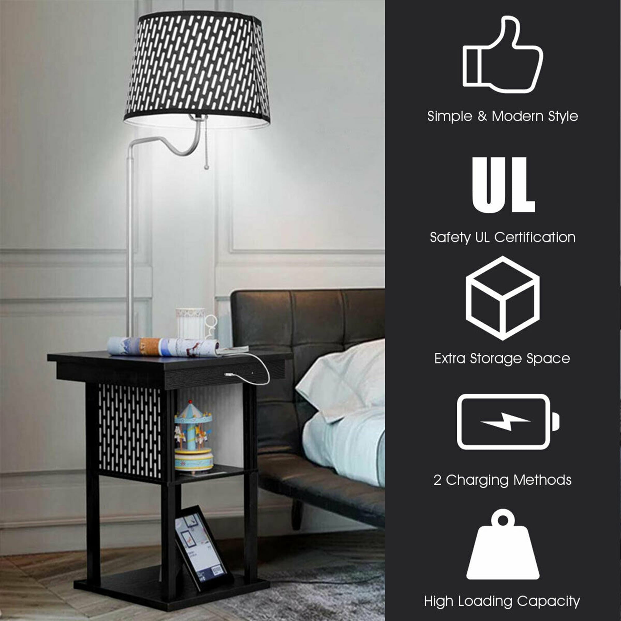 Description: This floor lamp is made of high-quality iron pipe and MDF, which is Sturdy. The black side table provides a stable base and large storage space for you. The USB port, socket ports and wireless charging port is perfect for solving the charging problems of devices and appliances. It can be put in various places, living room, bedroom, office, etc. The floor lamp with black hollow lampshade and soft light allows you to work or rest in a warm and comfortable atmosphere. In addition, this floor lamp has UL certification to ensure your electricity safety. This floor lamp can add more charm to your home, and you will love it! Features: Made of iron pipe and MDF with longer service time 360 degree swing arm to provide you with a wider range of lighting UL certification to ensure your electricity safety USB port, wireless port and socket port is convenient for device charging Pulling switch is convenient to control the lamp Specification: Color: Black Material: Iron, MDF Product Size: 17.5” X 17.5” X 58”(L X W X H) Net Weight: 18lbs Certification: UL Lamp Holder: E26 (Bulbs Not Included) Rated Voltage: 120V/ 60HZ Wattage: 40W Package includes: 1 X Floor Lamp 1 X User’s Manual