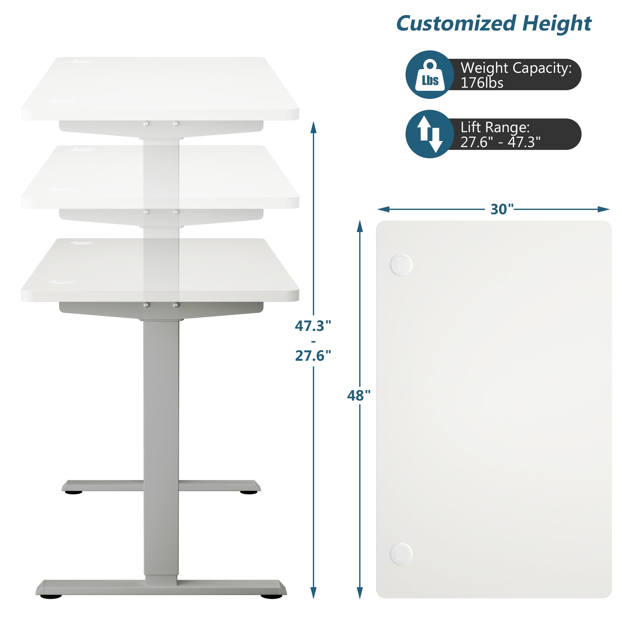 Refresh your working style with our ergonomic electric standing desk! The sit stand desk helps to easily achieve the free switch between sitting and standing modes. Because of powerful dual-motor lifting system and smart press-button controller, the height adjustment of this electric desk is a breeze. There is no annoying noise since the motor works smoothly and quietly (lower than 50db). Thanks to the intelligent memory function, you can save 3 ideal heights. Heavy-duty steel structure and thick wooden tabletop make the writing desk stable and durable. Moreover, the fully adjustable frame supports load up to 176 lbs and roomy desktop provides spacious enough surface for many office necessities. Advanced anti-collision design and overheat protection ensure safer using experience. Features: Easy-to-operate control panel with LED display Over heat protection for higher using safety Heavy-duty steel frame loads up to 176 lbs Column Motor Rated Input: DC24V,5A Controller Input/Output: DC29/29V Full Load Current: 5A Weight Capacity: 176 lbs Package Includes: 1 x Electric Standing Desk 1 x User’s Manual