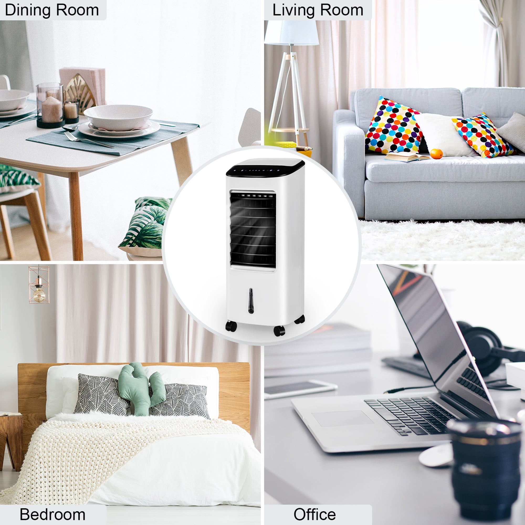 Air Cooler & Humidifier & Fan 3 in 1: This Gymax evaporative air cooler with remote control and with humidifying, air purifying and cooling function will be your perfect partner to spend hot summer days. It even comes with a remote control. By providing a large amount of cooling airflow together with water vapor, this air fan can cool down the whole room, increase air humidity and purify air. Simple Operation & Remote Control: Intelligent touch panel and LCD display make the cooler easy to operate. Besides, with the remote control in hand, you can easily control the air cooler without having to get up from the comfortable sofa. Moreover, with universal wheels and built-in handle, this air cooler can be easily moved around. Air cooler, fan, air humidifier, 3-in-1 multi-functional design