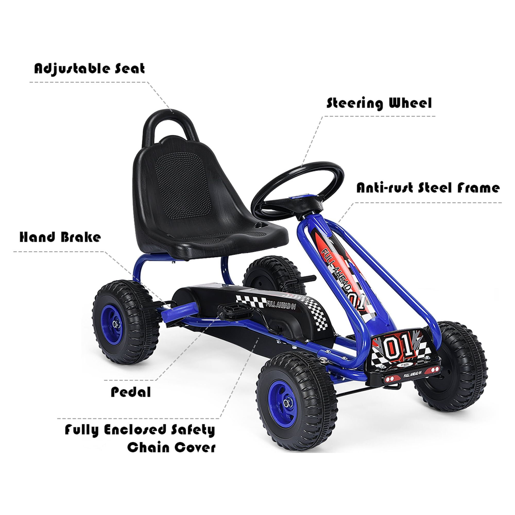 Description: Motivate your child to stay active with this Pedal Go Kart! Pedal powered design allows your children to move forward and backward and builds their strength, endurance and coordination, perfectly avoiding many issues from charging battery and wire connection. Besides, 2 positions adjustable seat meets your little one’s different needs. Coming with handbrake and smooth steering wheel, this kids pedal ride on toy stimulates the real driving experience to satisfy your little one’s curiosity. Features: Ideal for kids aged 3 – 6 years old Strong load-bearing capacity up to 66 lbs Grows with your little one thanks to 2 position adjustable seat Steering wheel and handbrake stimulate real driving experience Specification: Color: Blue Material: Iron, PP Overall dimension: 36” x 20” x 21” (L x W x H) Dimension of seat: 12” x 6” x 12” (L x W x H) Diameter of wheel: 7” Net weight: 13 lbs Weight capacity: 66 lbs Recommended age: 3 – 6 years old Package includes: 1 x Pedal Go Kart 1 x Instruction