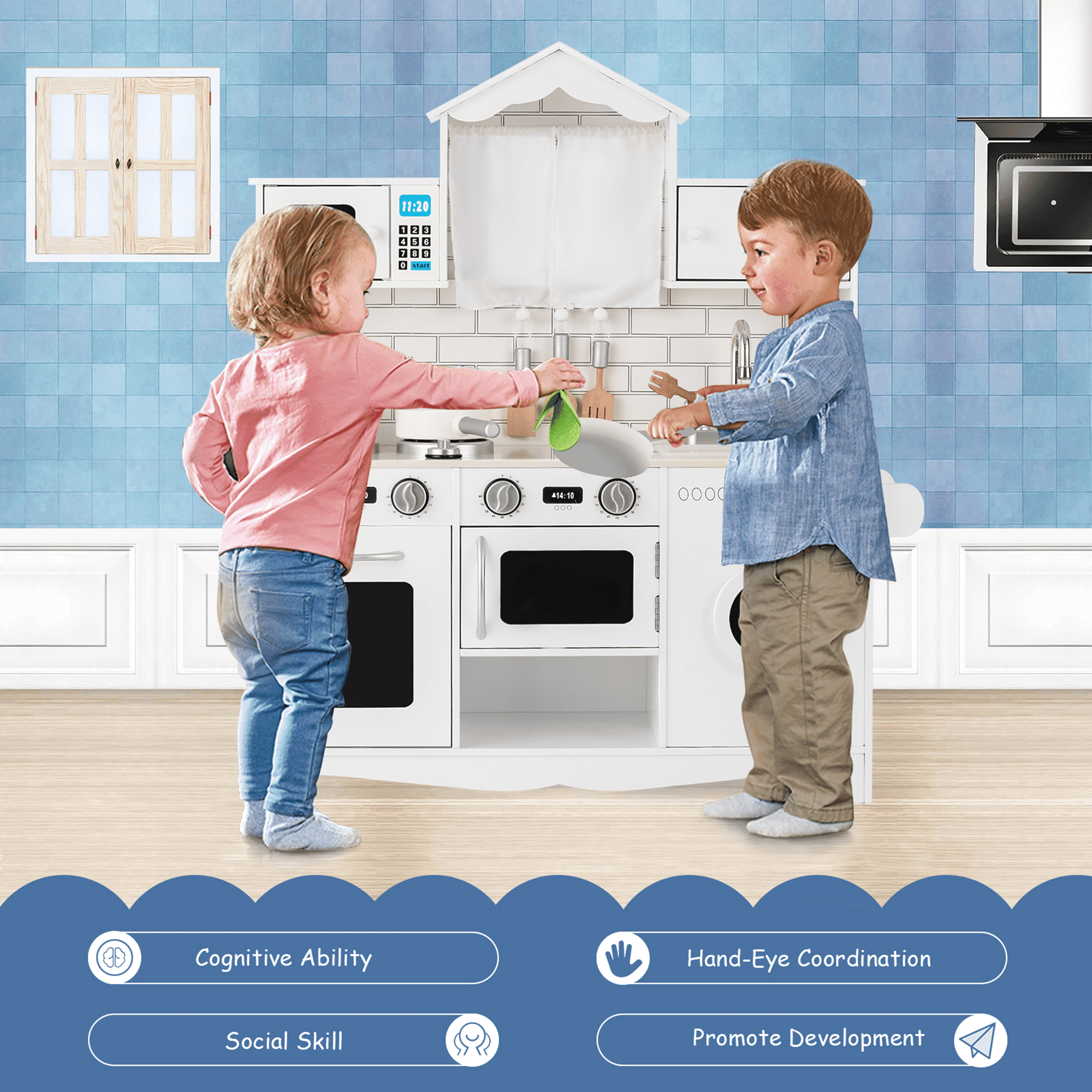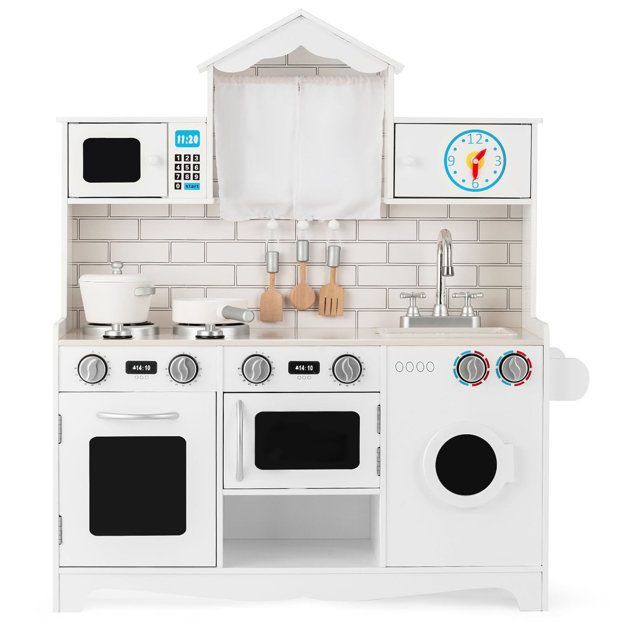 Description: Our gorgeous pretend cooking food toys will definitely put a smile on your little one’s face. The play kitchen for kids is the best toy to learn about cooking, because it includes a variety of practical and realistically designed cooking accessories, such as washing machine, microwave, oven, sink, gas stoves and clock. This kid’s kitchen features an open shelf, a towel rack and a lot of cabinets, which are enough to store kitchen essentials. Made of MDF and PP, this kitchen toy is sturdy and can provide you with long-term service. Abundant accessories including a pot with a lid, a pan, 3 cooking utensils can let your children fully experience the joy of cooking. Features: Develops creativity and imagination in kids over 3 years old Perfect gift idea for birthday, Christmas, Children’s day Specification: Color: White Material: MDF + PP Product Dimension: 30.5” x 11.5” x 36.5” (L x W x H) Net Weight: 28.5 lbs Suitable Age: 3 years+ Package Includes: 1 x Kids Kitchen Playset 1 x Pot with Lid 1 x Pan 3 x Cooking Utensils 1 x User Manual