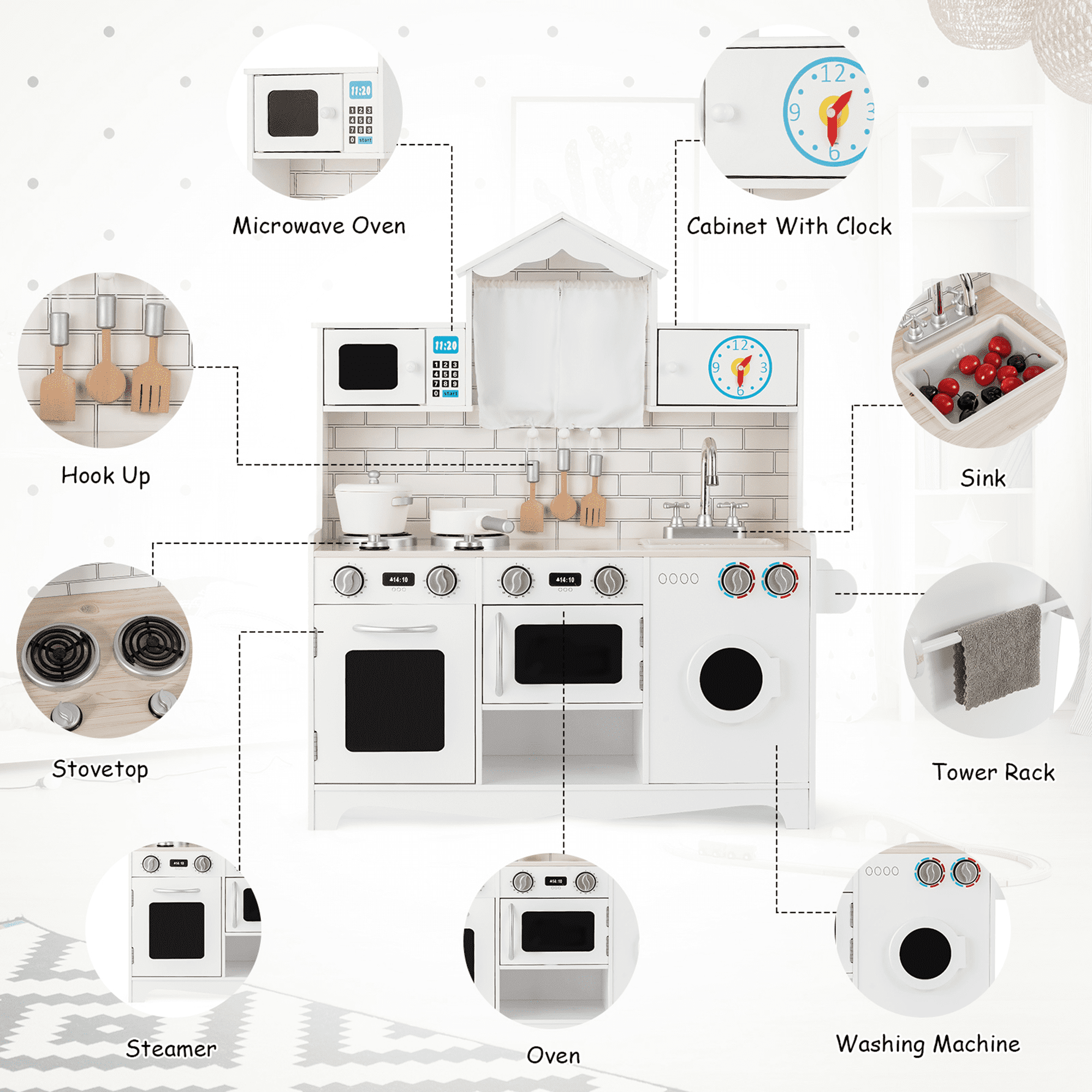 Pretend Cooking Set: Coming with most kitchen appliances, this kid kitchen includes washing machine, microwave, oven, sink, gas stoves, and knobs with click sound, so your lovely child can be immersed in the simulation cooking game for a long time. At the same time, you can have more leisure time to enjoy. Ample Storage Space: Different sizes of cabinets with doors, the bottom open shelf and the side towel rack can be used to store a variety of toys in order to solve the problem of insufficient toy storage space. The suction buckle design on the door can easily close the door in time to avoid dust accumulation and save energy to clean up. Sturdy Material & Sturdy Frame: With Sturdy MDF and PP, this kid kitchen features more sturdy and stable frame, which can be absolutely safe to use. The smooth surface of the pretend kitchen playset for kids can effectively protect children from scratches and falls. Multiple Purposes in One Design: This kid kitchen with clock not only allows children to experience the fun of cooking, but also increases children’s knowledge of time and some precautions when using kitchen utensils. What’s more, it can develop creativity and social skills while enjoying a happy childhood. Interesting & Abundant Accessories: In order to let your children experience the most authentic cooking, this children’s kitchen comes with a complete set of accessories, including a pot with a lid, a pan, 3 cooking utensils. The necessary parts and instructions are accompanied by the package to facilitate your assembly. Storage cabinets, towel rack and open shelf at the bottom for easy storage Superb workmanship and stable frame to support long-term use A pot with lid, a pan, 3 cooking utensils in the package for more fun Feature washing machine, microwave, oven, sink, gas stoves The clock on the cabinet door teaches kids to recognize time Complete accessories and detailed instructions, convenient for installation Assembly Video: