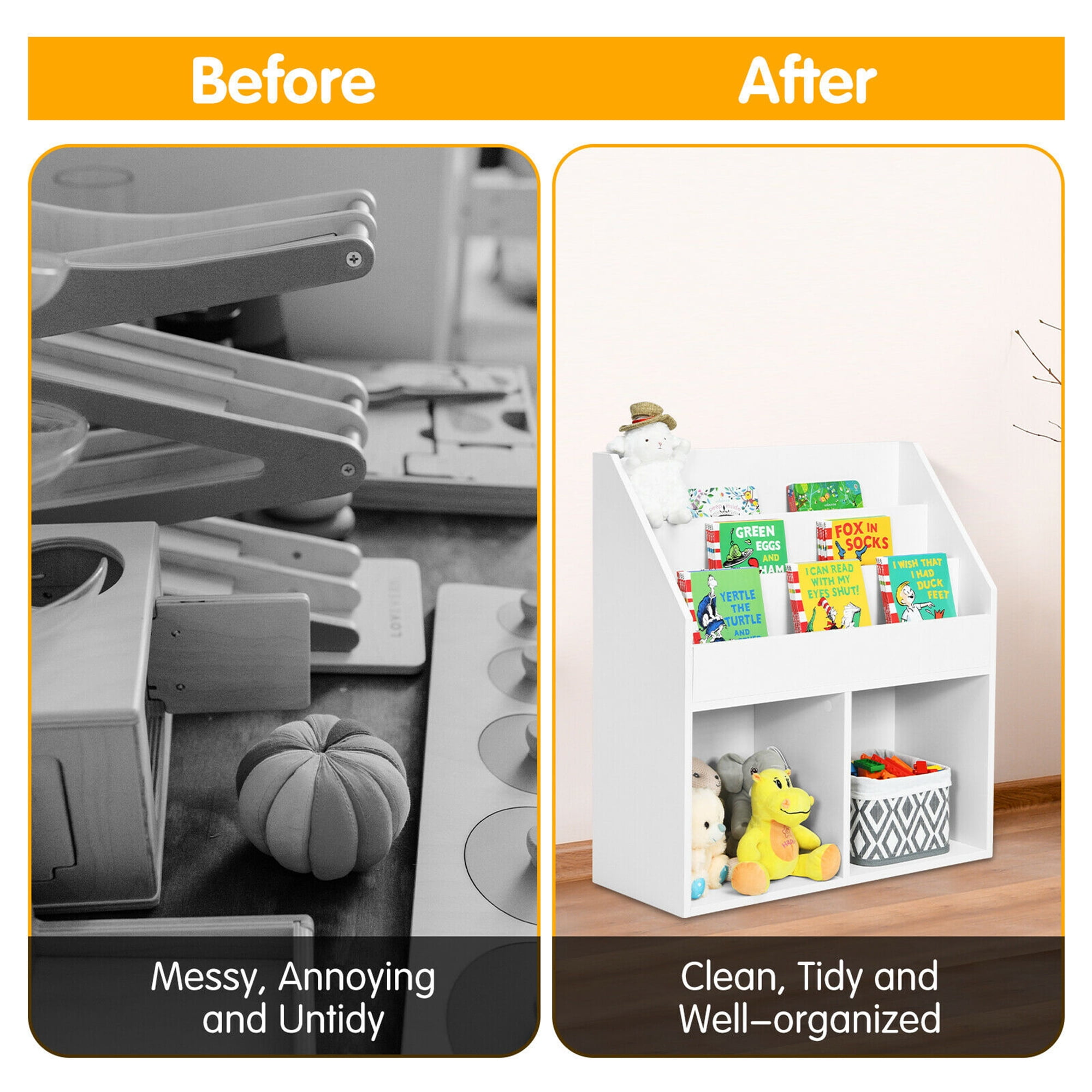 Large Storage Space: The children storage organizer features tiered upper shelves and 2 wide lower shelves, which provides plenty of space for all kinds of daily necessities. You can storage and display books, magazines, stationery on the upper shelves. Also, the bottom shelves can help you organize various building blocks, toys and more. Safe Material & Durable Construction: Made of selected engineered wood, this kids book shelf is safe, odorless and friendly for children. The thickened board and stable base perform excellently in weight capacity and sturdiness to accommodate your stuff and support long-lasting use. It is an ideal gift for your kids. Humanized Design with Perfect Height: The perfect kid-sized height allows children to fetch books conveniently while helping you to exercise your children’s reading and organization skills. Thanks to the round corners, you don’t have to worry about your kids getting hurt accidentally during the process of organizing and reading. Suitable for Various Scenarios: The combination of minimalist appearance and space-saving design enable it to be placed in many limited places. It can be used as a toddler’s cabinet or kid’s bookcase in kindergarten, children’s room, living room and playroom. And you can store it in the corner, entryway and other places. Easy Assembly & Simple Maintenance: There are complete accessories and detailed instructions in the package, so you can quickly install the standing shelf under the guidance of clear instructions. More, the waterproof surface makes it easy to clean with a damp cloth. Ideal for classroom, kindergarten, children’s room, living room and playroom 3-tier compartment and 2 open shelves to store and classify books and toys Smooth surface and round corners to keep the kids from getting hurt Easy Installation with required accessories and detailed instructions
