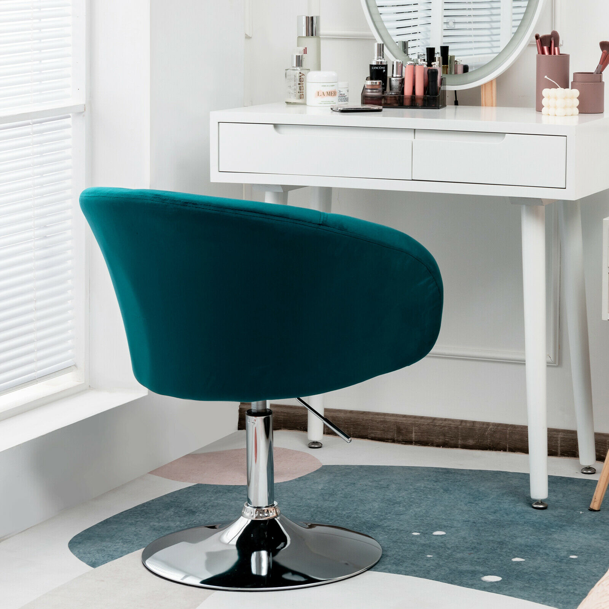 Embracing Design: With a special ergonomic design, this velvet vanity chair can provide you with full support like a human hug. In addition, because it has a round back, this vanity chair can fit your body closely when you sit. Height Adjustable & Swivel Chair: With a premium gas lift with SGS certification, you can freely adjust the chair height from 28.5” to 34”. You just need to lift the handle and choose your favorite height. Plus, the makeup chair is also 360-degree rotatable, which makes your work, makeup and rest more convenient. Skin-friendly Velvet & High-density Sponge: All areas in contact with skin are made of premium velvet which is not only elegant but also very soft, breathable and durable. Inside, the makeup chair is filled with resilient sponges that distract pressure on your back and hip when you sit. Stable & Sturdy Construction: The velvet vanity chair has a heavy-duty metal base with anti-slip rubber ring, which greatly improves overall stability. In addition, the whole structure is made of sturdy metal, which effectively enhances overall weight capacity up to 265 lbs. Simple Assembly & Wide Application: All needed accessories and detailed manual are included in the package that make assembly much easier. After assembling, the velvet chair can be used as a vanity chair, office chair and accent chair according to your needs. Adjustable height from 28.5” to 34”, suitable for people of different heights Can be used as a vanity chair, bar chair, accent chair on different occasions Sturdy metal base with anti-slip rubber ring enhances the overall stability 360 degree swivel design offers much convenience for your tasks Round back provides more support for your back, waist and hip