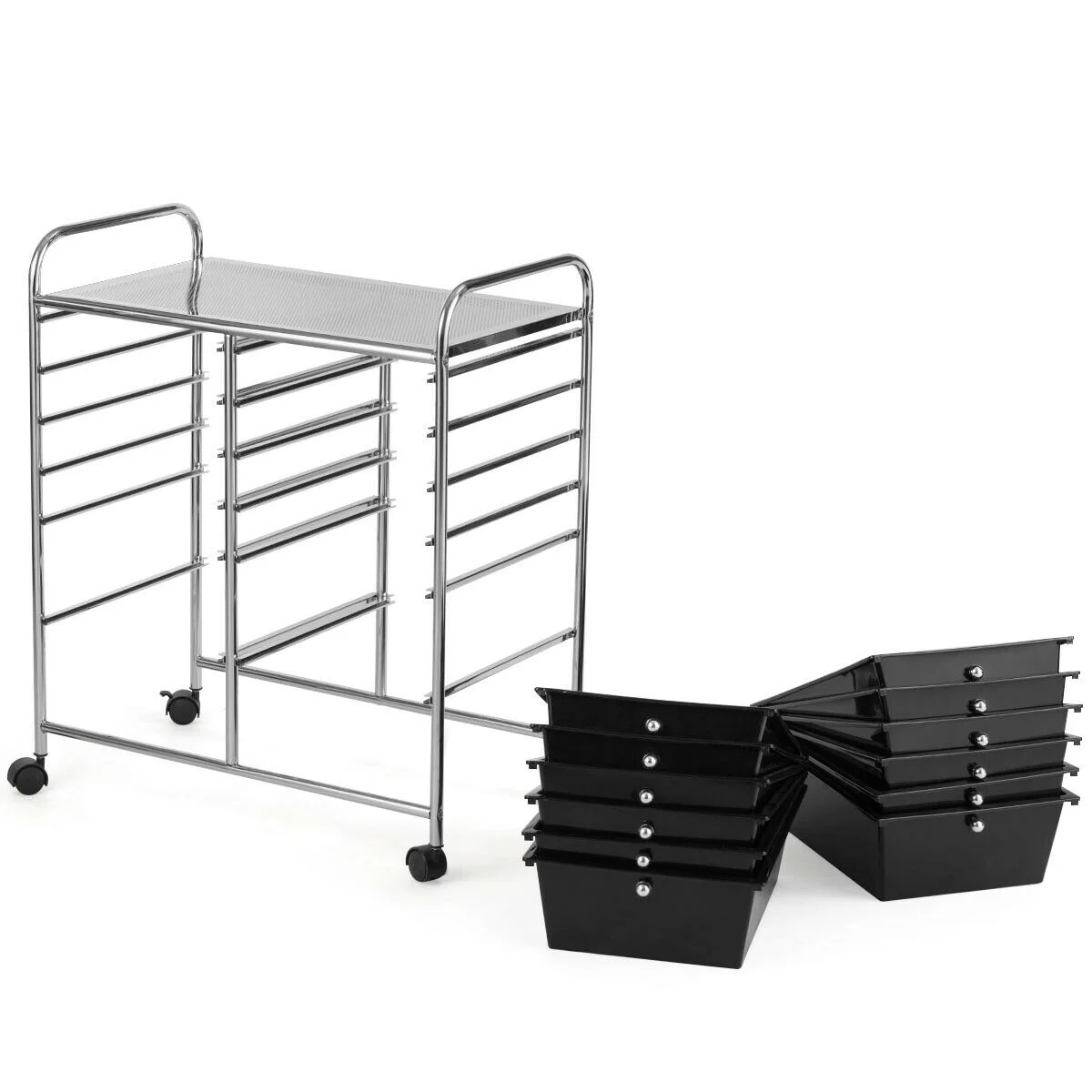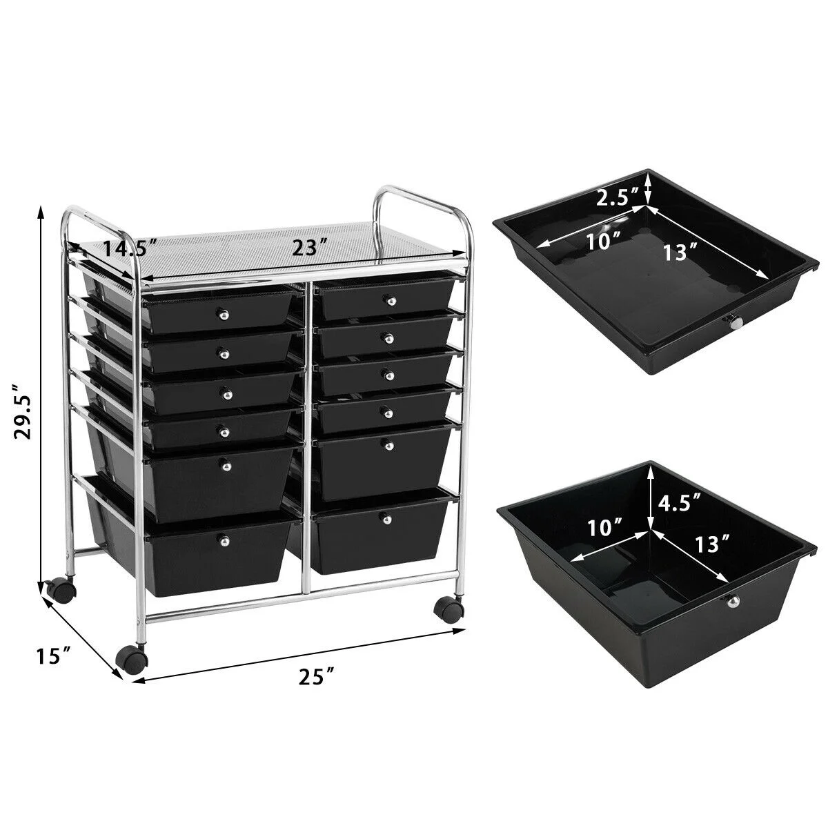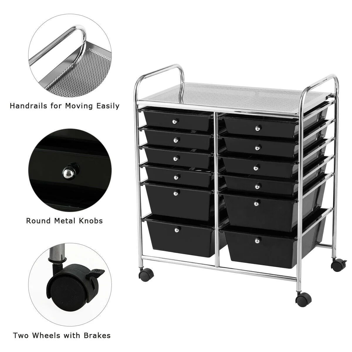 Description: Our semitransparent 12-Drawer Rolling Cart is perfect for the home, classroom or art studio. This double-line organizer features 12 easy-access drawers, including 2.5″ height and 4.5″ height. It is great for paper, tools, accessories, crafting, scrap booking or home office, help you to organize and make your tools and makeup in order. The semitransparent plastic drawers allow you to quickly identify contents. The sturdy steel frame and neat design makes it stable and attractive. If you are looking for a fine Rolling Storage cart, it will be your excellent choice to buy! Features: Drawer with handle for easy closing and opening Elegant black boxes, storage items and also a decoration to living space Assembly required with all necessary parts include Specification: Color: Black Material: iron, plastic Overall size:25″x15″x29.5″(LxWxH) Inner Size of Big Drawer:13″x 10″ x 4.5″(LxWx H) Inner Size of Small Drawer:13″ x 10″ x 2.5″(LxWx H) Diameter of wheel: 1.5″ Weight of Cart: 13.5 lbs Maximum Weight of Top: 22lbs Maximum Weight of Large Drawer: 5.5lbs Maximum Weight of Small Drawer: 3lbs Package Include: 1 x 12 drawers rolling cart 1 x instruction