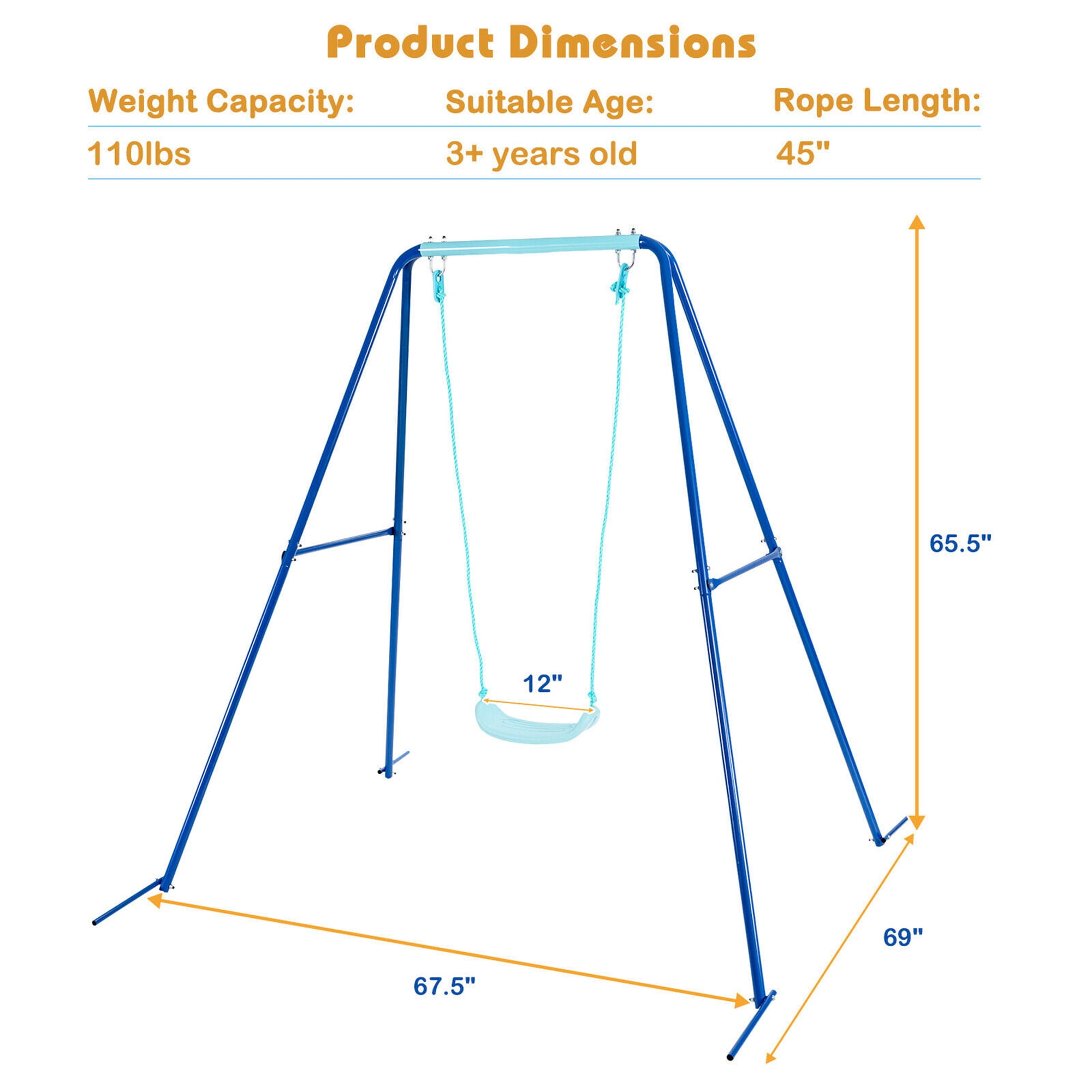 Description: If you still have no idea what kind of gift is suitable for children, it will not go wrong with our outdoor swing as a gift to please your child. The strong iron combined with the A-shaped structure, this outdoor swing will provide a strong load-bearing capacity of up to 110 pounds. The attached ground stakes are easy to operate, because you only need to insert it into the ground, and the swing can gain extra stability for a long time. With a coating on the surface, this swing can adapt to all kinds of weather outdoors. The impact-resistant U-shaped swing seat features a non-slip design to increase safety. The PE rope is tightly connected with the iron ring on the top to withstand friction again and again. Features: U-shaped structure and non-slip design, this seat features good safety Plastic seats are not easily deformed and impact-resistant A-shaped frame made of iron for better bearing capacity Specification: Color: Blue Material: Iron + PE Overall Product Dimension: 67.5” x 69” x 65.5” (L x W x H) Seat Product Dimension: 12” x 6.5” (L x W) Net Weight: 18.5 lbs Maximum Weight: 110 lbs Recommended Age: 3+ years old Package Includes: 1 x Outdoor Swing Frame 1 x Seat 4 x Ground Stakes