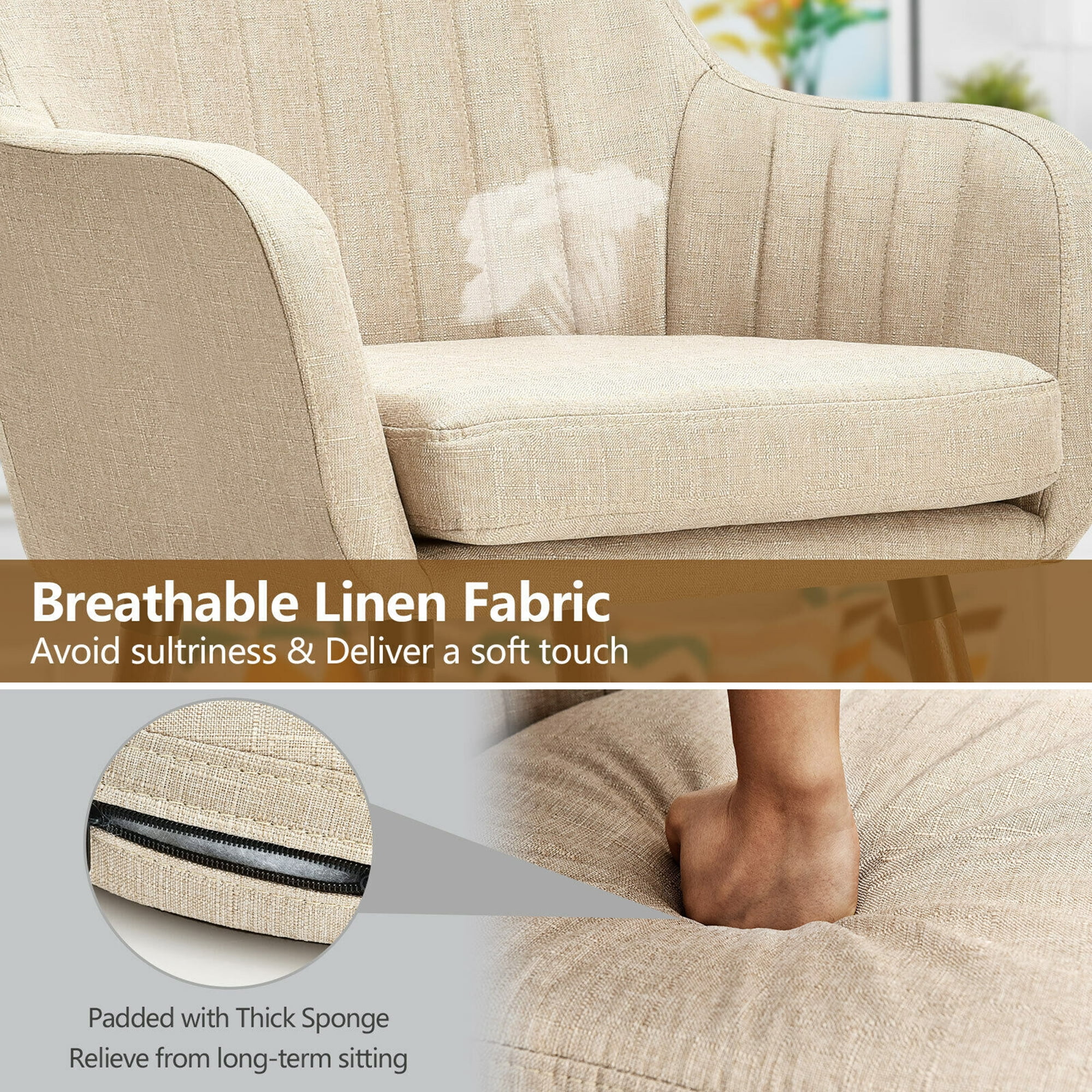 Natural Rubber Wood Legs: The chair is well constructed with premium natural rubber wood. Four sturdy rubber wood legs offer reliable support, which can support up to 264 lbs. Featuring such stable construction, this leisure chair comes with a long working life and leaves you no worry about using reliability. Padded Seat for Maximum Comfort: With the aim of offering the most comfortable sitting experience, the leisure chair is specially designed with a soft sponge cushion. The sponge-filled seat comes with great resilience, which provides soft support and certainly will relieve you from long-time sitting. Meanwhile, linen fabric on the surface is breathable and skin-friendly to deliver a comfortable touch and avoid sultriness. Ergonomic Structure & Adjustable Non-slipping Pads: The backrest features a curved design to perfectly fit the line of human body, which avoids back pain and discomfort. On both sides, ergonomic armrests comfortably support your hands at anytime. Additionally, four adjustable non-slipping pads ensure overall stability and prevent scratches on floor. Accent Design & Multi-functional Usage: Surely, modern and elegant design delivers a hint of fashion to your house, which can easily blend in with any decor. The chair comes with the compact size and matches the living room, dining room, bedroom well, offering a comfortable sitting experience anywhere, anytime. Convenient Assembly & Overall Dimension: All parts are included for easy assembly. It only takes minutes to assemble the chair with the instruction. And you just need to attach the legs to the seat with screws. The chair measures 24.5” x 25” x 34.5” (L x W x H), and weighs 37.5 lbs. With curved backrest to reduce back pain and discomfort caused from long-time sitting Designed to match various occasions such as the living room, bedroom, dining room, etc Comes with elegant and fashionable appearance to easily blend in with any decor Features ergonomic armrests on both sides to comfortably support your hands Crafted with natural rubber wood to last for years and support up to 264 lbs