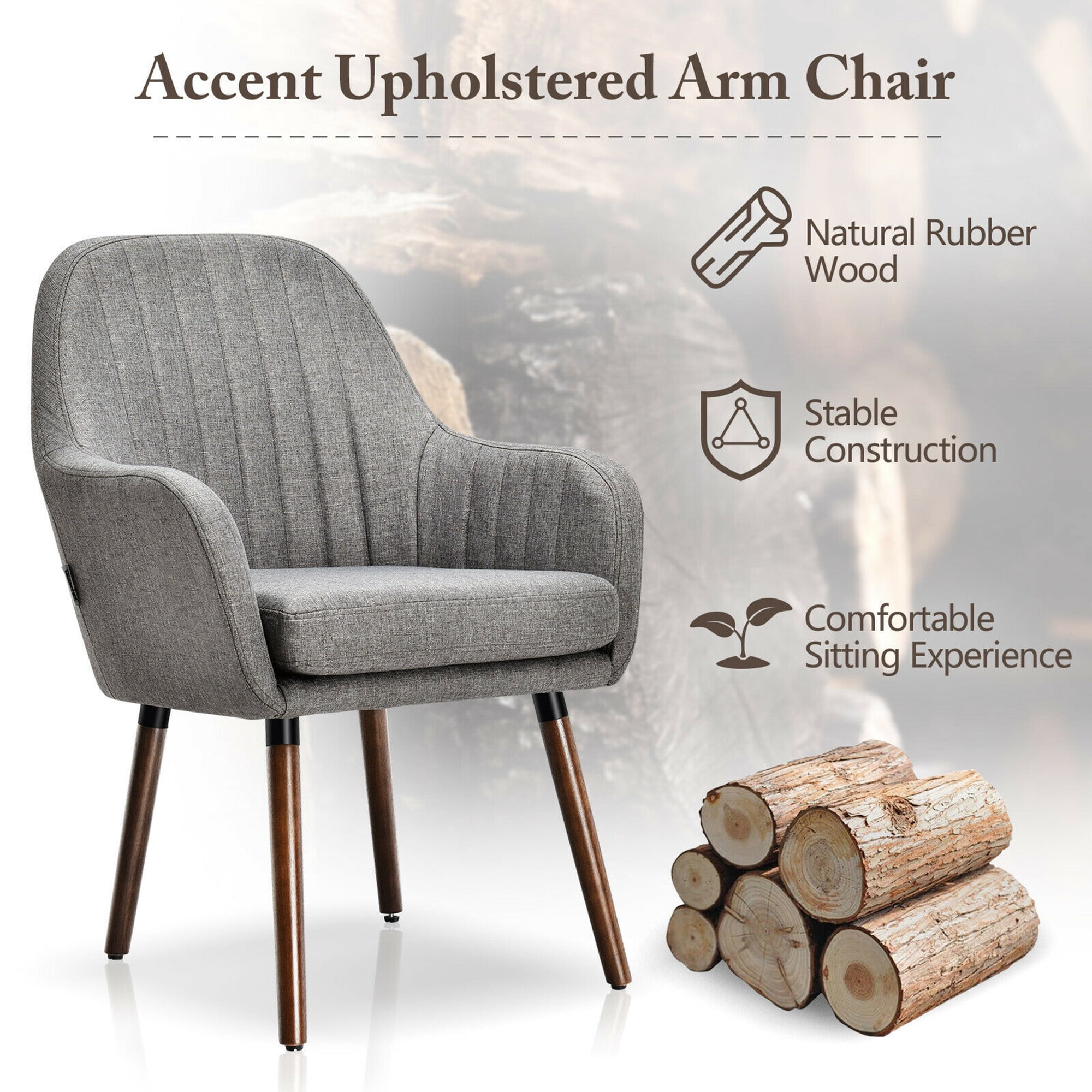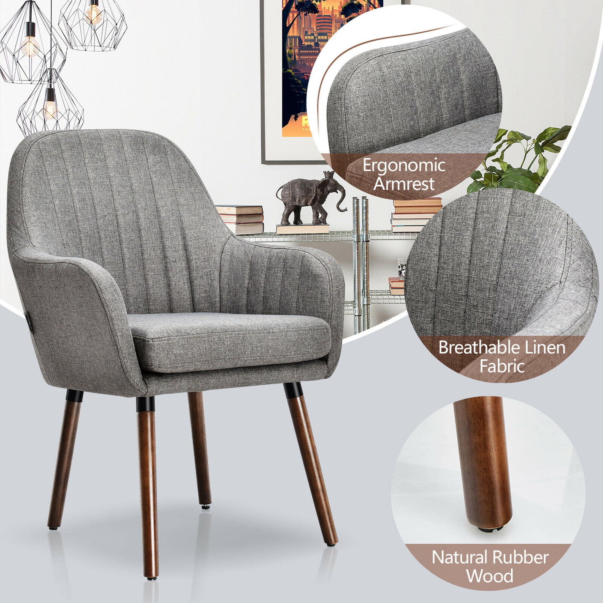 Natural Rubber Wood Legs: The chair is well constructed with premium natural rubber wood. Four sturdy rubber wood legs offer reliable support, which can support up to 264 lbs. Featuring such stable construction, this leisure chair comes with a long working life and leaves you no worry about using reliability. Padded Seat for Maximum Comfort: With the aim of offering the most comfortable sitting experience, the leisure chair is specially designed with a soft sponge cushion. The sponge-filled seat comes with great resilience, which provides soft support and certainly will relieve you from long-time sitting. Meanwhile, linen fabric on the surface is breathable and skin-friendly to deliver a comfortable touch and avoid sultriness. Ergonomic Structure & Adjustable Non-slipping Pads: The backrest features a curved design to perfectly fit the line of human body, which avoids back pain and discomfort. On both sides, ergonomic armrests comfortably support your hands at anytime. Additionally, four adjustable non-slipping pads ensure overall stability and prevent scratches on floor. Accent Design & Multi-functional Usage: Surely, modern and elegant design delivers a hint of fashion to your house, which can easily blend in with any decor. The chair comes with the compact size and matches the living room, dining room, bedroom well, offering a comfortable sitting experience anywhere, anytime. Convenient Assembly & Overall Dimension: All parts are included for easy assembly. It only takes minutes to assemble the chair with the instruction. And you just need to attach the legs to the seat with screws. The chair measures 24.5” x 25” x 34.5” (L x W x H), and weighs 37.5 lbs. With curved backrest to reduce back pain and discomfort caused from long-time sitting Designed to match various occasions such as the living room, bedroom, dining room, etc Comes with elegant and fashionable appearance to easily blend in with any decor Features ergonomic armrests on both sides to comfortably support your hands Crafted with natural rubber wood to last for years and support up to 264 lbs