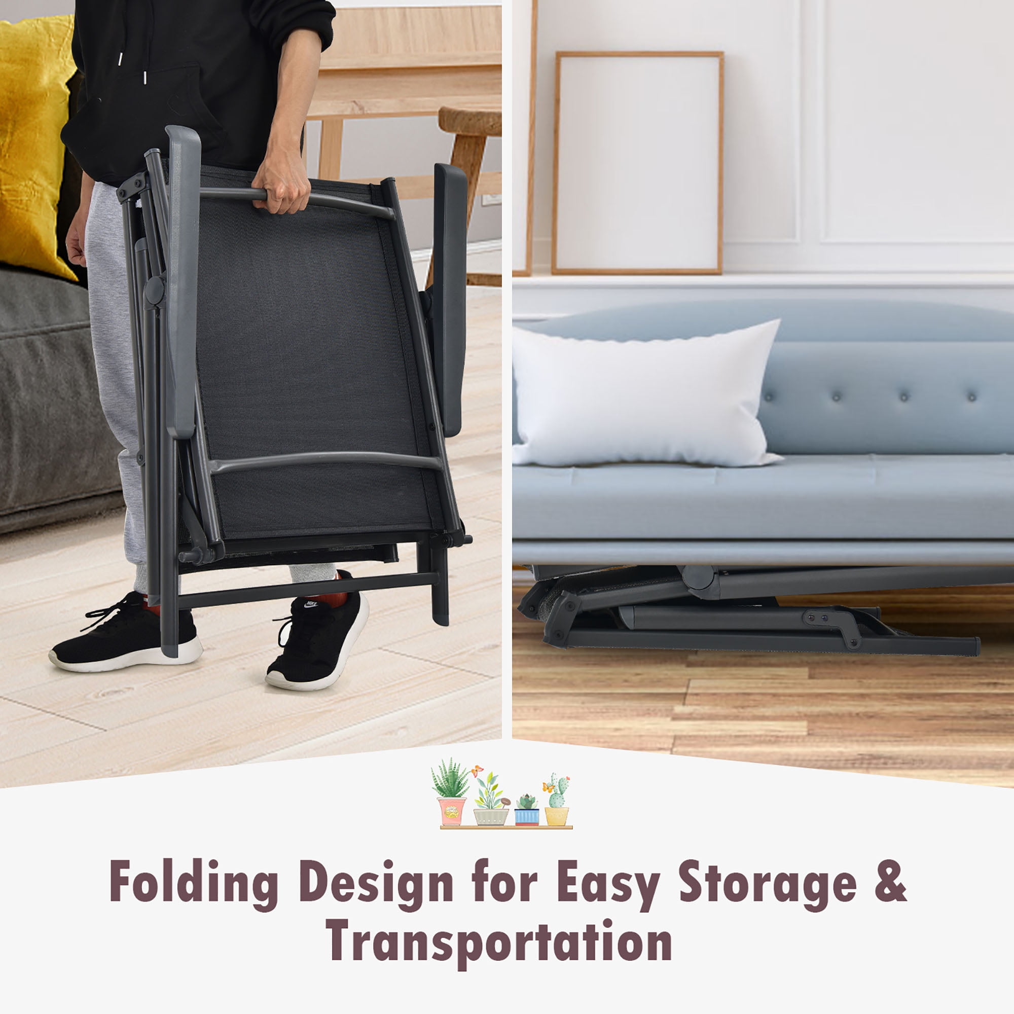 Description: Our folding chaise lounge chair is a wonderful companion for you enjoying the leisure life by the poolside, balcony, backyard and so on. Constructed from a powder-coated steel frame, the lounge chair is designed to bring outdoor spaces into extreme comfort. This lounge chair is anti-rust and waterproof, which can stand the test of time. Besides, premium fabric offers a cozy sitting experience. And you can adjust the backrest and footrest according to your needs. Plus, this outdoor lounge chair has no assembly required for your convenient use. This comfortable lounge chair will be a functional part of your daily life. Features: Heavy duty frame with powder coating can stand the test of time Premium fabric is breathable and has better durability 5-position backrest and 2-position footrest to meet your different needs Specification: Color: Black Material: Steel, Fabric Overall Dimension: 75.5”/74.5”/72”/68”/59” x 20” x 19.5”/21.5”/26”/30”/35”(L x W x H) Folding Dimension: 25” x 8.5” x 31” (L x W x H) Seat Height: 12” Net Weight: 40 lbs Weight Capacity: 330 lbs Package Includes: 2 x Patio Chaise Lounge 1 x Instruction