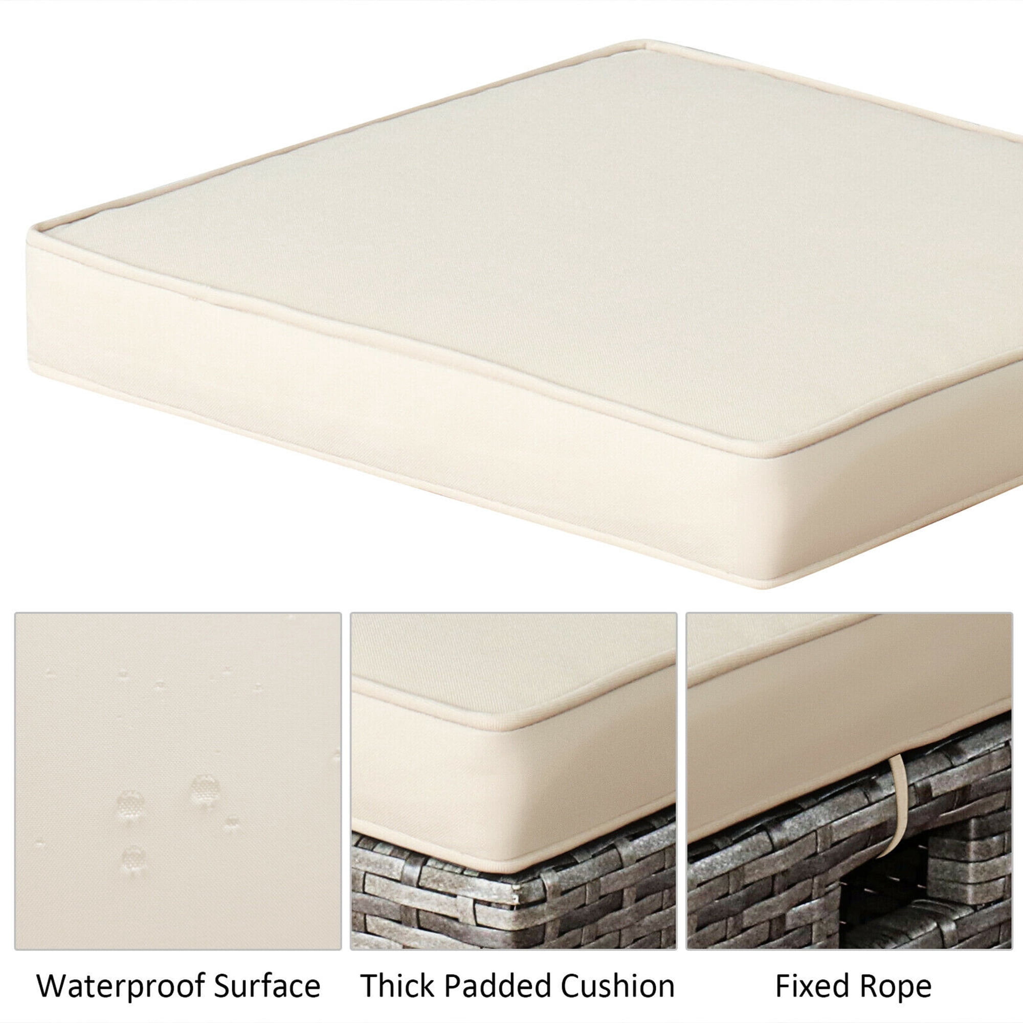 Description: If you are looking for ottomans for your patio, our 2 pieces ottomans will be your perfect choice. They are made of premium rattan and sturdy steel, which makes each of them can hold up to 350 lbs and ensures that they will serve you for a long time. Moreover, featuring soft cushions, these ottomans will provide you with comfort when you sit on them. There are ropes on the cushion to fix the seat cushion on the ottoman that making it difficult to slip off. Our 2 ottomans are ideal for both indoor and outdoor use, working as seats, footrests or coffee tables. Don’t hesitate to buy them! Features: Made of high quality steel and tight rattan, weather-resistant and durable Can serve as footrests, seats or side tables to meet your different needs Built-in handles and lightweight design make it convenient to move Cover of cushion can be taken off for washing with zipper design Simple assembly is required Specification: Color of Rattan: Mix Grey Color of Cushion: Beige Material: PE Rattan, Steel, Sponge Dimension of Ottoman: 16” x 16” x 18” (L x W x H) Dimension of Cushion: 16” x 16” x 2.5” (L x W x Thickness) Net Weight: 13 lbs Weight Capacity of Each Ottoman: 350 lbs Package includes: 2 x Ottoman 2 x Cushion 1 x Instruction