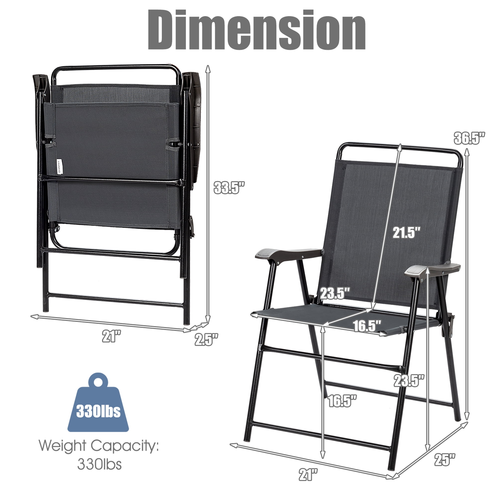 Description: Are you still looking for relaxing yet practical chairs for a big party outside? Our set of 4 patio folding chairs is perfect for your outdoor activities. Crafted of solid steel frame and breathable fabric, this folding chair is sturdy and durable for long term use. The sloping backrests make you feel relaxed and comfortable when leaning on it. More importantly, the spacious seat provides comfortable sitting experience. Besides, you can fold it in a short time when you are not using it. It is portable and easy for you to store in small area. Perfect for backyard, patio or anywhere you want to relax, this chair set is an ideal choice for you to enjoy leisure time with your family. Do not hesitate to buy one! Features: Curved armrests and reclining backrests provide ultra comfort Breathable and weather-resistant fabric material Powder-coated steel frame ensures sturdiness No assembly required and easy to clean Specification: Color: Grey Material: Steel + Fabric Overall Dimension of Chair: 21”(L) x 25”(W) x 36.5”(H) Folding Size: 21”(L) x 2.5”(W) x 33.5”(H) Height from Armrest to Ground: 23.5” Net Weight: 32.5 lbs Weight Capacity of Chair: 330 lbs Package includes: 4 x Folding Chair