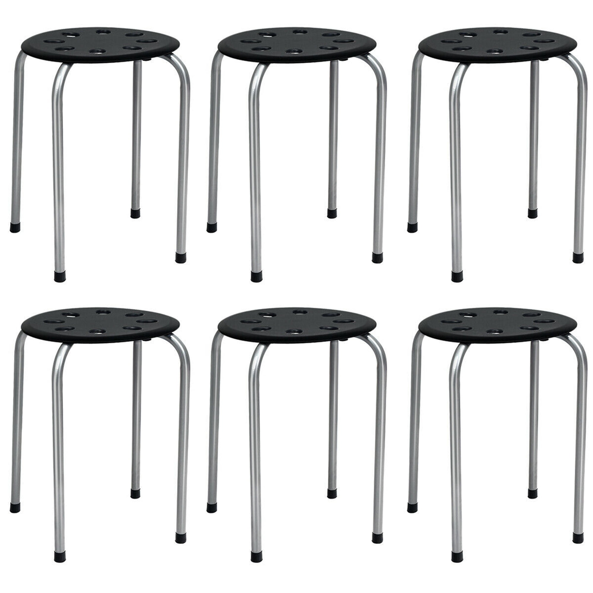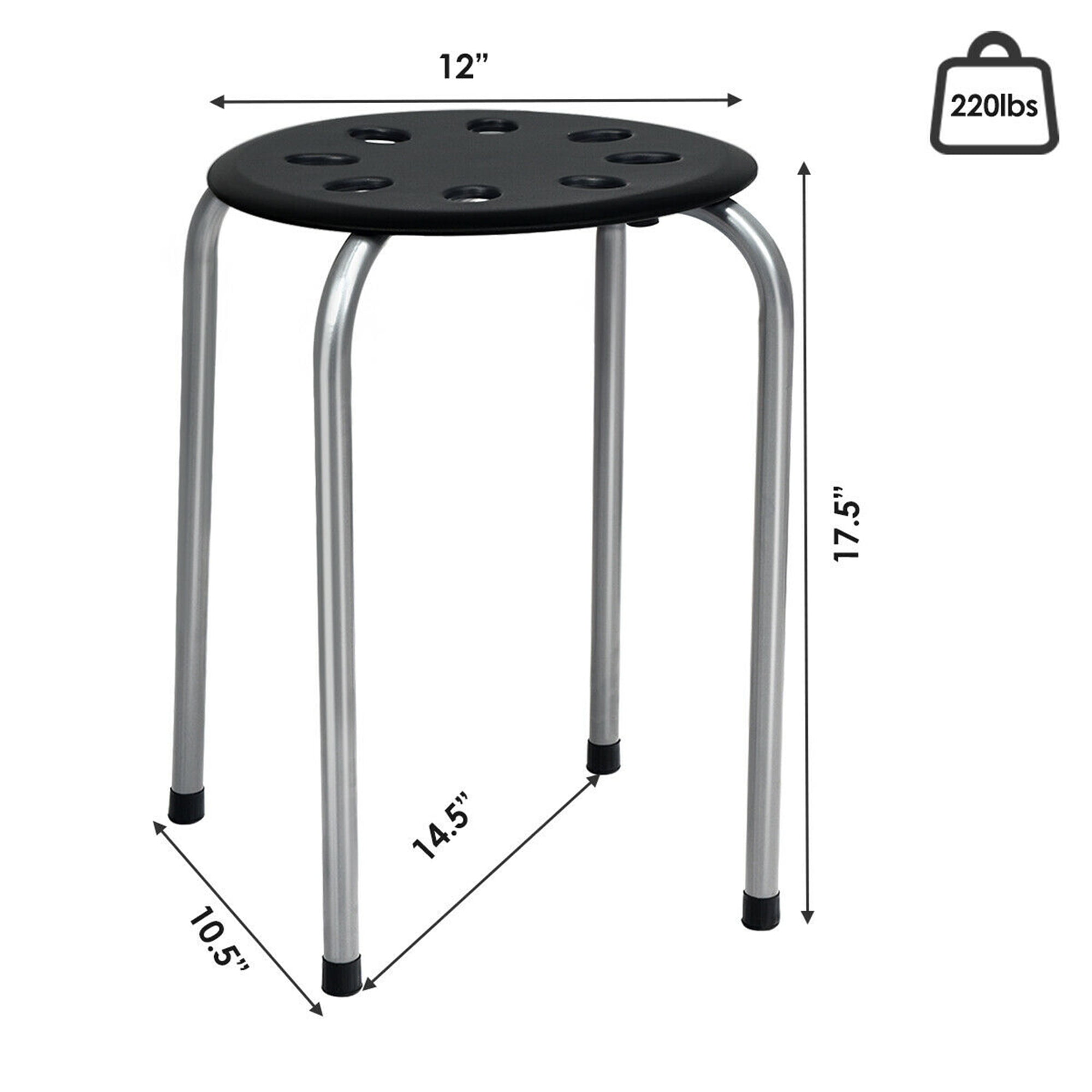 Description: Our 6 portable stools is the perfect complement to your home! The sturdy steel frame with painted finish makes these stools corrosion-resistant and durable. And X-shape structure ensures great stability and safety. PP seat with 8 breathable holes will provide a comfortable sitting feeling. Each stool is equipped with non-slip foot pads to prevent the floor from being scratched. What’s more, stackable and compact design is space-saving for easy storage. The stool set is widely used in classroom, home and office. You can use them as temporary seats for friends at parties. Features: Set of 6 stools Made of sturdy steel frame with painting to ensure good rust resistance and durability X-shaped brace under the seat to enhance its stability PP seat for easy cleaning No assembly required Specification: Color: Black + Gray Material: Steel + PP Product Dimensions: 14.5” x 14.5” x 17.5” (L x W x H) Net Weight: 16.5 lbs Weight Capacity of Each Stool: 220 lbs Package Included: 6 x Stackable Stools