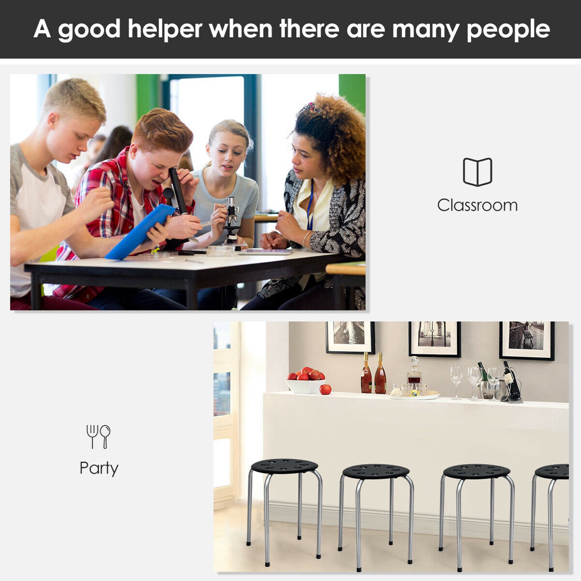 8 holes on the seat for decorative and ventilated purposes Stackable design for efficient storage and saving space Light weight for easy transportation Max weight capacity of each stool can reach 220 lbs Ideal for classroom, home, dorm room, office, etc Antiskid foot caps provide floor protection