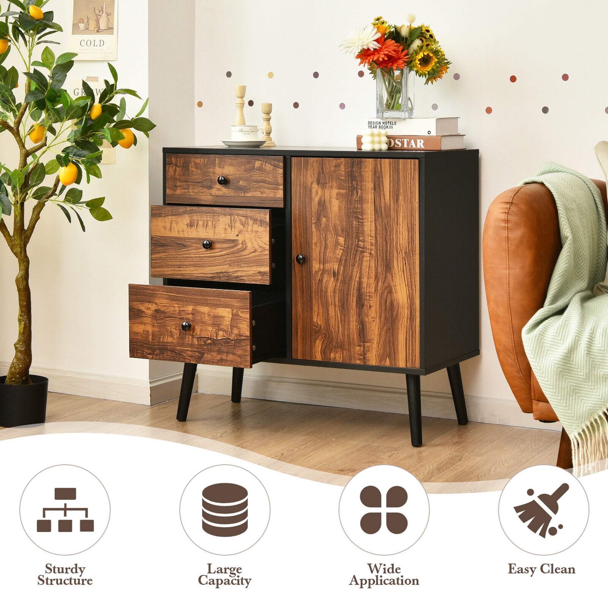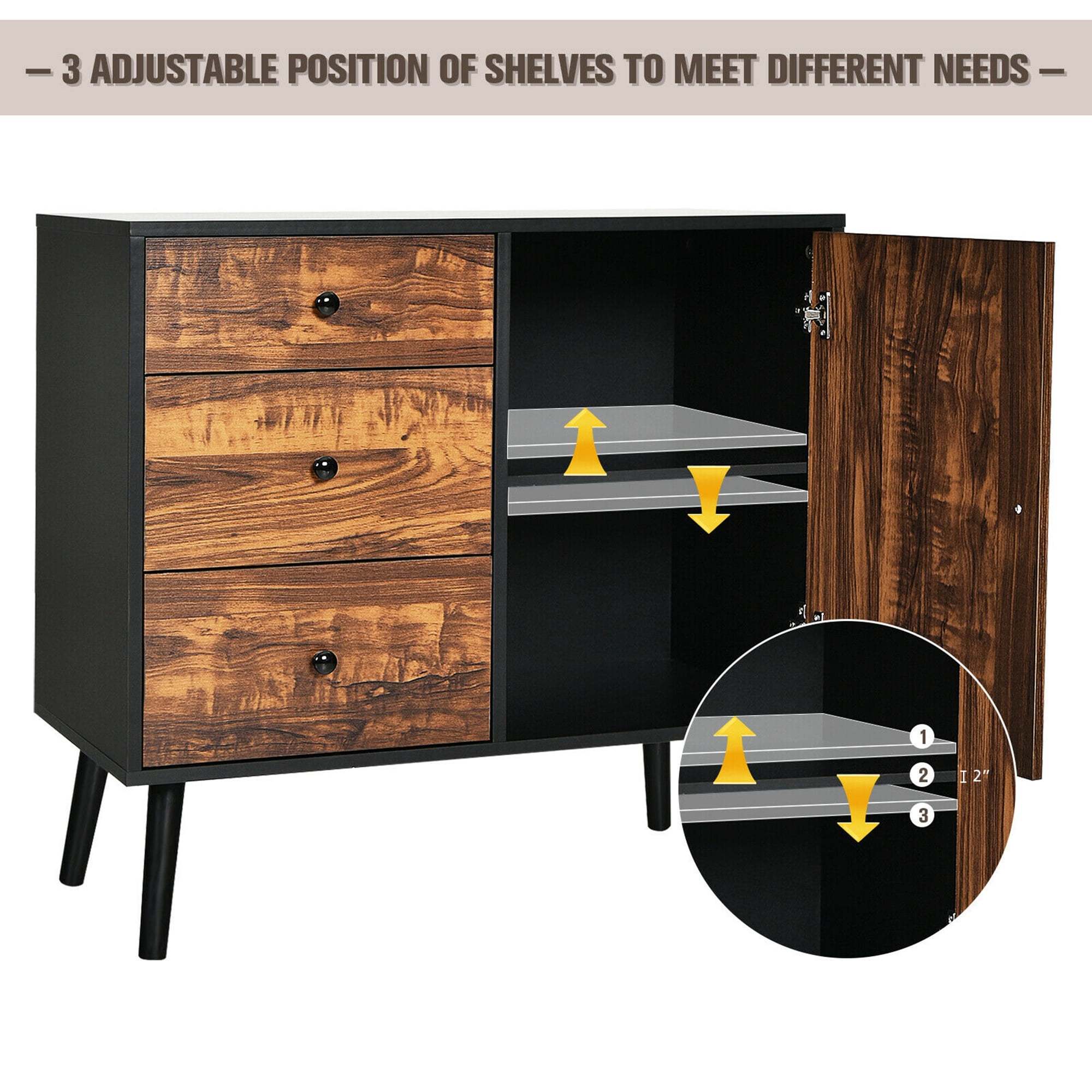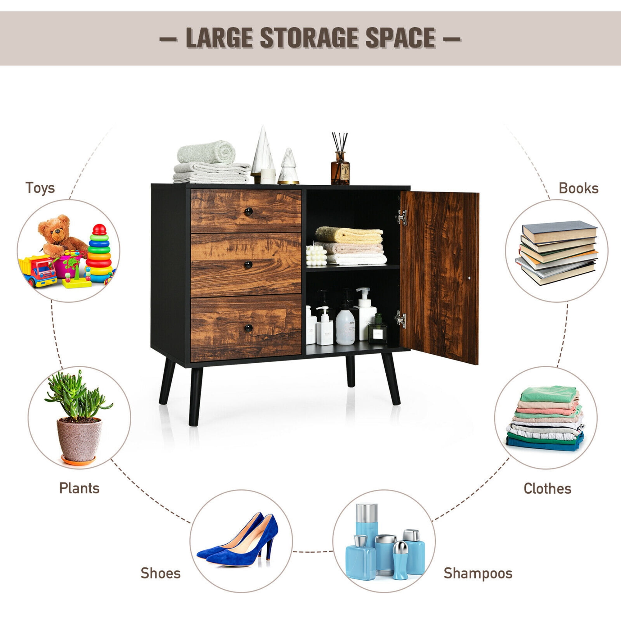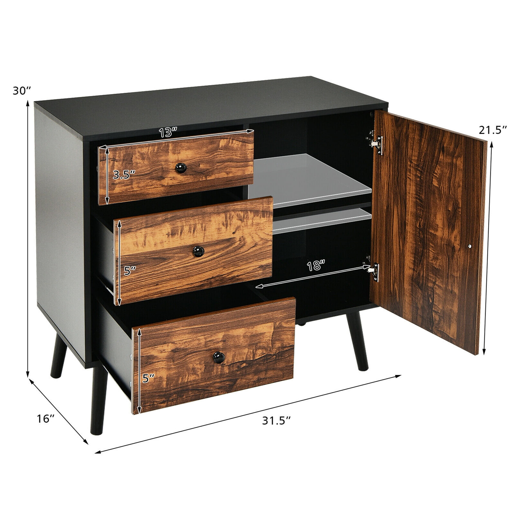 Retro Style Design: Our storage drawer cabinet features beautiful wood grain is simple and stylish. The vintage color embodies the mutual collision of industrial style and retro vibe that expected to produce a unique charm. The cabinet isn’t just the furniture to store, but also as home decoration. Selected Material: The storage cabinet with drawer is made of high quality engineered wood and 4 tilted solid wood legs that ensure durability, good balance and large load capacity up to 150lbs. The surface of storage cabinet is smooth and delicate, without any harmful odor and easier to clean. Ample Storage Space: Our functional storage cabinet is cleverly designed to meet diversifying storage demands. 3 large drawers provide plenty of private storage for your clothes, daily necessities, jewelry box, file, and keep organized. The side cabinet with height adjustable shelf is the best solution for large item storage. Multiple Application: The storage cabinet can be used as console cabinet, bookcase, night table, buffet sideboard, microwave stand and coffee bar. You can place it at anywhere you wanted- such as hallway, entryway, bedroom, living room and kitchen in home and office as an ideal storage helper and home decor Easy Maintenance: The vintage brown finish of this sideboard will create a perfect accent to your home. Moreover, it is easy to care with a simple dry cloth and will keep in delicate look. Assembly required and this sideboard measures 31.5” x 15.5” x 30”. Adjustable shelves to increase your storage space Equip with anti-dumping device for enhanced safety Ideal for kitchen, living room, bedroom, bathroom, bar, bookstore With detailed instructions and simple maintenance requirements