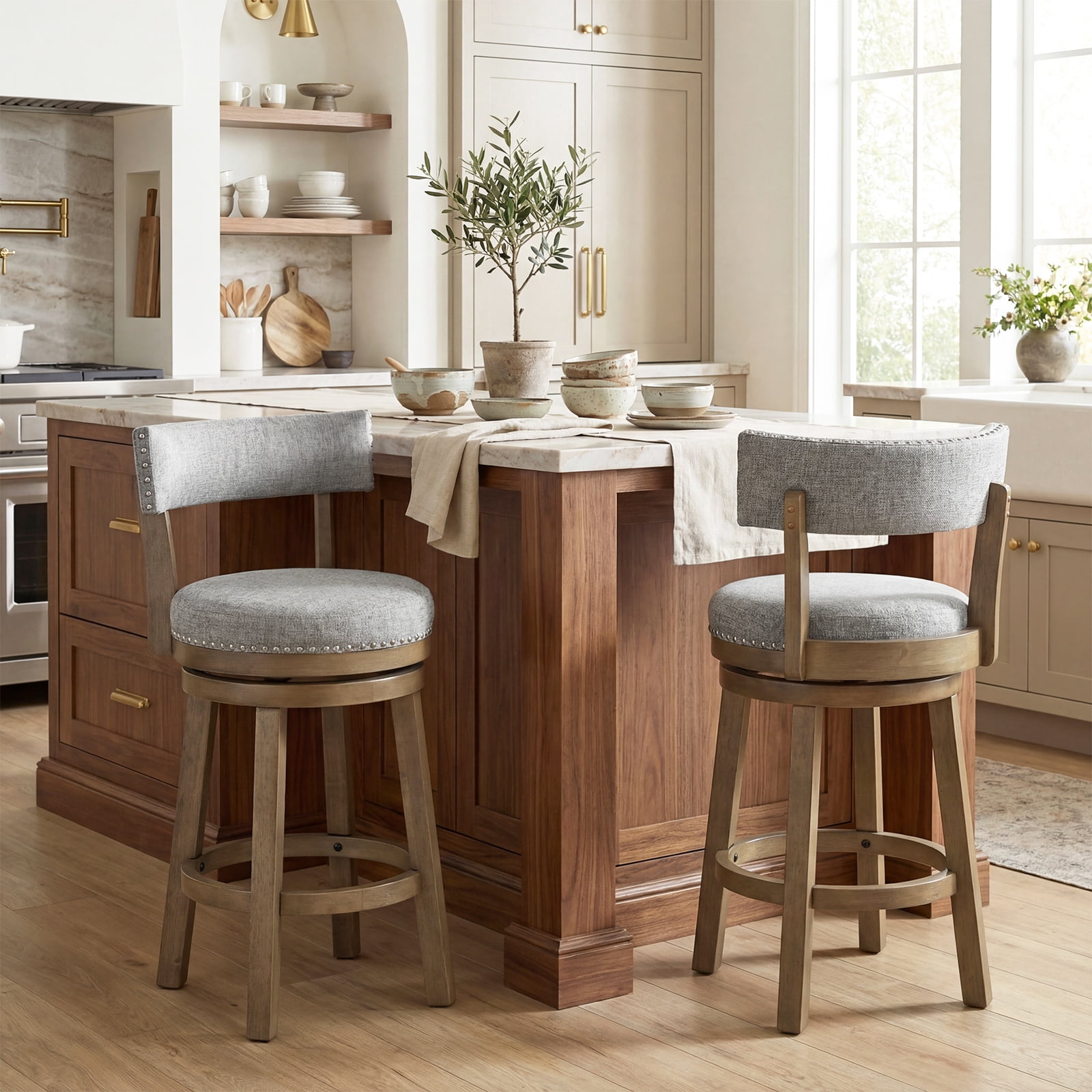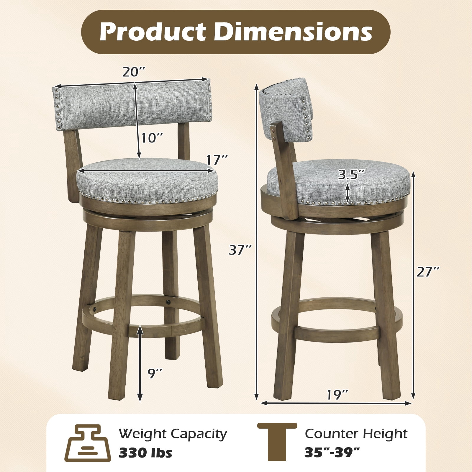 Gymax Swivel Upholstered Bar Stools, Gray Fantastic sitting experience with a curved backrest and a thick 5” cushion for ultimate comfort Premium rubber wood legs provide durability and support, with a weight capacity of up to 485 lbs 360° swivel seat allows for easy movement and direction changes, complemented by a round footrest for added relaxation Stylish design featuring decorative nailhead trim, making it suitable for various settings like kitchens, dining rooms, or living rooms Simple installation process with clear instructions included; overall dimensions: 21” x 19” x 36.5” (L x W x H), seat height: 27 in Breathable and skin-friendly fabric cover enhances comfort during use Considerate footrest design for additional leg support Elegant nailhead detailing adds charm to the overall aesthetic