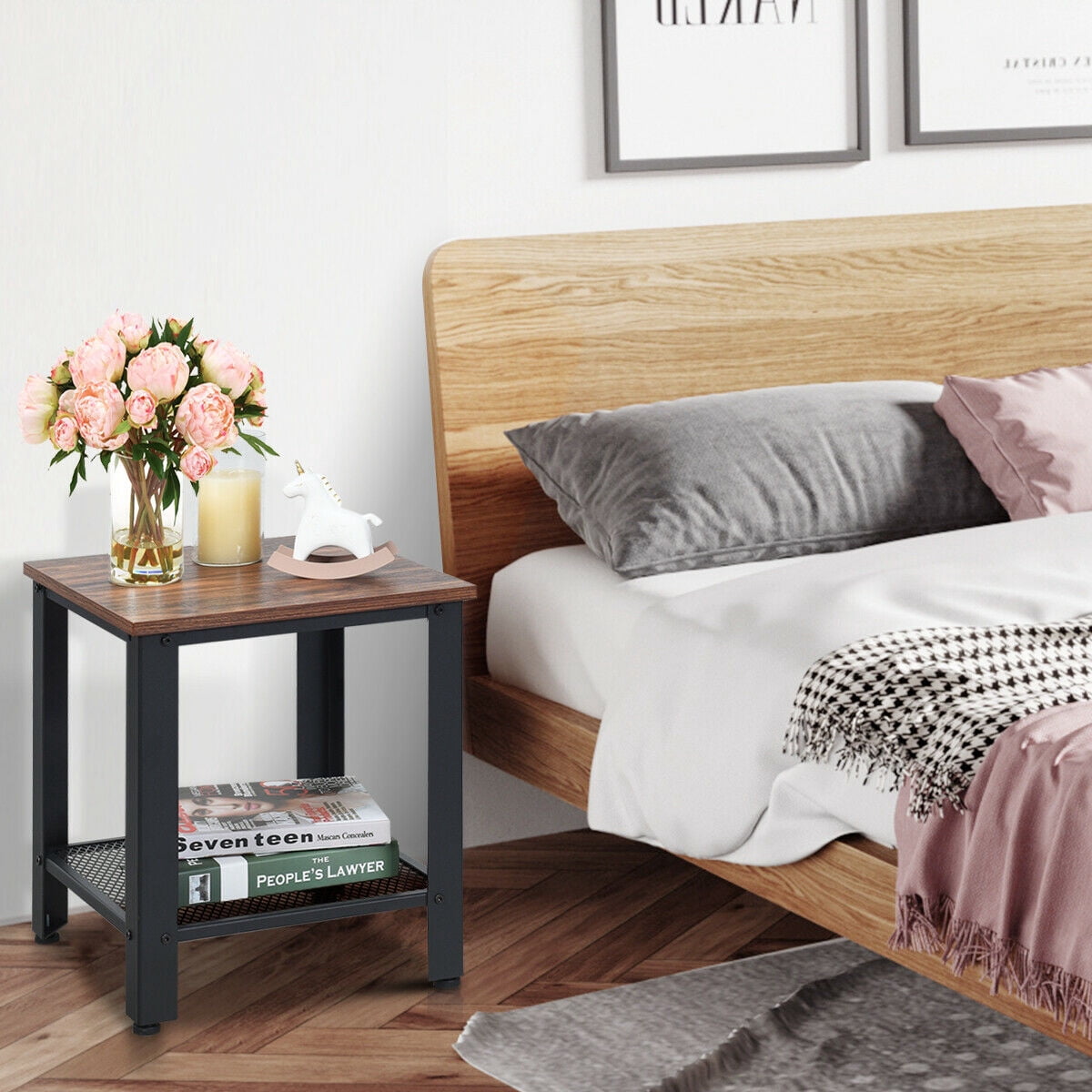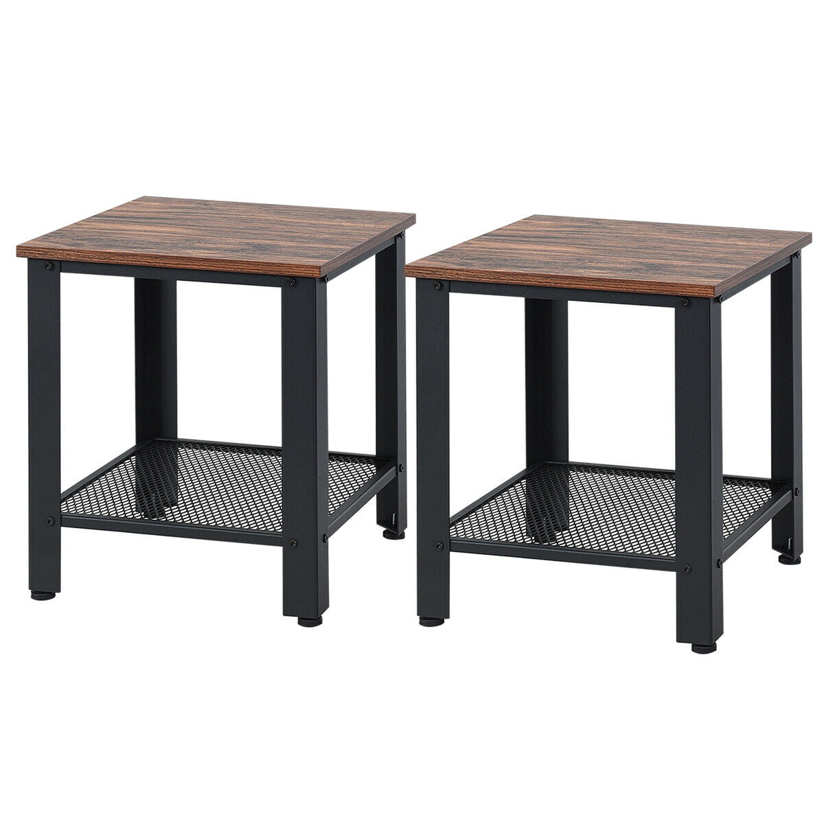 Gymax Wood and Metal Side Table (Set of 2), Brown/Black