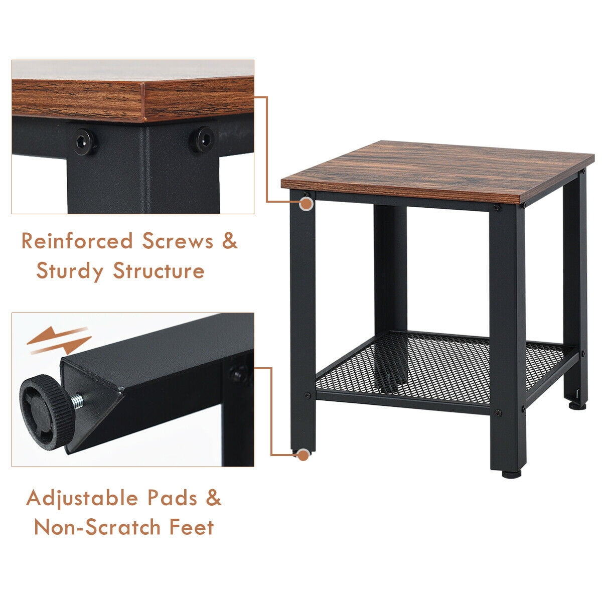 Features: Constructed with strong steel and solid wood, the whole frame is sturdy and durable Four adjustable knobs under the leg of the table to adapt to rough ground Equipped with a netlike lower shelf to give you additional storage space The side table has a large weight capacity and is stable to provide long time service Easy to assemble by yourself in a short time according to instructions Color: Black Materials: Wood and Iron Product Size: 16″ (L) x 16″ (W) x 18″ (H) Product Weight: 12 lbs Weight Capacity of Tabletop: 55 lbs Weight Capacity of Shelf: 55 lbs Package includes: 2 x Side table 1 x Instructions