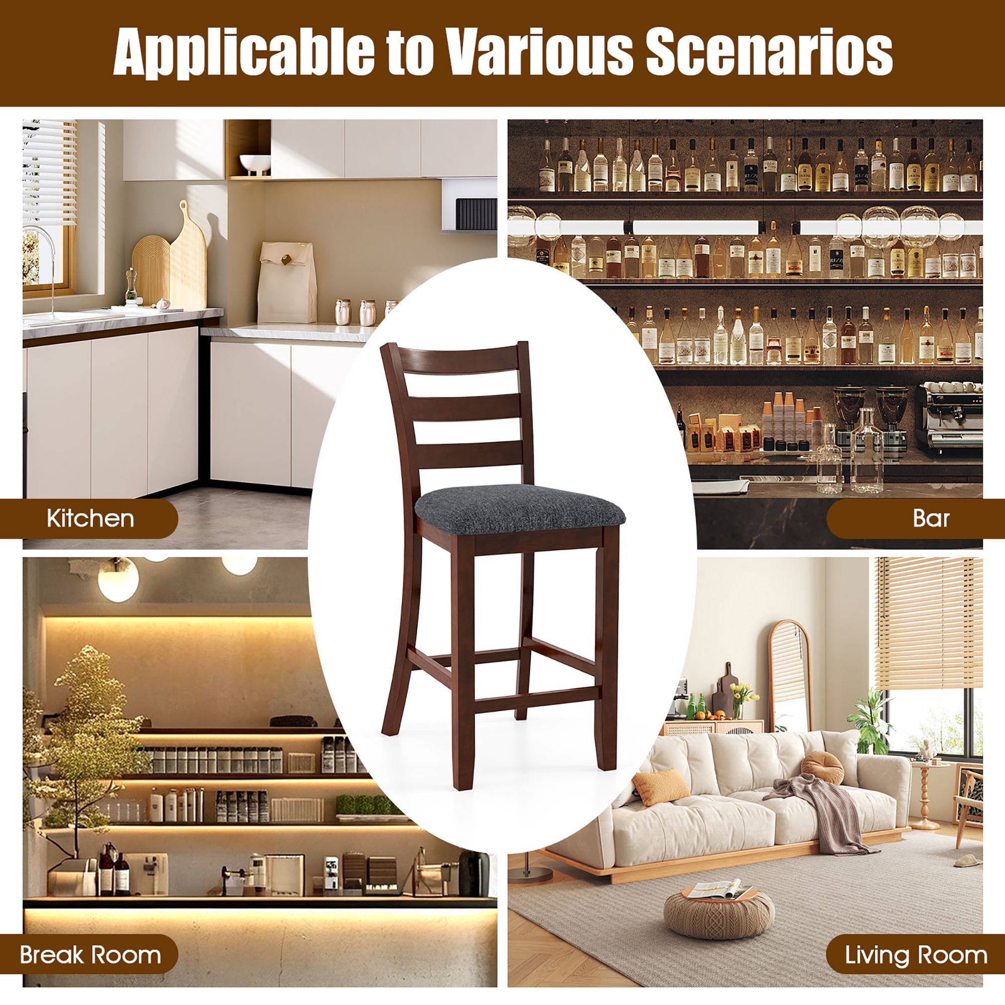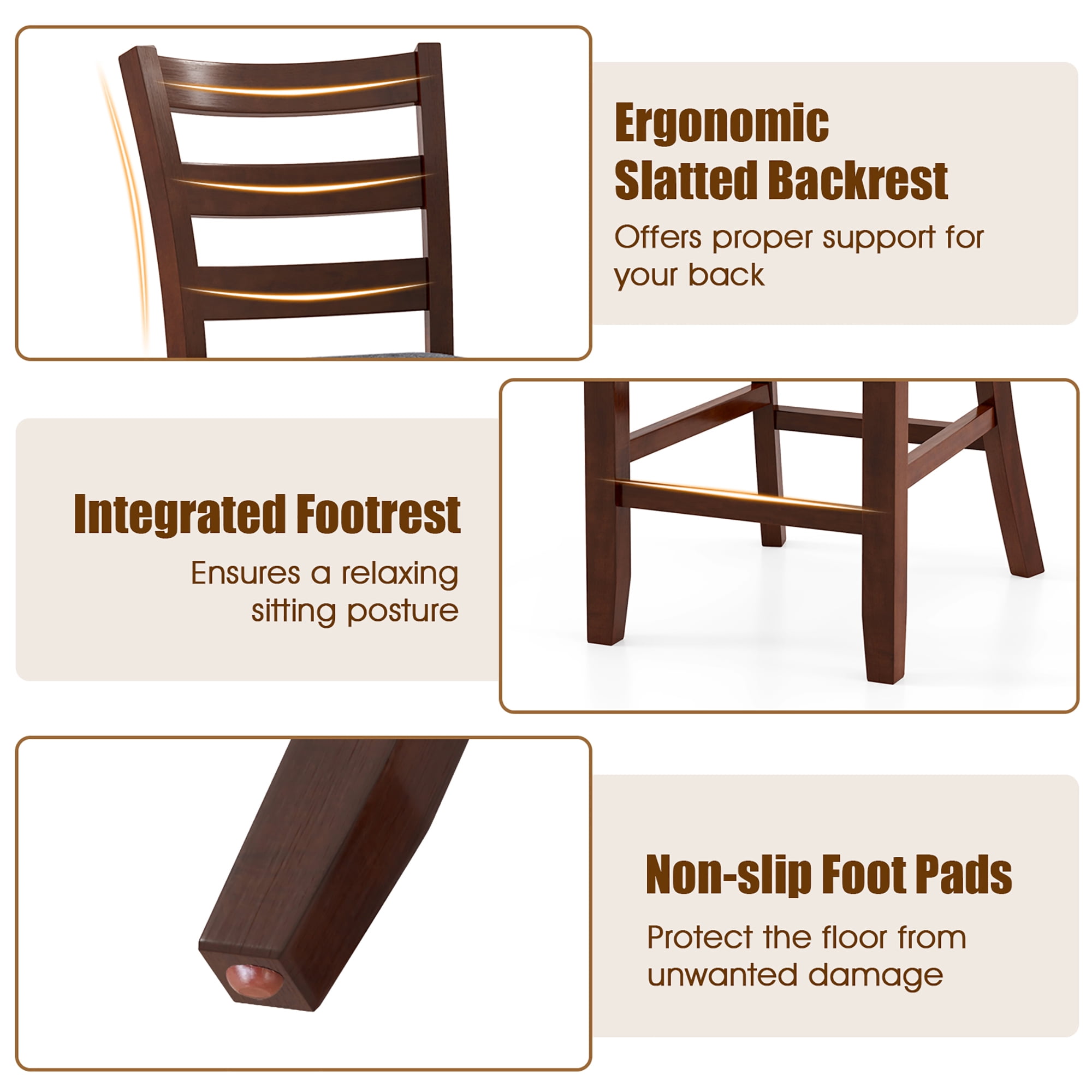 Sturdy Wooden Structure: The rustic counter height chairs are crafted with premium natural rubber wood, known for its stability and toughness, ensuring a long service life. Furthermore, each leg is equipped with anti-slip pads to prevent any damage to your flooring while in motion. Upholstered Seat Adds Coziness: The wood bar stools are upholstered in breathable linen fabric to prevent sultriness on hot summer days. Also, the wear-resistant upholstery ensures extended use. Additionally, the sponge filling adds a soft touch for a more comfortable sitting experience. Ergonomic Design: Equipped with a gently curved and slanted slatted backrest, the pub stools set of 2 helps to alleviate stress for a more enjoyable seating experience. Plus, the footrest allows you to relax and maintain a comfortable position while seated, promoting good posture. Multi-scene Application: Featuring rustic brown finish and gray upholstery, the barstools complement both modern and farmhouse decorating style. Whether used in restaurant, dining room, or bistro, the counter height bar stools will effortlessly enhance the vibe of your space. Product Dimensions: The overall dimensions of the 2 pack bistro stools are 20.5” x 17” x 39”(L x W x H ). The seat measures 17” x 16.5”, and the seat height is 26”. Each chair can accommodate up to 310 lbs. Integrated footrest ensures a relaxing sitting posture Non-slip foot pads protect the floor from unwanted damage Applicable to various scenarios, such as bar, restaurant, living room Assembly needed