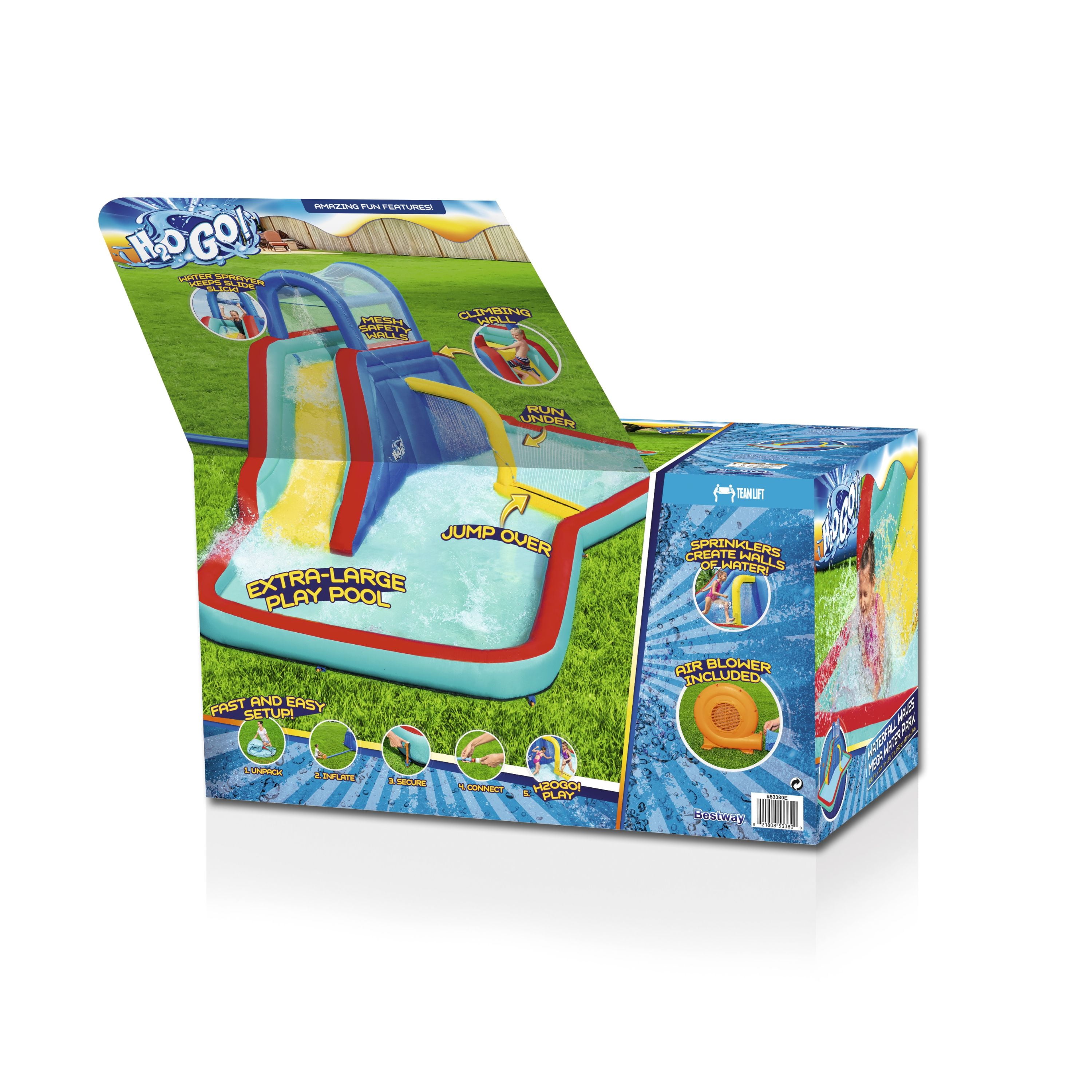 H2OGO! 110-120V air blower inflates the water park in 2 minutes Double-stitched material for increased durability Top Platform Weight Capacity: 120 lbs Climbing wall with easy-grab padded handles 2 sprinkler bars for ducking under or jumping over Children ages 5 and up Large splash pool keeps kids engaged as they wait their turn on the slide Built-in sprayer keeps the water slide slippery and fun Water Capacity: 465 gal. (1,760 L) Safe and sturdy slide with mesh walls for parent visibility Contents: 1 slide, 1 blower (stakes included), 1 repair kit (multiple assorted patches), 1 storage bag, 10 bouncer stakes, 1 water spraying hose