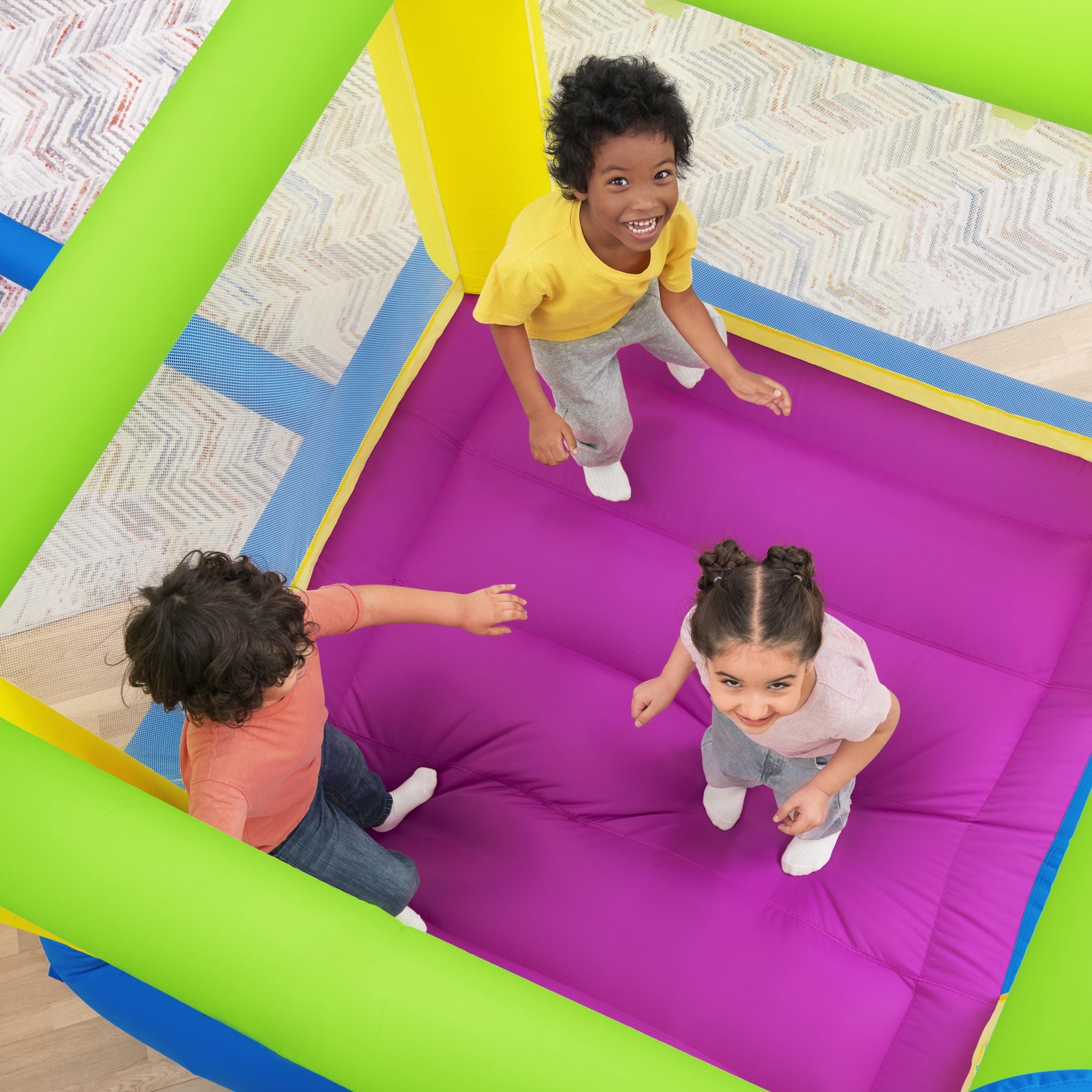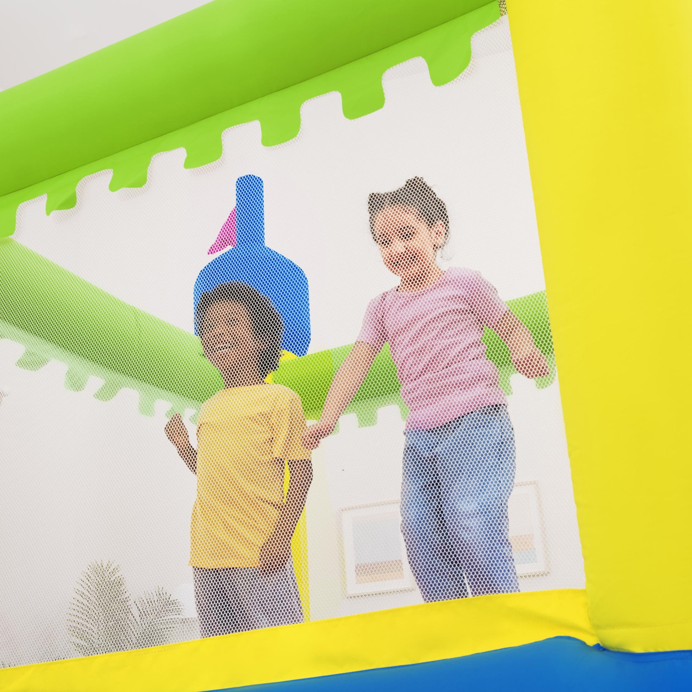 Size: 8 ft. 6 in. x 5 ft. 11 in. x 6 ft. 10 in. (2.60 m x 1.80 m x 2.08 m) Included blower inflates the bouncer in 2 minutes Extra-wide slide attached to the single entry/exit point Mesh safety walls allow parents to see kids at all times Double-stitched material for increased durability Designed for indoor or outdoor use for all year fun Maximum Weight Capacity: 160 lbs (72 kg) Contents: 1 bouncer, 1 blower, 1 repair kit, 1 storage bag, 9 bouncer stakes