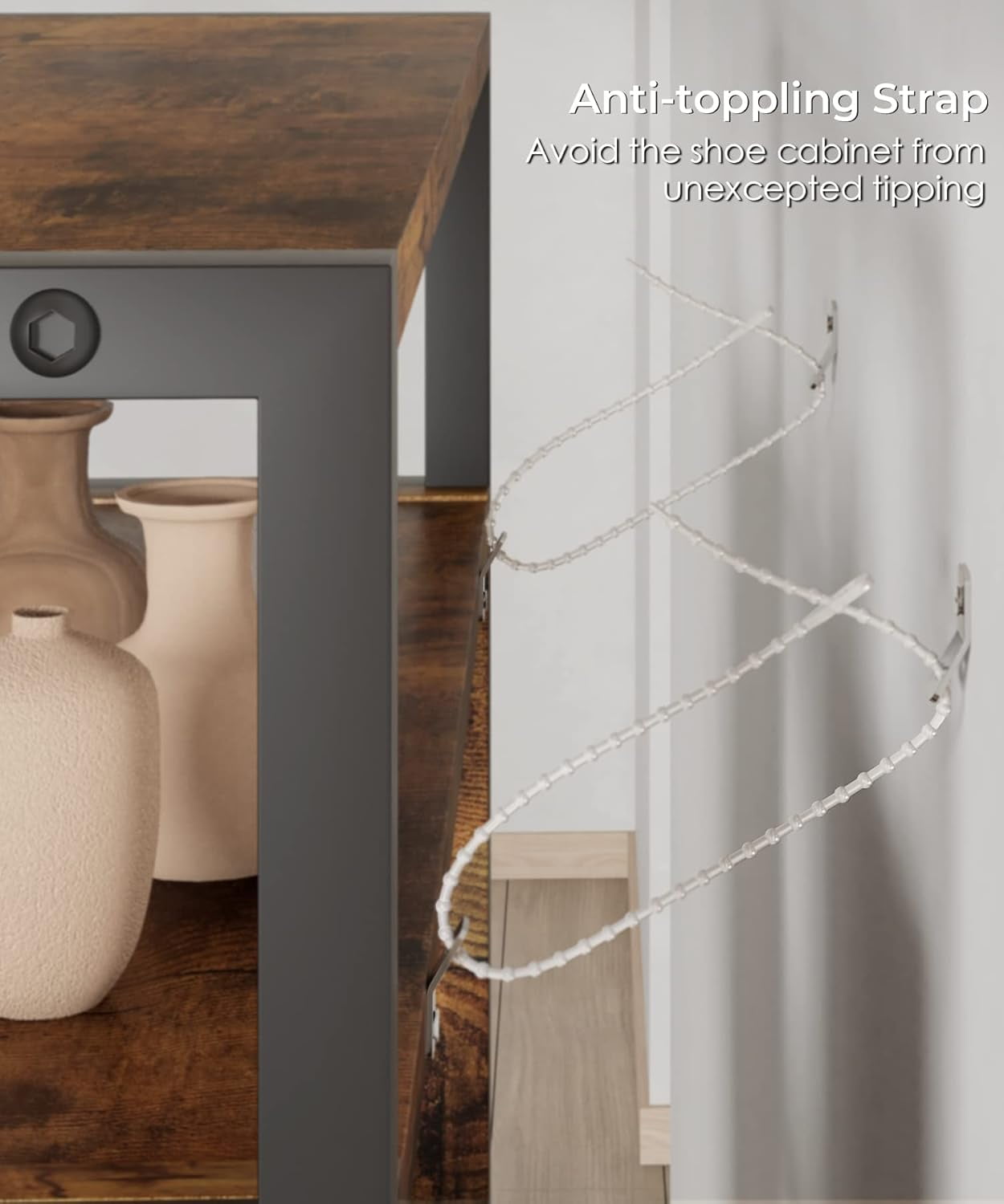 ① A Sleek Piece In Your Home Rustic brown wood and black steel blend to create a slim industrial shoe cabinet that adds both storage and vintage charm to your entryway or hallway. ② Space Saver & Ample Storage This tall shoe cabinet has 3 flip drawers with removable dividers, storing 15–18 pairs while taking up minimal floor space—perfect for tight entryways. ③ Ideal Shoe Organizer Say goodbye to shoe clutter—this narrow cabinet keeps entryways and closets tidy, making it an ideal choice for small apartments or compact spaces. ④ Safety Always Matters Equipped with adjustable feet for stability on any floor and anti-tip kit to prevent falls—perfect for homes with active kids or pets. ⑤ Additional Storage Shelves Top and bottom open shelves offer extra space for decorations, small essentials, or everyday items like bags, books, or keys. ⑥ Premium Metal Handles Each drawer features sleek black steel handles, ensuring easy, smooth operation and durability—no flimsy plastic parts here.
