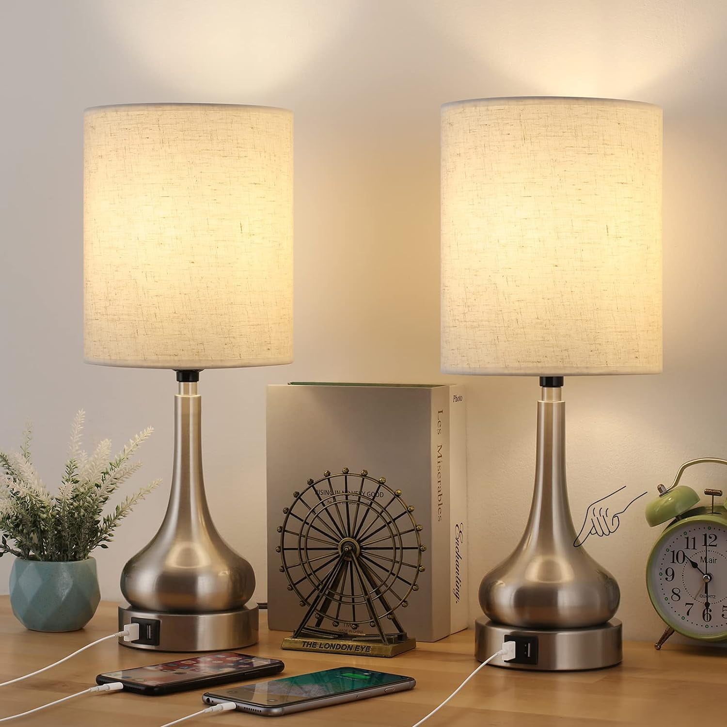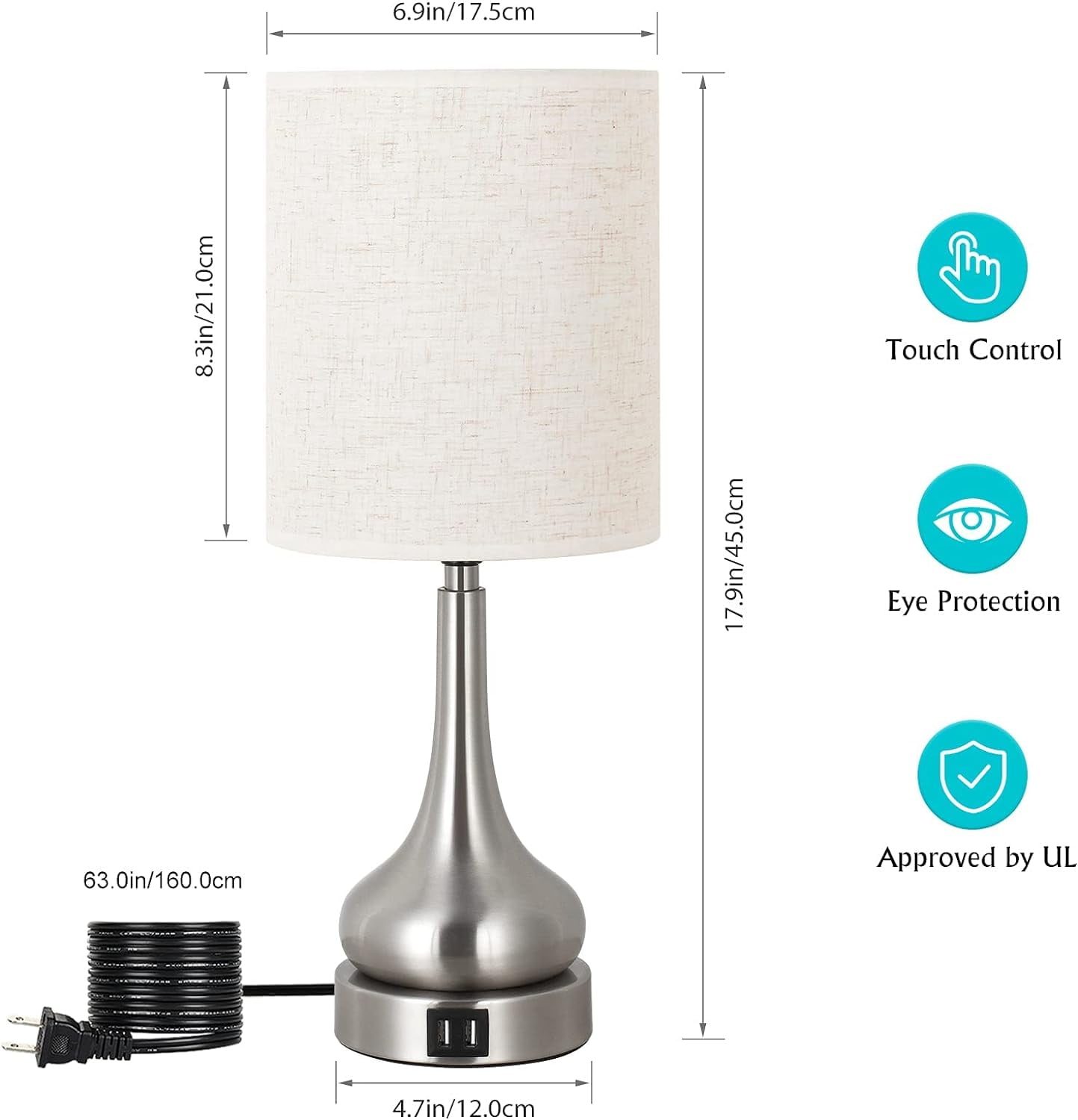 Haitral 17.9” Bedroom Touch Control Metal Table Lamp with Linen Shade Haitral 17.9” Bedroom Touch Control Metal Table Lamp with Linen Shade Touch Switch Design: Effortlessly turn on the lamp with a simple touch on the lamp body, ensuring a noiseless operation Dual USB Charging Port: Equipped with dual USB ports to conveniently charge your mobile devices, keeping your desktop organized and free from tangled cables High Quality: Features a sturdy sand nickel colored metal base with a unique “radish” shape and non-slip pads for enhanced stability and durability Safety and Reliability: UL certified components ensure quality and safety; the linen lampshade reduces glare, protecting your eyes from harsh light Easy Assembly: with dimensions of 17.9 x 6.9 x 6.9 inches, this lamp is simple to assemble, saving you time and effort
