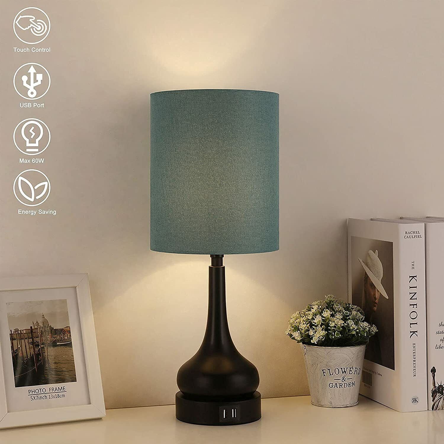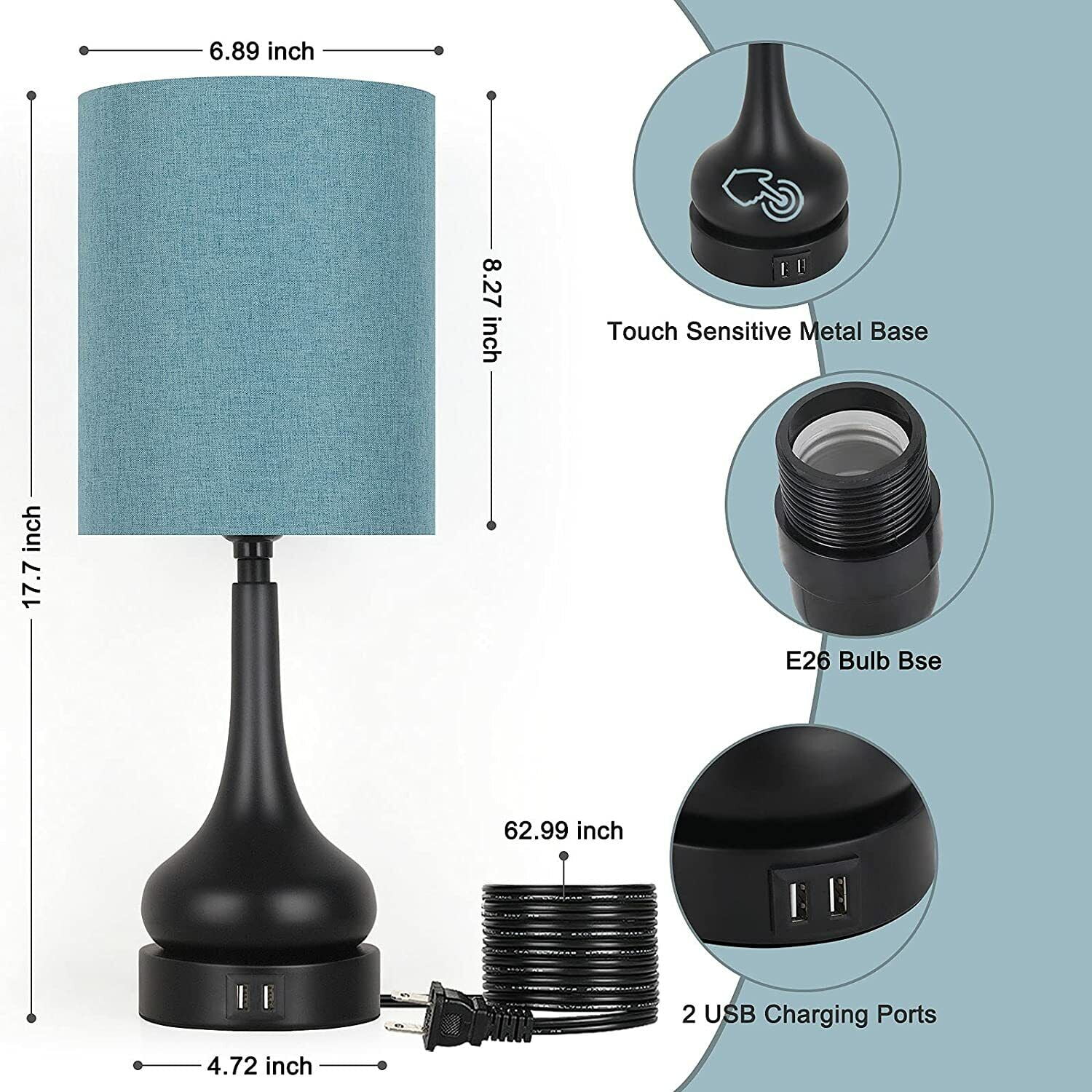 Haitral 17.9″ Modern Table Lamp with Blue Shade (2 Count) Touch Switch Design: Effortlessly turn on the lamp with a simple touch on the body, ensuring a noiseless operation Dual USB Charging Port: Charge your mobile phone, Kindle, Bluetooth stereo, humidifier, and other electronic devices with dual USB ports, keeping your desktop tidy and organized High Quality: Crafted with a sand nickel-colored metal base, featuring a unique “radish” shape and nonslip pads for stability and durability Safety and Reliability: UL-certified plug, lamp base, and cord ensure quality and safety. The linen lampshade reduces glare, effectively protecting your eyes Easy Assembly: with dimensions of 17.9 x 6.9 x 6.9 inches, this bedside table lamp is simple to assemble, saving you time and effort