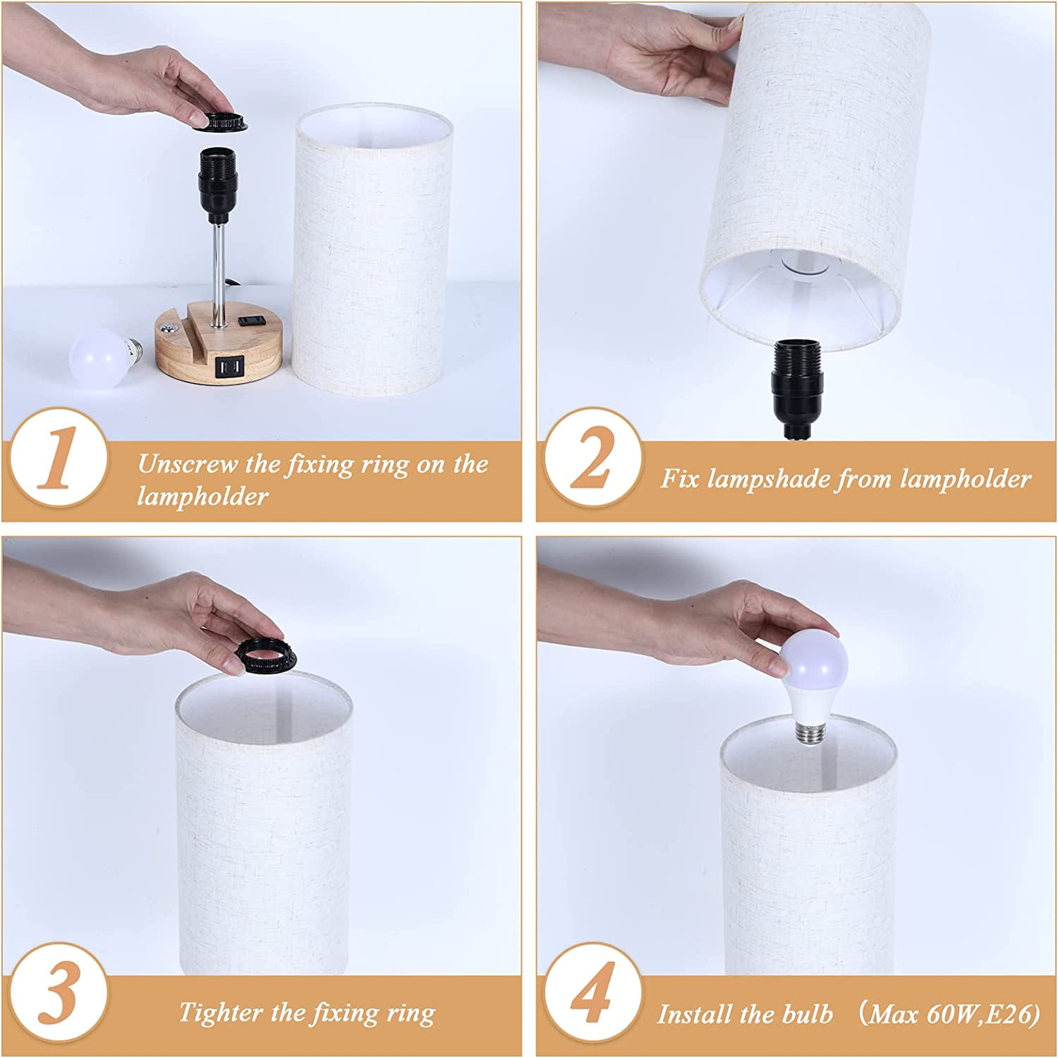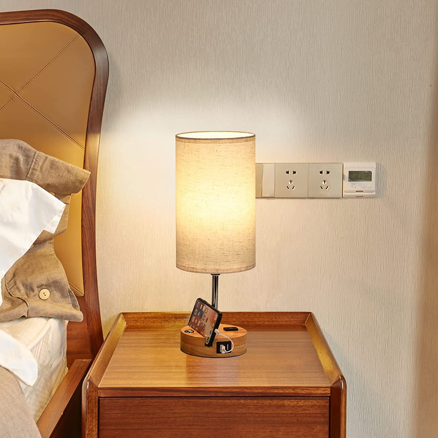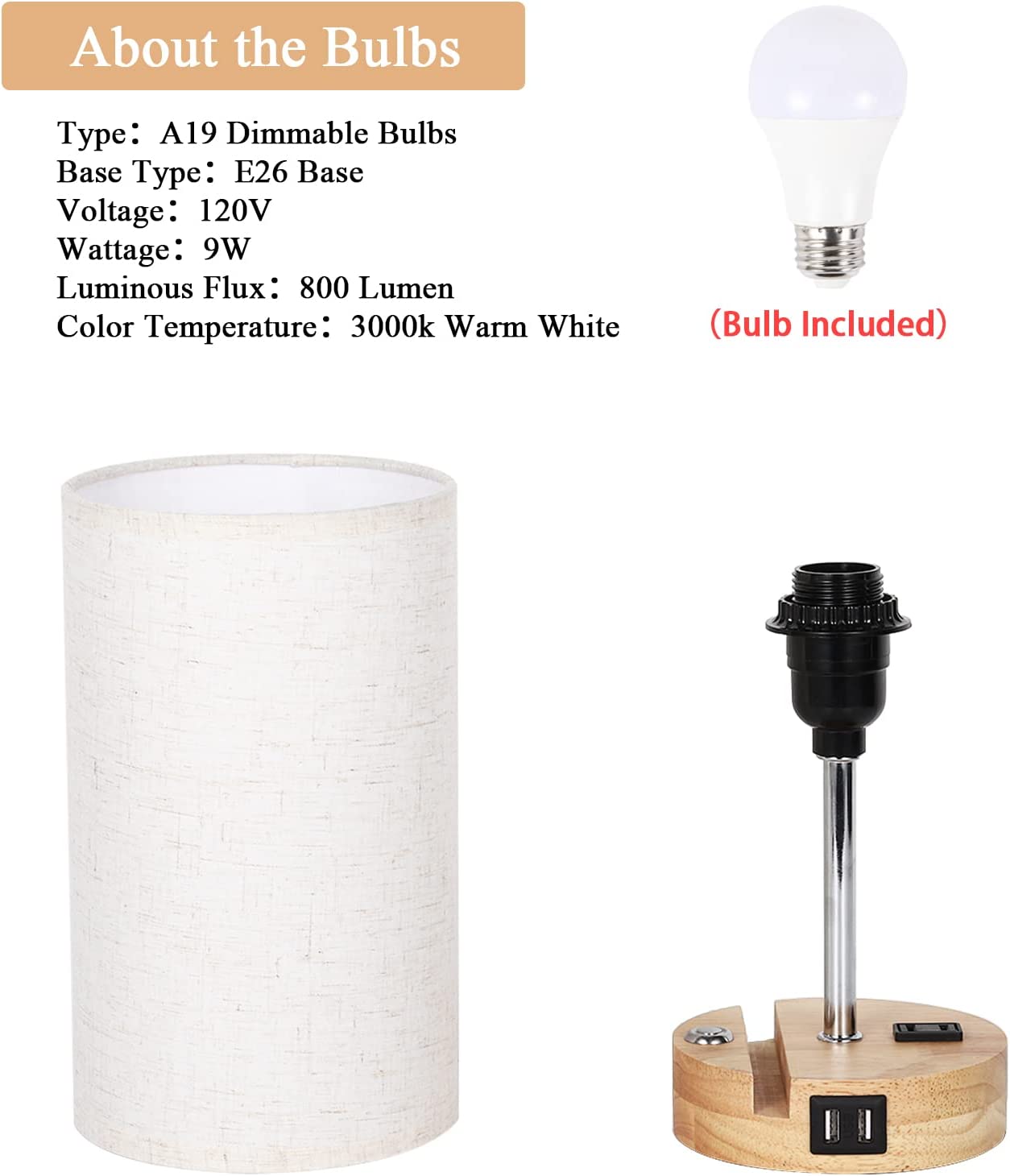 [3 Way Dimmable Touch Control] Our bedside table lamp with solid wood base comes with 3 levels of brightness options (low, medium, high), just tap the touch dimmer button on the lamp base to adjust the lighting to meet your comfortable brightness needs for study or work, which sensitive touch function makes it very user-friendly. [2 Super Bright Edison LED Bulbs] The USB Lamps include Two Edison Dimmable A19 9W LED Bulbs without flicker and glare. To perfect match the touch control dimmable table lamp, with the linen lampshade with good light transmission, it protects you and your family’s eyes from eye strain and save energy. [Perfect Mobile Phone Stand Design] Our lamp holder has a specially designed card slot, which can put the mobile phone on the base when charging the mobile phone/watching movies, which greatly reduces the use of space. [Practical AC Outlet &Dual USB Ports] Built-in dual USB charging ports (5V/2.1A) on lamp base. Convenient to charge your devices. Such as mobile phones, tablets, kindle readers, speaker, diffuser, and other electronic devices. These USB ports can be used regardless of whether the lamp is on or off. Besides, a useful AC power outlet was added on the base. Please note don’t use the electric appliances with power more than 800W.