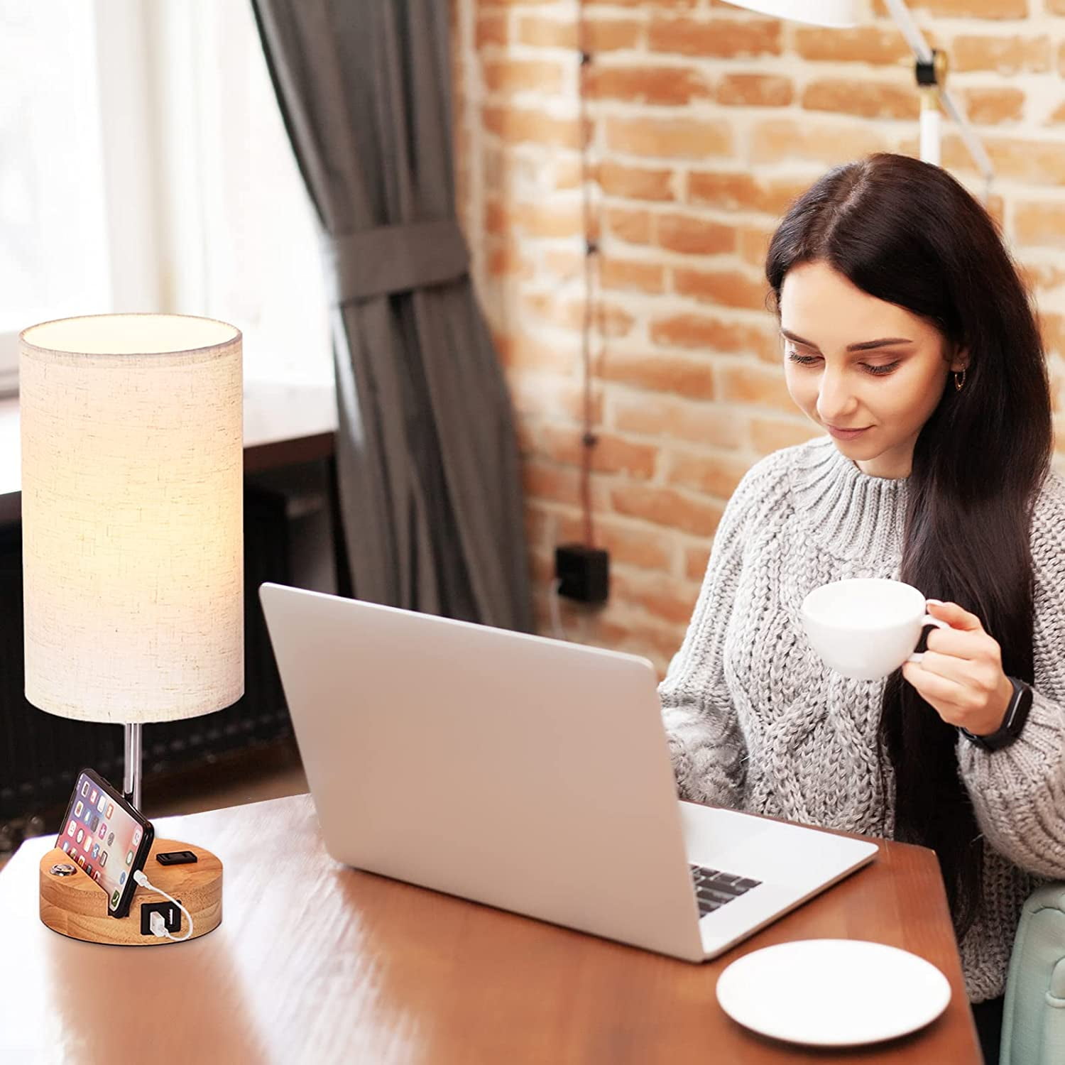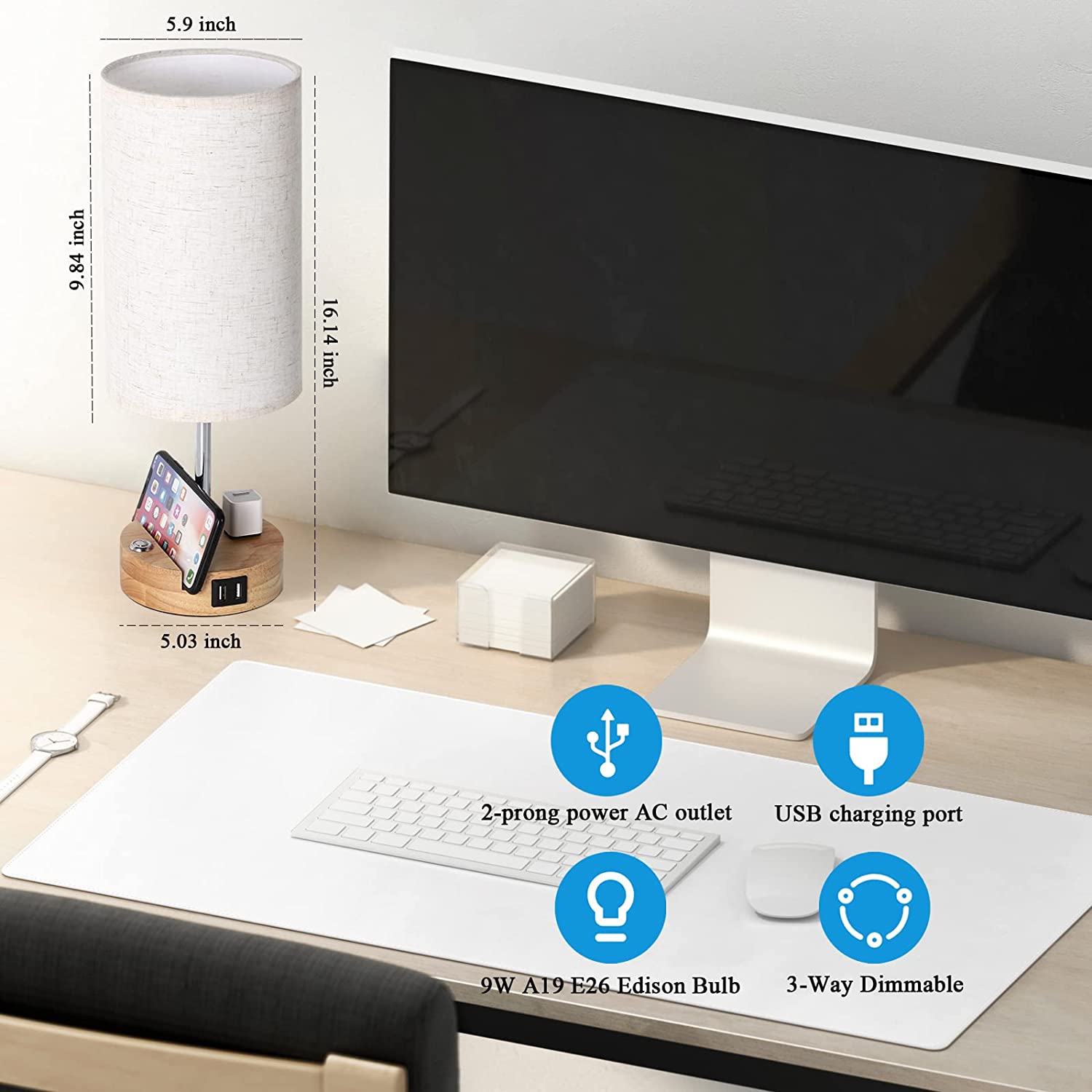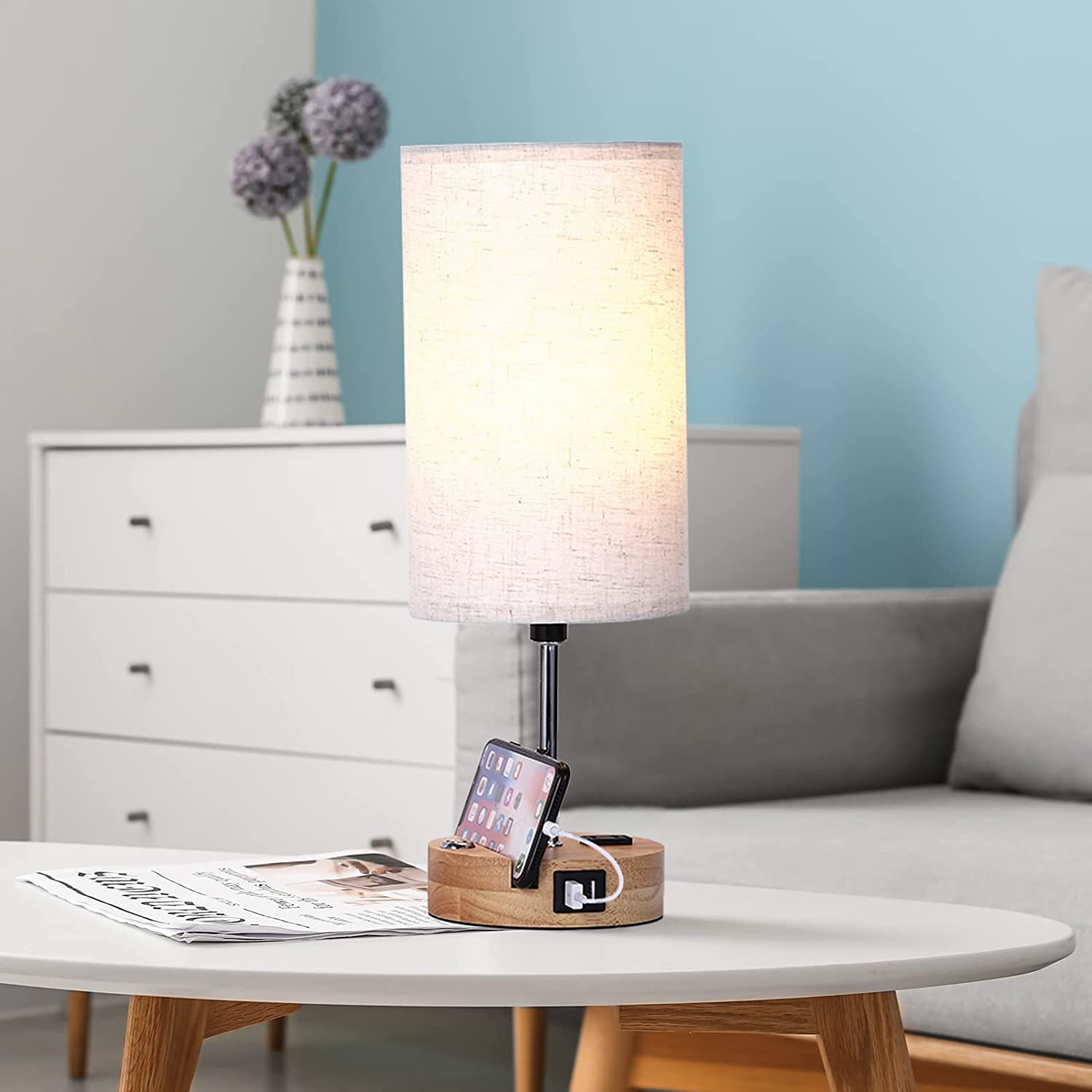 [3 Way Dimmable Touch Control] Our bedside table lamp with solid wood base comes with 3 levels of brightness options (low, medium, high), just tap the touch dimmer button on the lamp base to adjust the lighting to meet your comfortable brightness needs for study or work, which sensitive touch function makes it very user-friendly. [2 Super Bright Edison LED Bulbs] The USB Lamps include Two Edison Dimmable A19 9W LED Bulbs without flicker and glare. To perfect match the touch control dimmable table lamp, with the linen lampshade with good light transmission, it protects you and your family’s eyes from eye strain and save energy. [Perfect Mobile Phone Stand Design] Our lamp holder has a specially designed card slot, which can put the mobile phone on the base when charging the mobile phone/watching movies, which greatly reduces the use of space. [Practical AC Outlet &Dual USB Ports] Built-in dual USB charging ports (5V/2.1A) on lamp base. Convenient to charge your devices. Such as mobile phones, tablets, kindle readers, speaker, diffuser, and other electronic devices. These USB ports can be used regardless of whether the lamp is on or off. Besides, a useful AC power outlet was added on the base. Please note don’t use the electric appliances with power more than 800W.