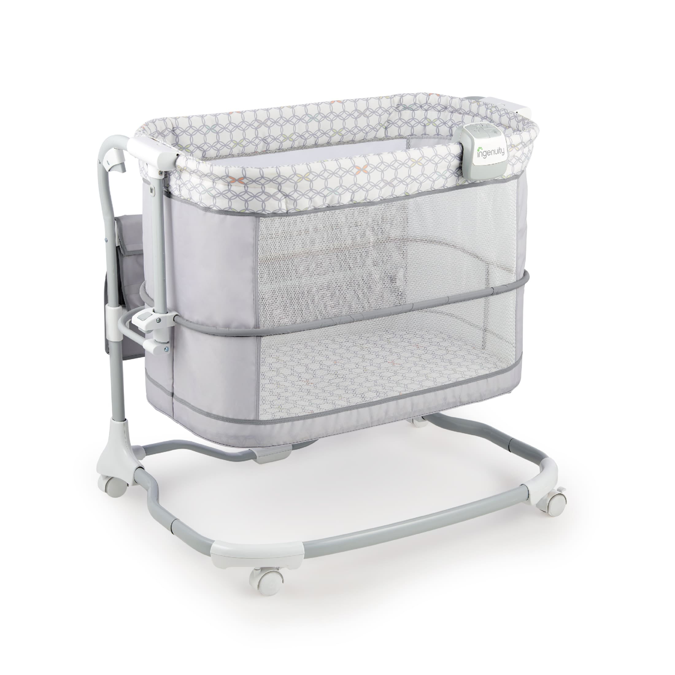 Safely sleep next to your baby without bedsharing Swivels over your bed for extra close sleep Lowering wall for easy access; no bending or twisting 2-in-1 design converts from bassinet to portable nest 2 vibration levels and 4 calming sounds; with auto-shutoff Soft amber nightlights to see your babe in the dark Soothing system requires 3 AA batteries (not included.) Mesh walls zip off for machine washing Height-adjustable base accommodates beds up to 33” Removable storage caddy to keep their essentials close Fitted sheet and mattress pad included Compatible with all BassiNest accessories Mesh walls and sleep area: 100% polyester Mattress: 100% polyester cover with 100% polyurethane foam core For babies up to 20 lbs