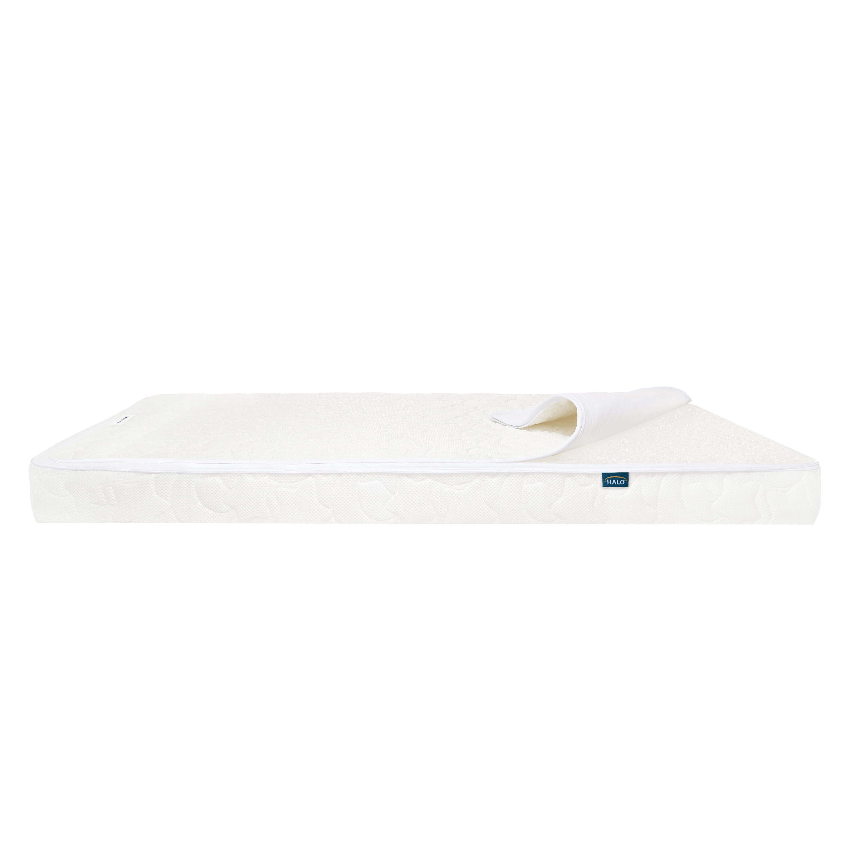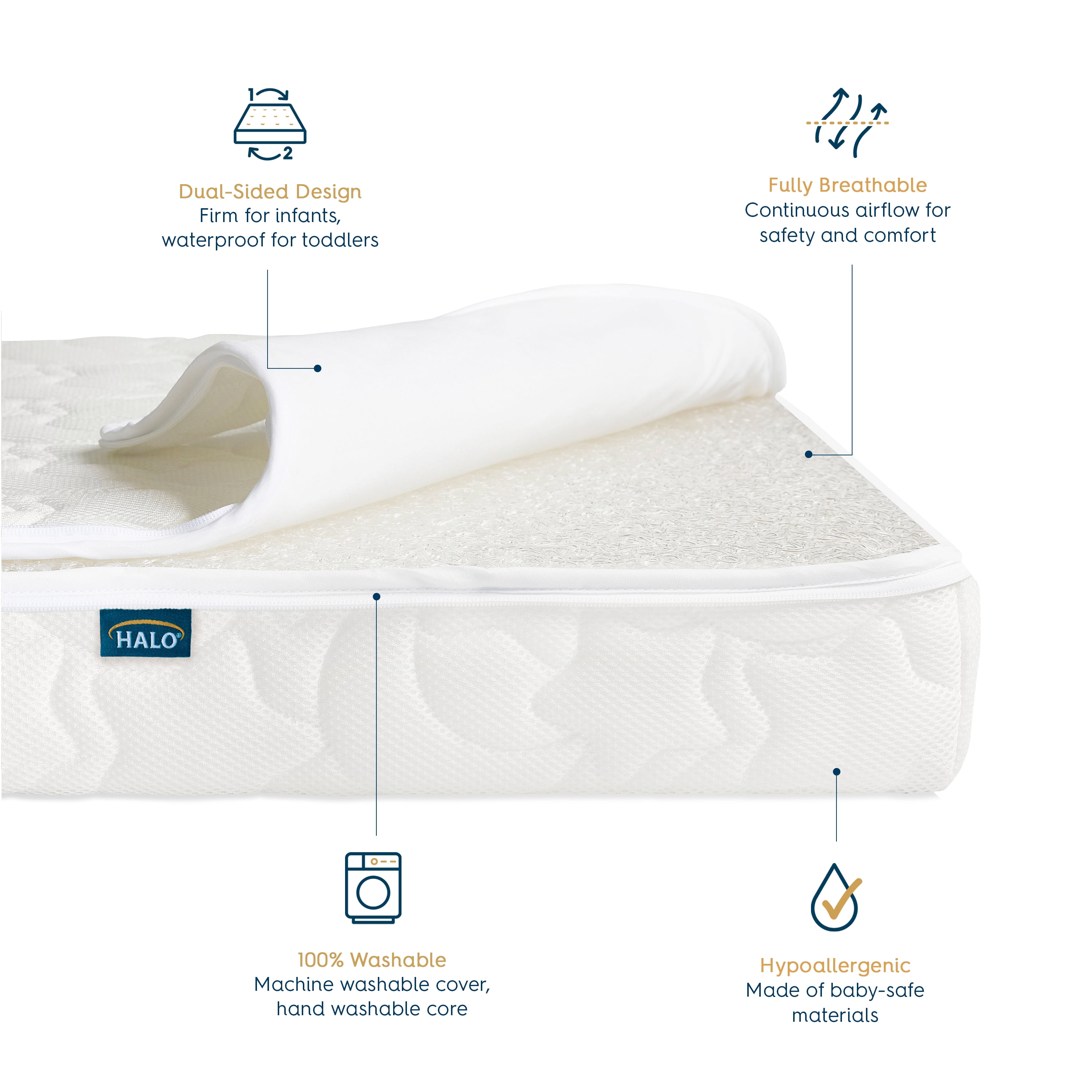 Breathable crib mattress for safer sleep GREENGUARD Gold certified Hypoallergenic; gentle on baby’s skin 100% washable for when accidents occur 2-stage design; infant side and waterproof toddler side Eco-friendly; 100% recyclable after use Can be used with or without a crib sheet Fits standard size cribs and toddler beds: 52” x 28” x 4.5 For ages 0 to 4 years old Cover: 72% polyester, 27% rayon, 1% spandex Cover: 100% polymer Imported