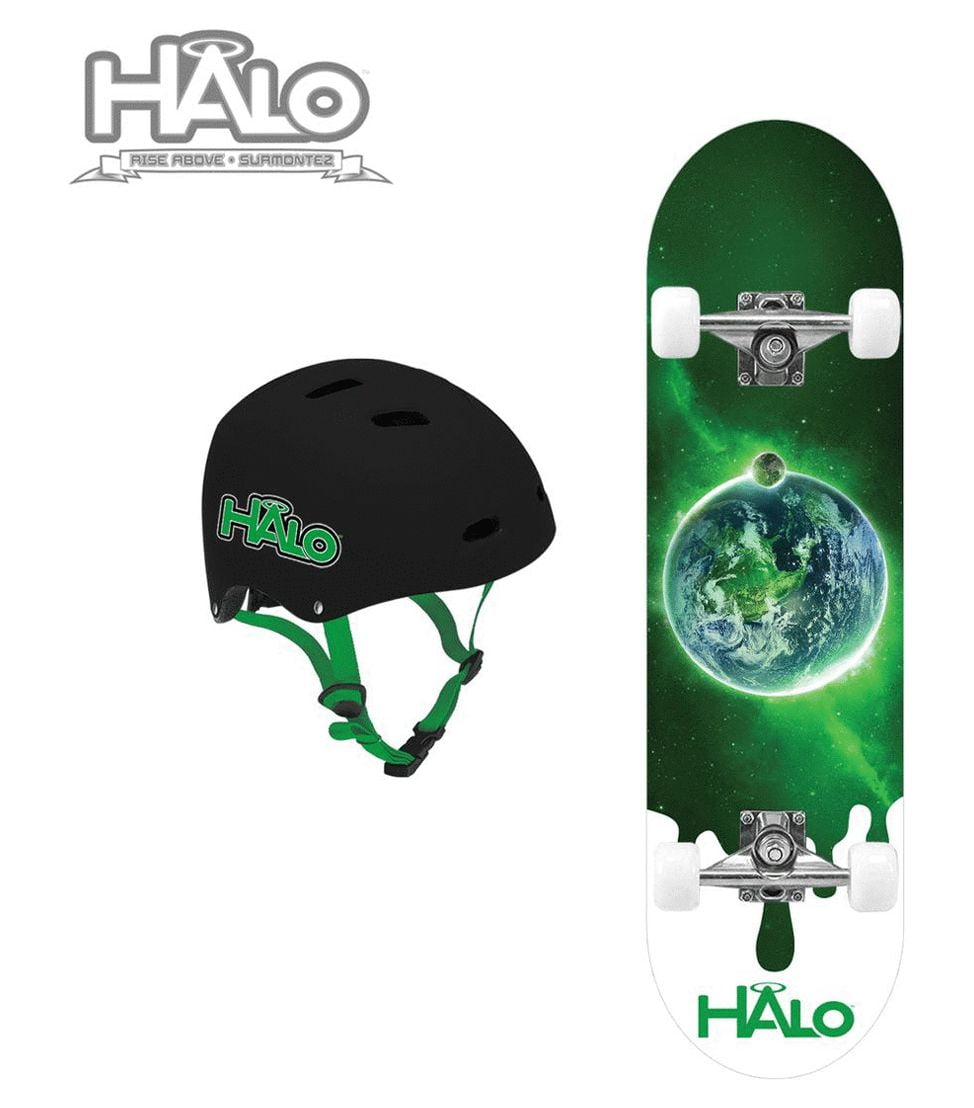 HALO Pro Skateboard Combo – Green 1 Pro Maple Wood Skateboard with Double Kick Tail and Green World graphics 1 Size Adjustable Multi-Sport Helmet with Black Shell and Green Straps