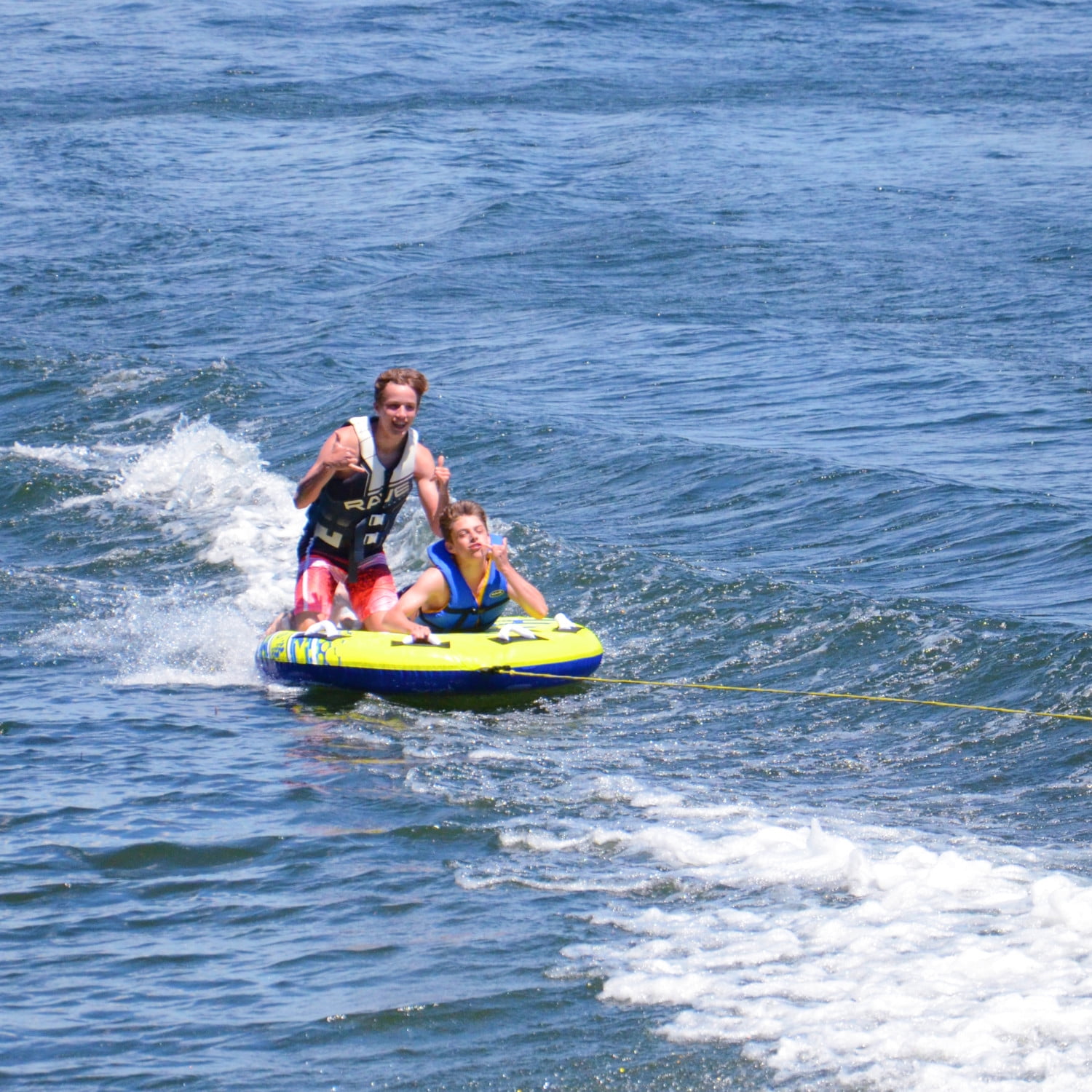 2 Rider Towable 340 lbs. (15 Kg) max rider weight Heavy duty 24 gauge PVC bladder. 54” x 9” (137cm x 23cm) inflated. 57” (145cm) deflated. Heavy duty 24 gauge PVC bladder. Durable 420D Nylon cover. 4 handles. Quick connect tow point.