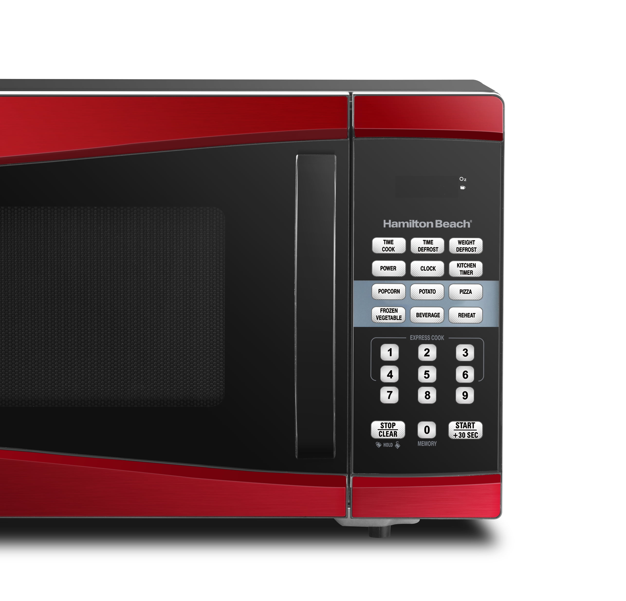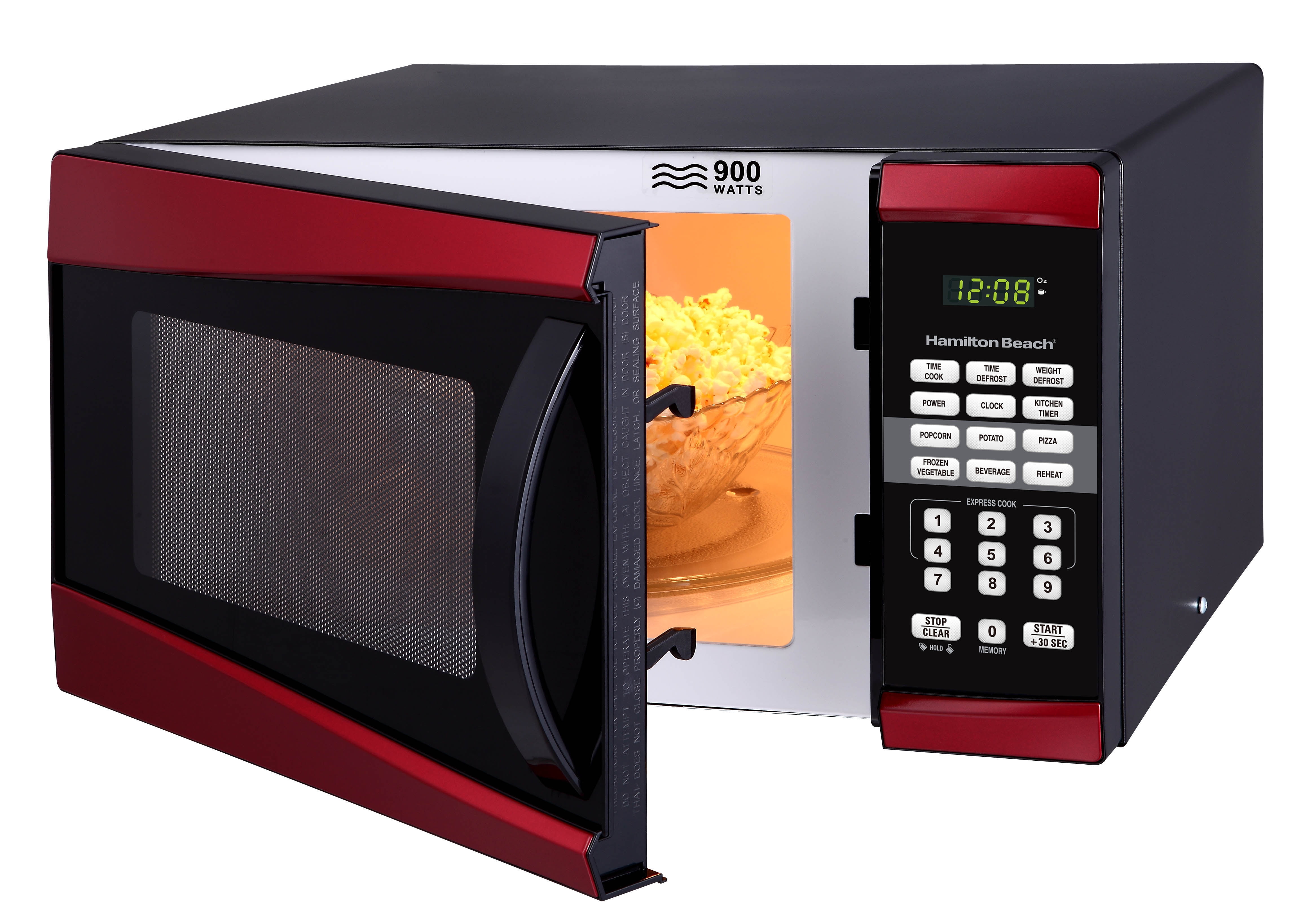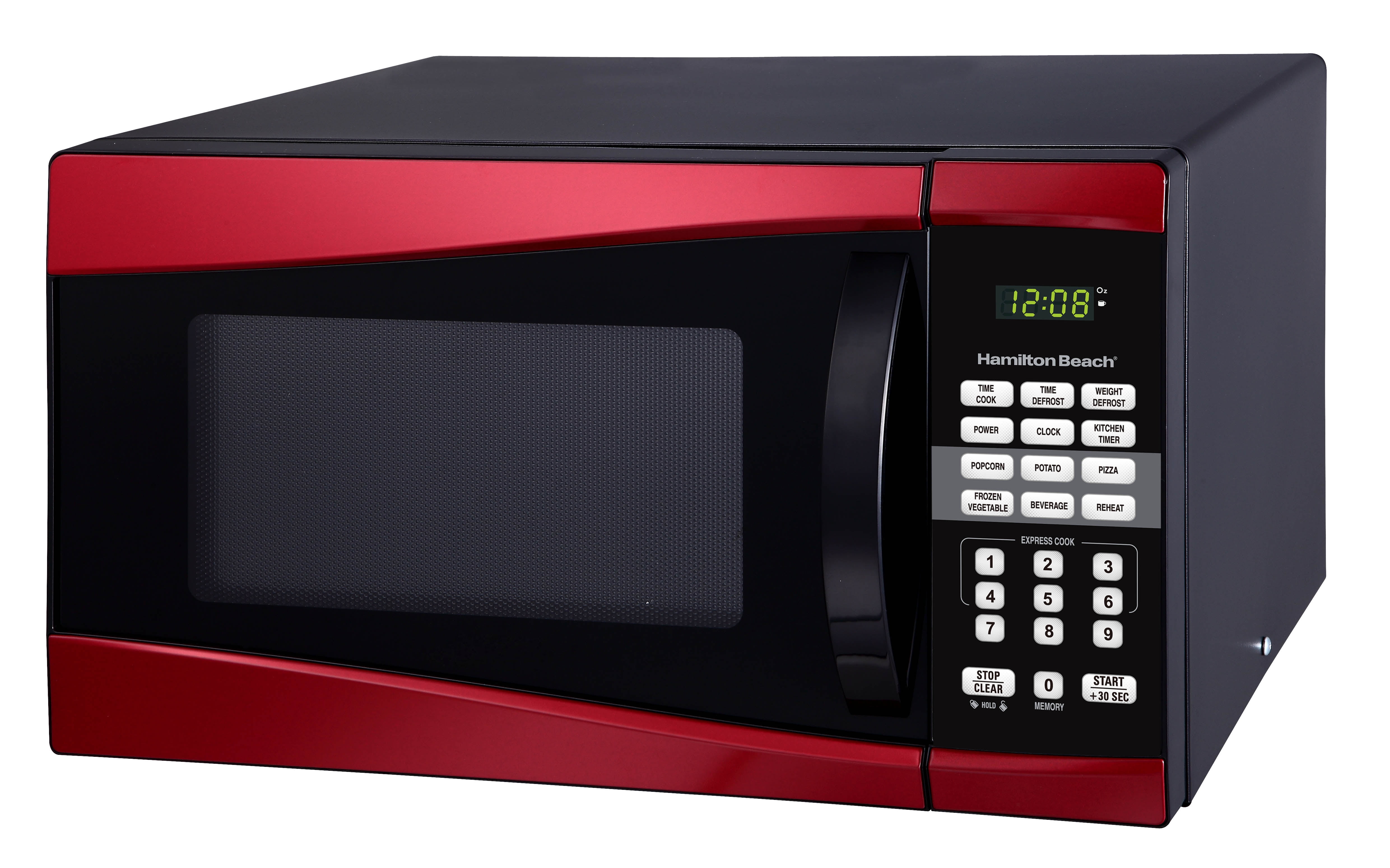 Hamilton Beach 0.9 cu ft 900W Microwave, Red: 0.9 cu ft digital microwave 900W 10 microwave power levels One-touch cooking features: popcorn, potato, reheat, frozen dinner, beverage and pizza 99’99” minute timer Child safety lock Digital clock Handle door Product dimensions with handle: 19.11″L x 15.96″W x 11.54″H