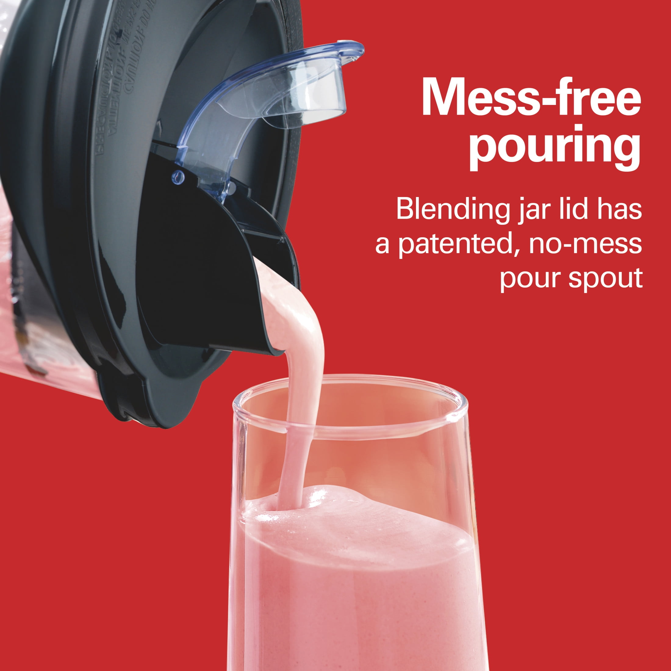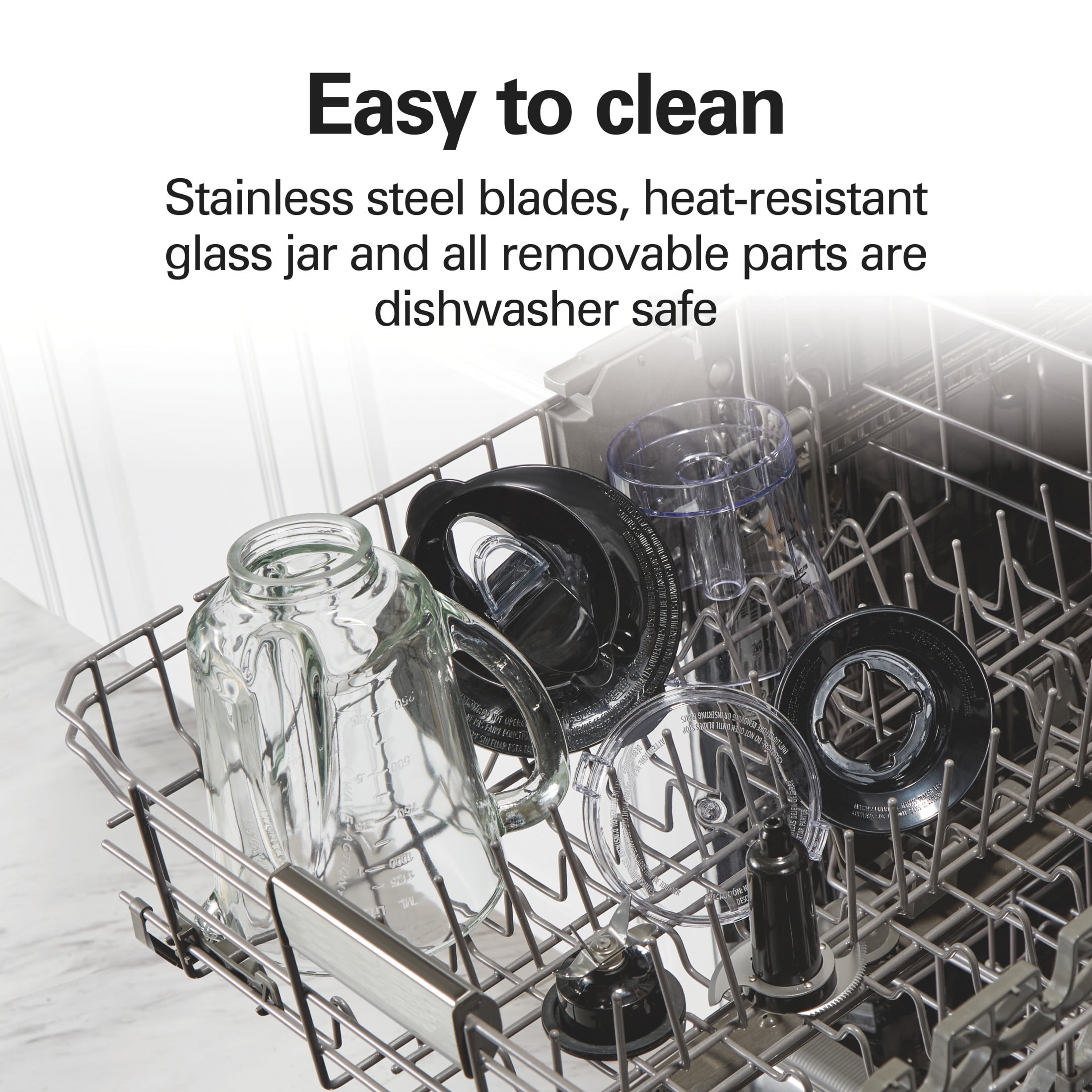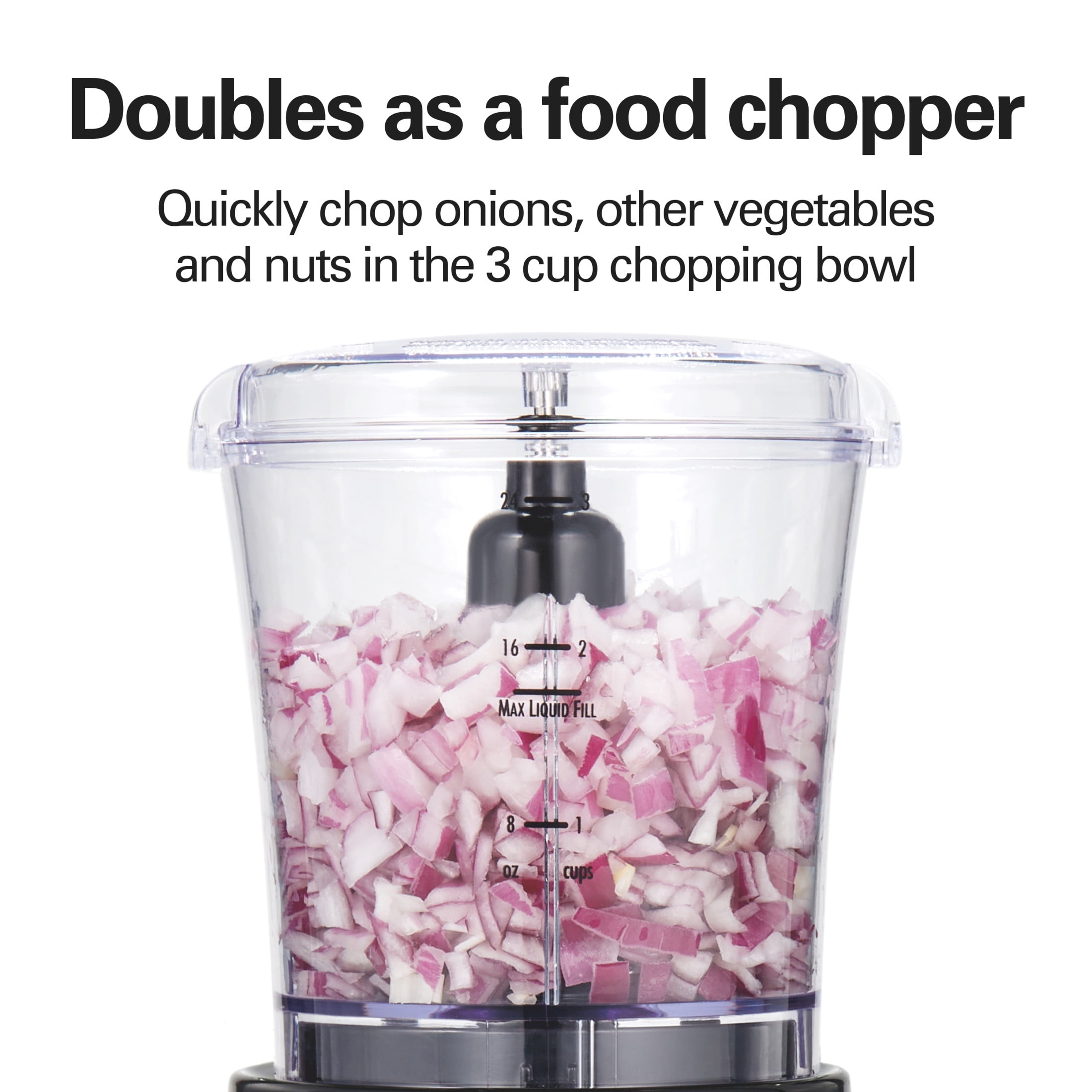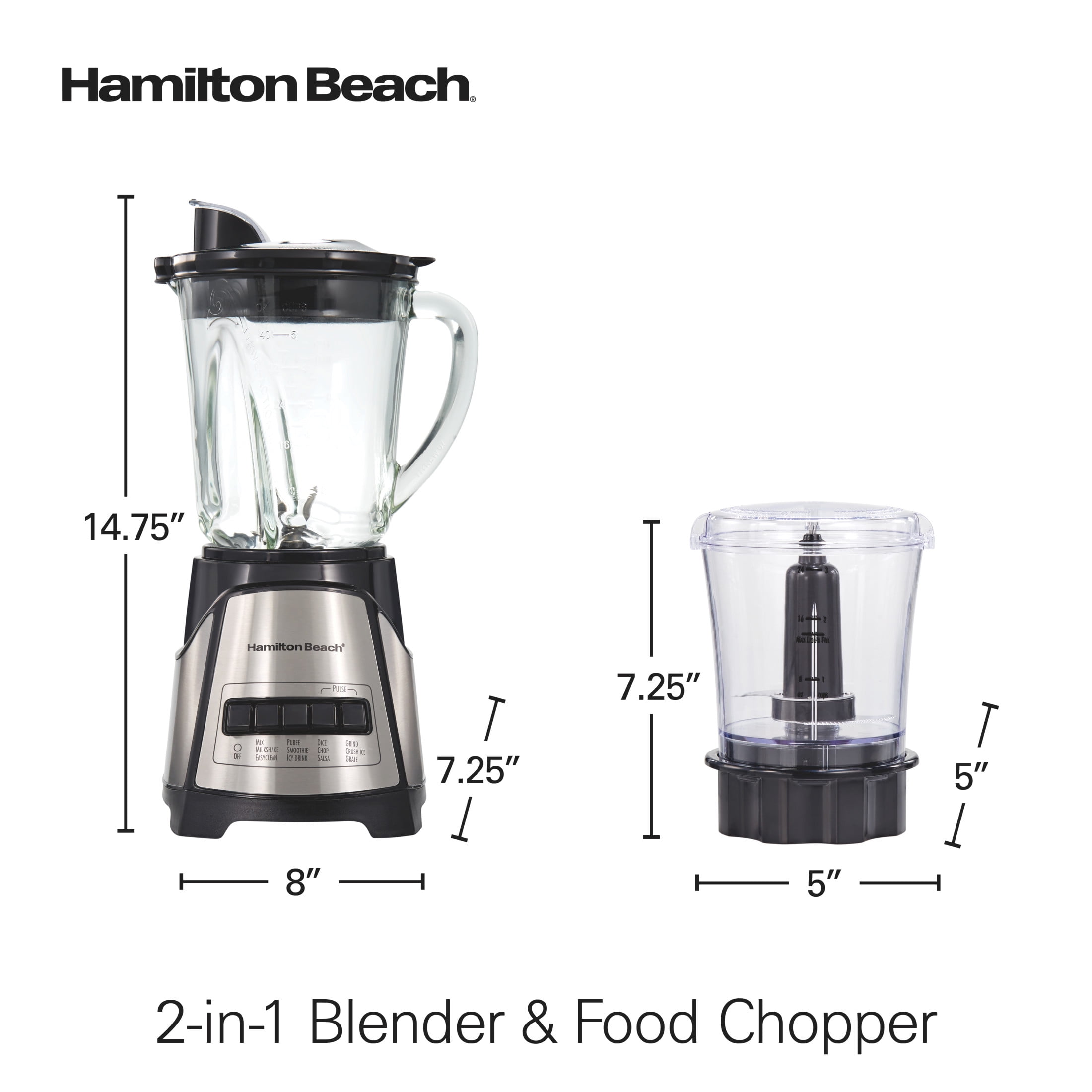 Save space in the kitchen with the versatile Hamilton Beach® 2-in-1 Blender and Food Chopper. It comes with a 40 oz. glass blending jar and 3 cup food chopper for tackling everyday kitchen tasks from blending smoothies and protein shakes to chopping nuts and onions. It has a powerful motor with 700 watts of peak power that effortlessly crushes ice and other tough ingredients. It’s great for making smoothies, shakes and other ice-cold drinks. The patented Wave~Action® System continuously forces ice and ingredients into the stainless steel blades, so smoothies and shakes come out rich and creamy every time. The blending jar features a lid with a patented, no-mess pour spout designed to eliminate drips and spills. Quickly swap out the blending jar for the 3 cup food chopper to complete simple food prep tasks like chopping nuts and vegetables. It’s also great for making homemade salsa, dressings and sauces. The blender with food chopper has 12 blending functions and simple, intuitive controls. The removable stainless steel blending and chopping blades, the heat-resistant glass jar and all removable parts are dishwasher safe. This durable blender and food chopper is backed by Hamilton Beach with a 3 year limited warranty.