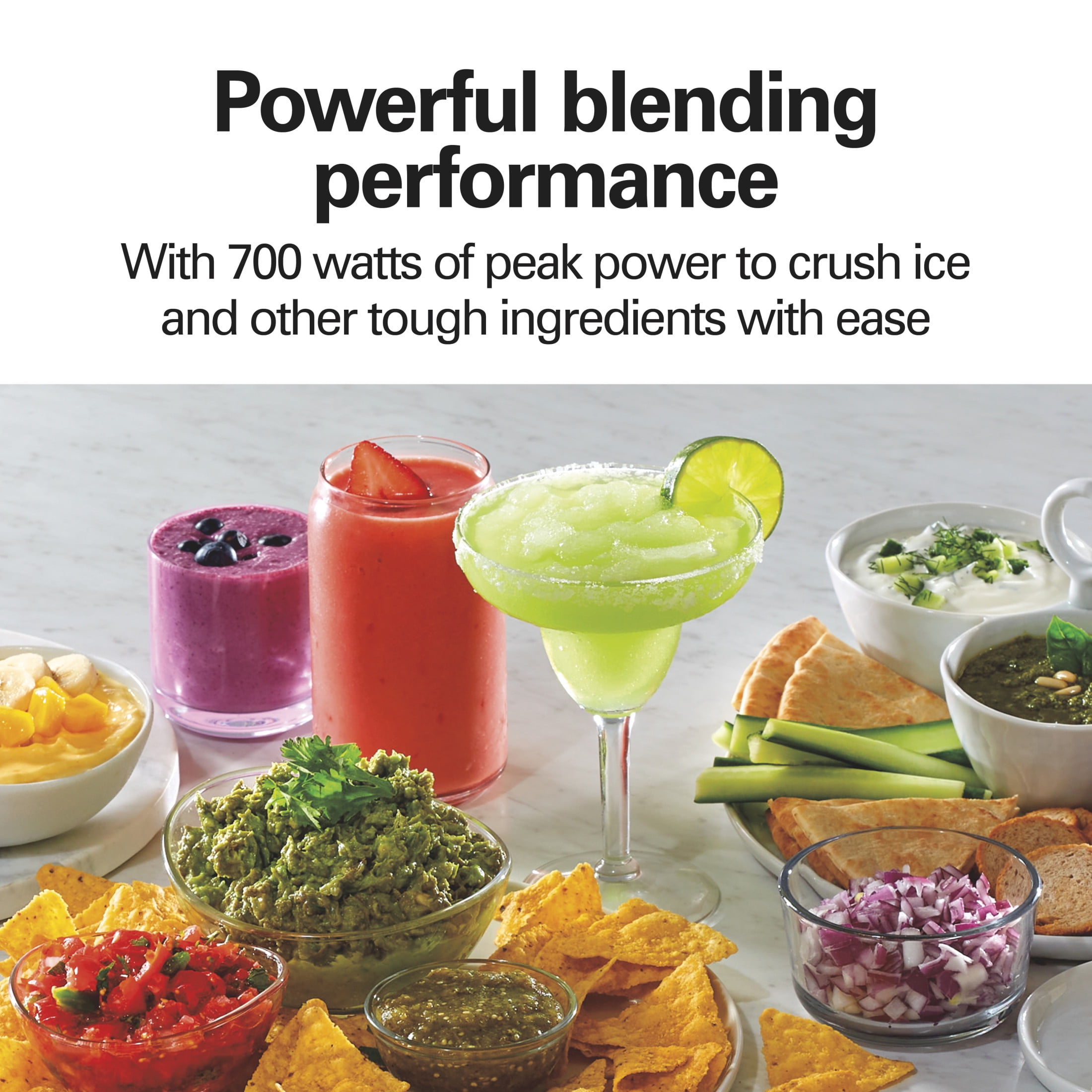 2 appliances in 1 Blender – 5 cup glass jar – Revolutionary Wave-Action® system continuously pulls mixture down into the blades for smooth results every time – No more ice chunks – 700 Watt peak power – Mess-free spout – Backed by a 3 year warranty Chopper – 3 cup chopping bowl – Great for vegetables, nuts, salsa, dressings and sauces – Dishwasher safe containers – 2 speeds plus pulse – Cord storage – Stainless steel blades Flip-top pour spout Pulse control