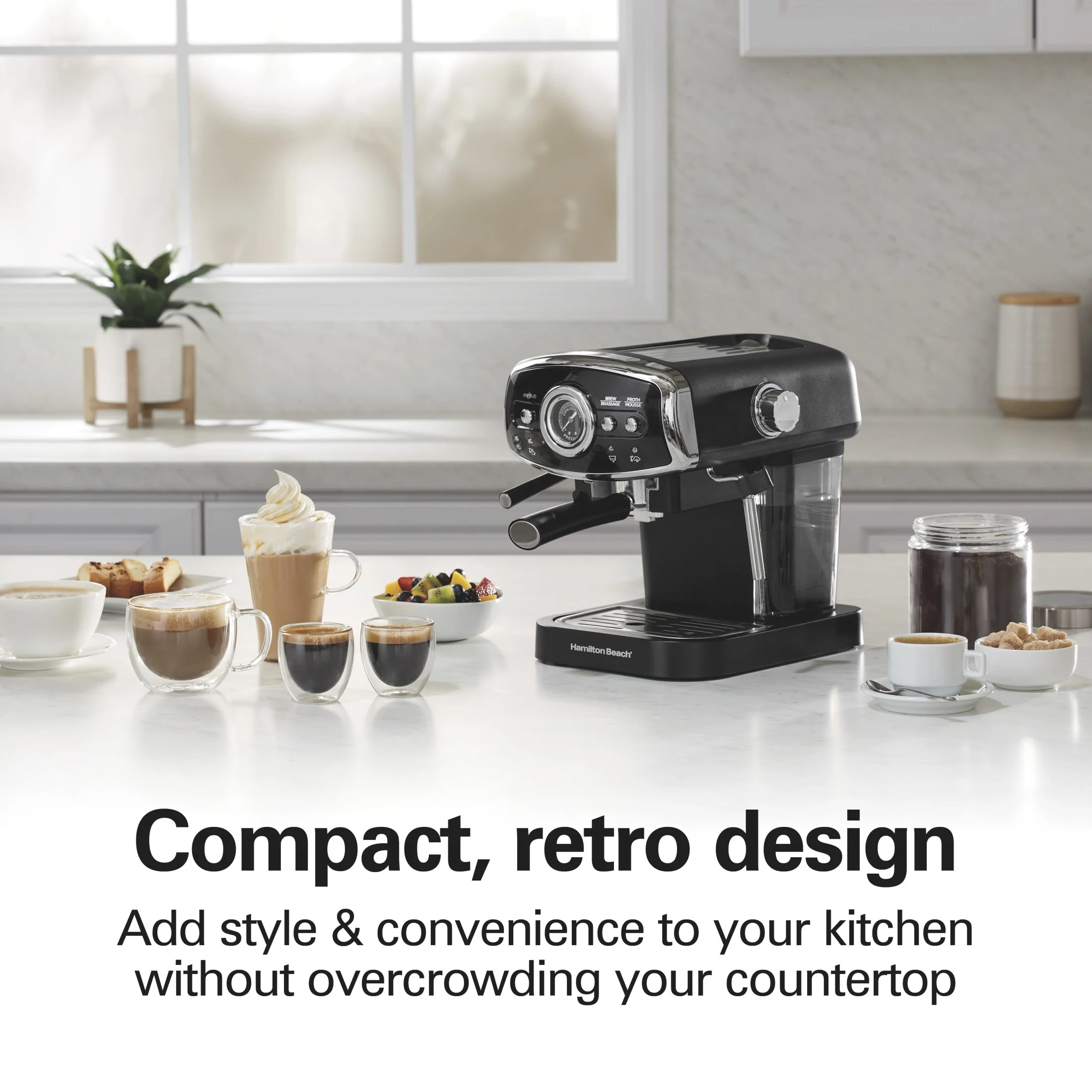 Hamilton Beach 15-Bar, 2 Cup Espresso Machine, Slide & Lock Espresso Maker with Milk Frother, Black & Chrome