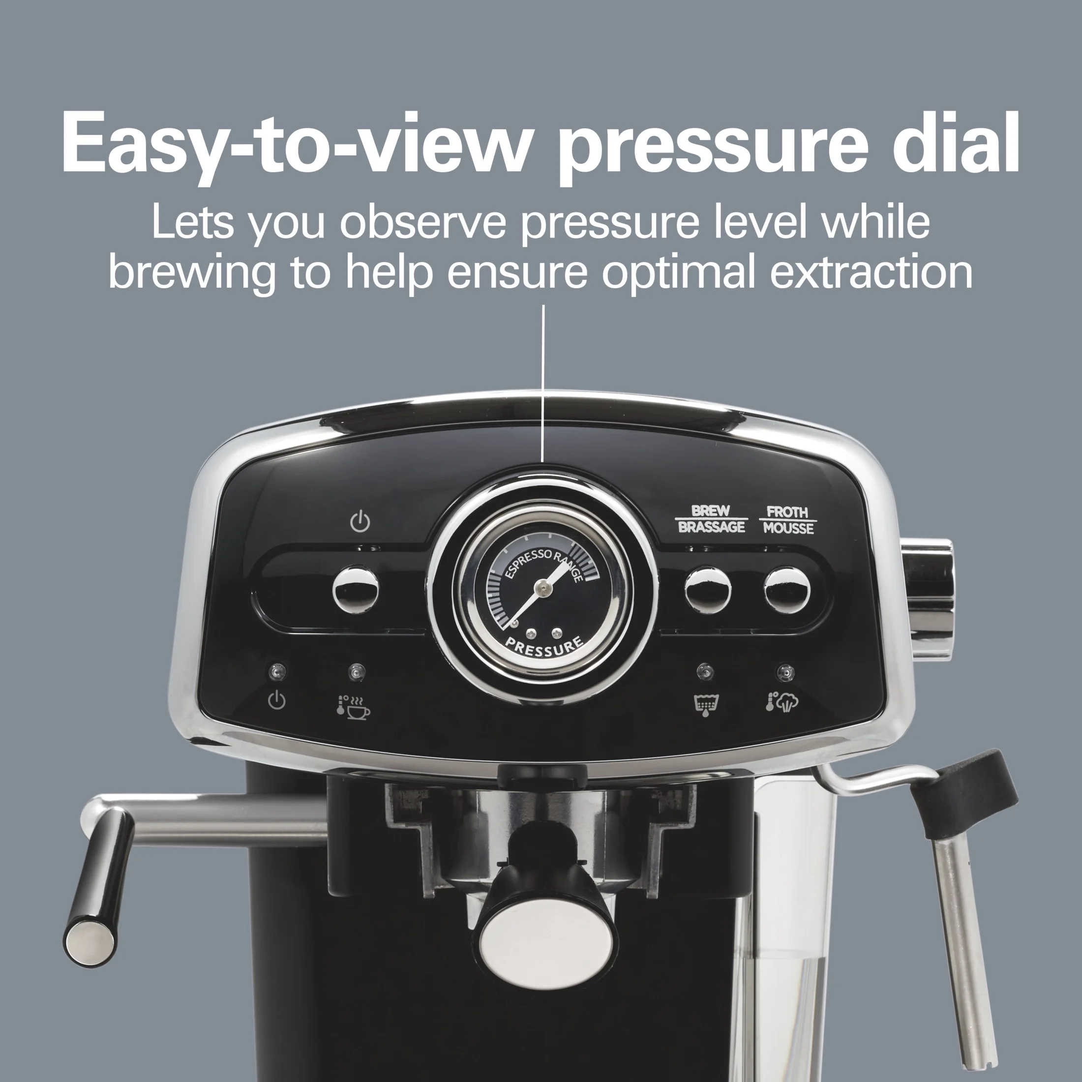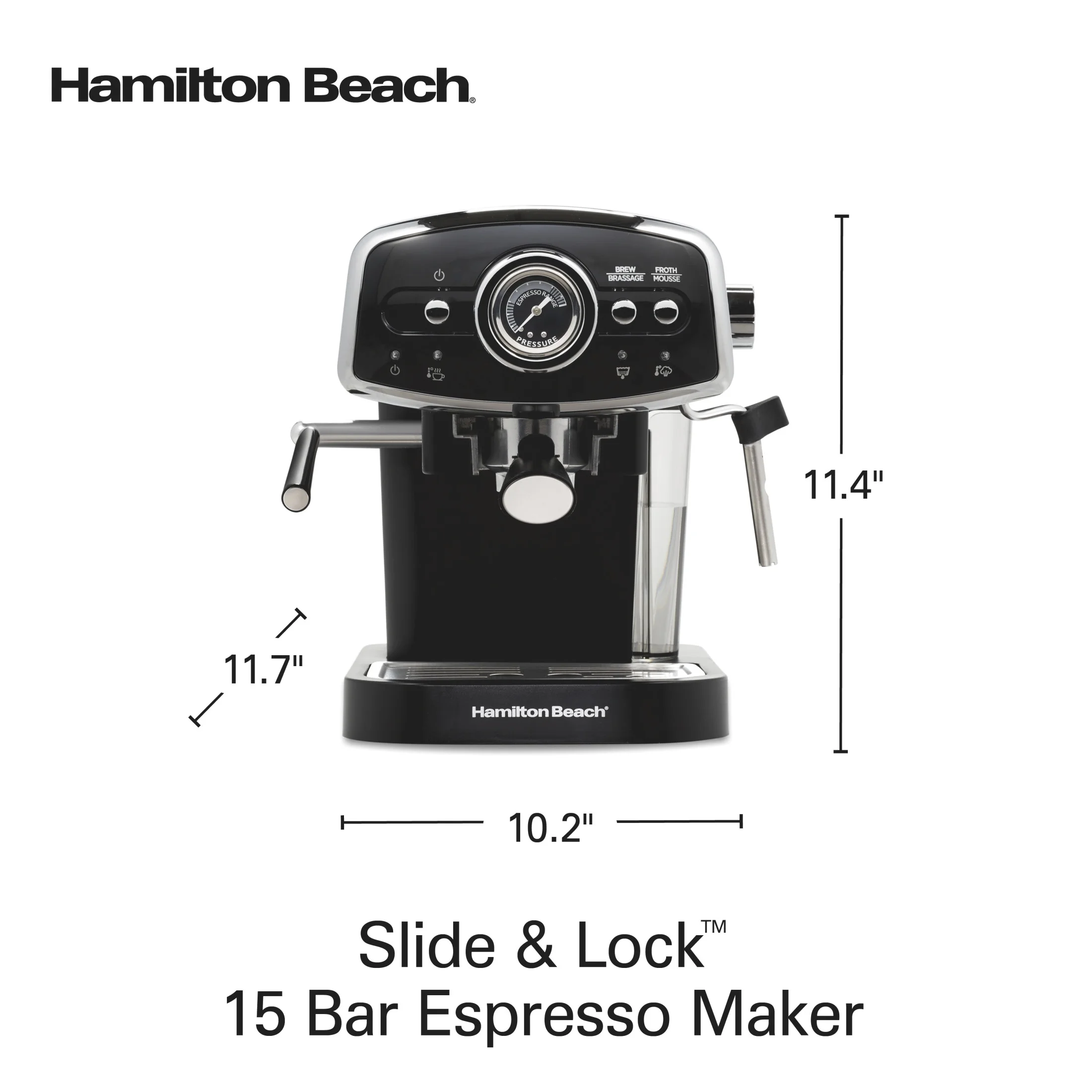 Hamilton Beach 15-Bar, 2-Cup Black Chrome Espresso Machine PATENTED SLIDE & LOCK™ PORTAFILTER MAKES BREWING A BREEZE: Easily slide the portafilter in place from the front and lock it on the side, eliminating the hassle of hard-to-access brew heads AUTHENTIC CAFÉ TASTE: The powerful 15 bar pump fully extracts espresso’s flavor, delivering an authentic café taste with silky crema and quality results every time Brew 2 shots of espresso simultaneously with dual portafilter spouts EASY-TO-VIEW PRESSURE DIAL: The front-facing pressure dial allows you to monitor the pressure level during brewing, ensuring optimal extraction and boosting your confidence in making perfect espresso FROTH, FOAM OR STEAM MILK WITH EASE: Create authentic cappuccinos, lattes, and macchiatos with the built-in swiveling frothing wand and adjustable steam dial for the perfect amount of light, airy foam CUSTOMIZED ESPRESSO SHOTS: Adjust espresso shot volumes for one or two shots to your preference, and easily turn off the machine when your desired amount is reached