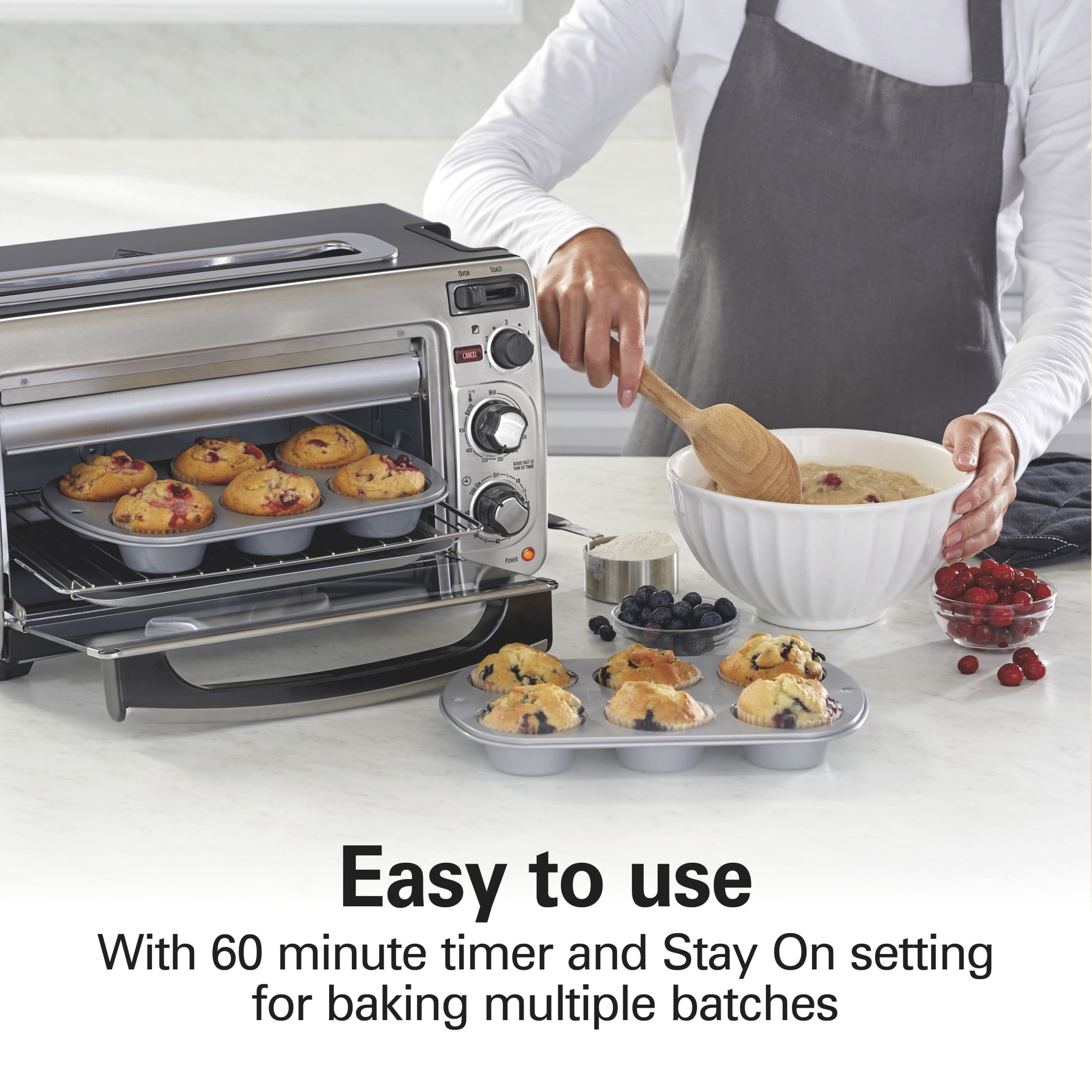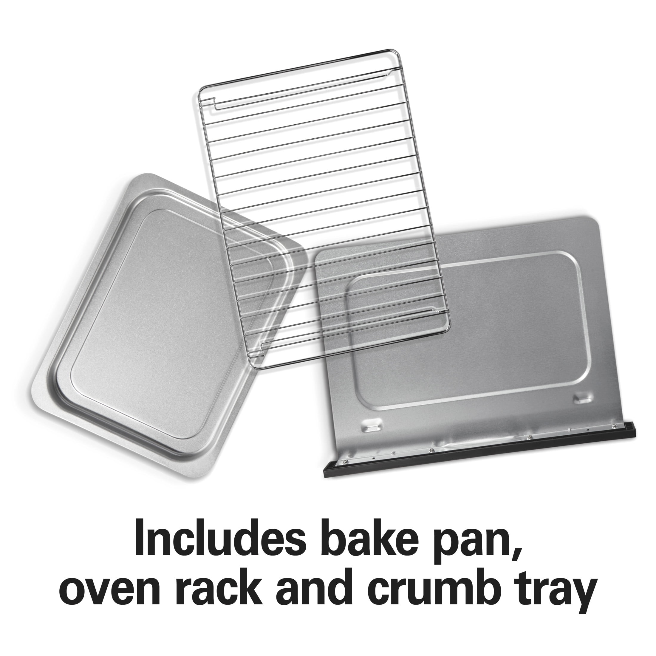 Unclutter your counter with the Hamilton Beach 2-in-1 Oven and Toaster. This unique combo lets you cook up to 9″ pizzas with a tender, crispy crust and toast bread evenly in 40% less time than a traditional toaster oven. With the simple slide of a lever, switching from the extra-wide slot toaster to the spacious oven is easy, making it perfect for the morning breakfast rush or busy weeknight dinner. Bake, broil, or toast—this 2-in-1 appliance gives you the flexibility to cook a variety of foods. Set the temperature and timer to your exact specifications using the easy-to-turn knobs. The auto shutoff gives you peace of mind that your food won’t overcook once the time is up—or use the stay-on setting for batch cooking and more. You don’t have to turn the oven upside down to remove crumbs—the crumb tray slides out easily from the front.