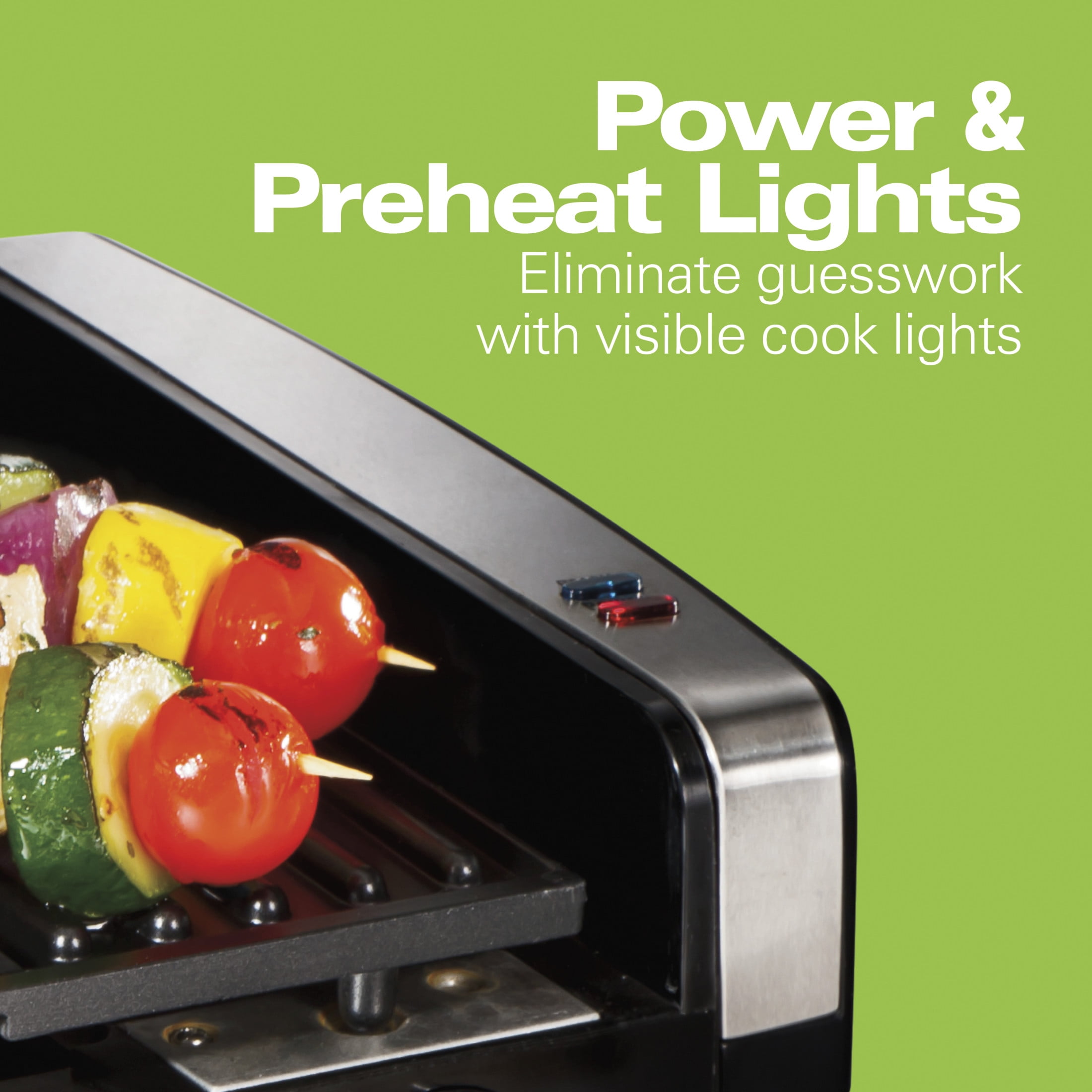 EASY TO CLEAN: Indoor grill hood, plate, and drip tray are removable and dishwasher safe. NONSTICK COOK PLATE: Plate is removable and dishwasher safe, so there’s no more endless scraping to clean your indoor electric grill. ENJOY GRILLING ALL YEAR LONG: This indoor grill with hood has a high searing heat that locks in juices and flavors, and lid closes to give you signature grill marks. INSTANT GRILL MASTER: Sear at 450 degrees or use adjustable temperature dial to grill at lower heat. POWER & PREHEAT LIGHTS: Eliminate guess work while using your electric grill with easy-to-read lights.